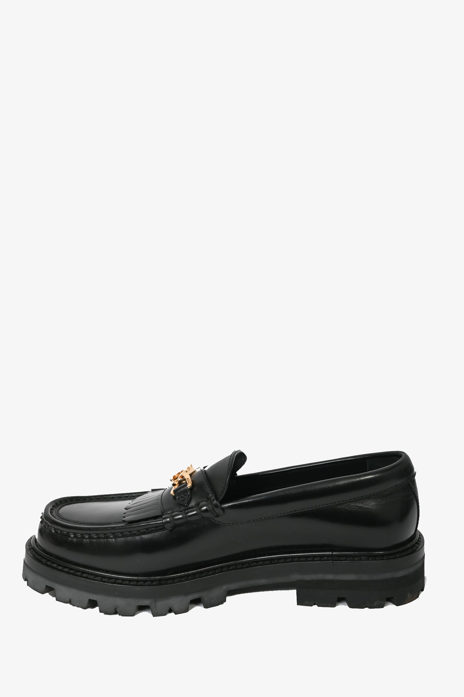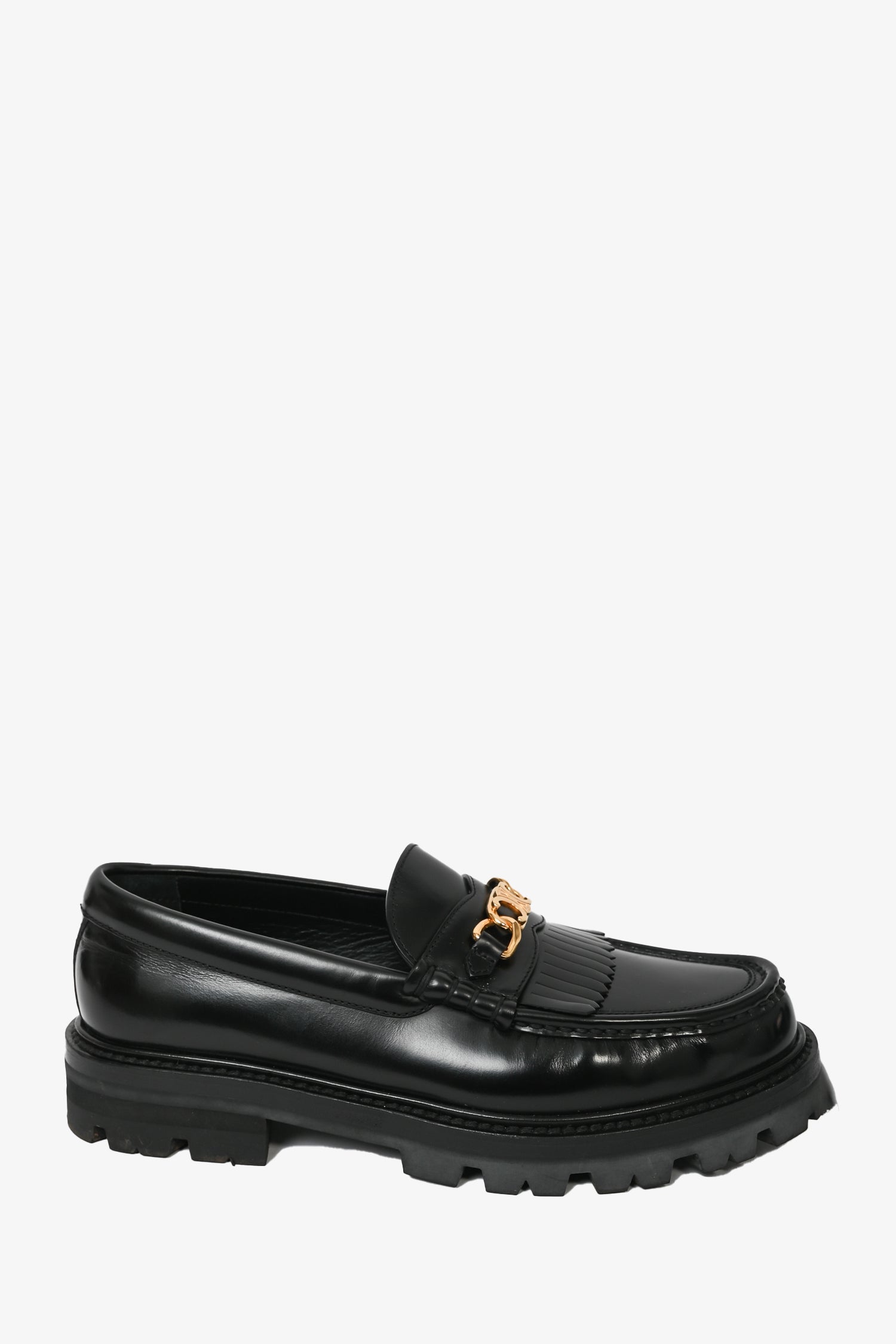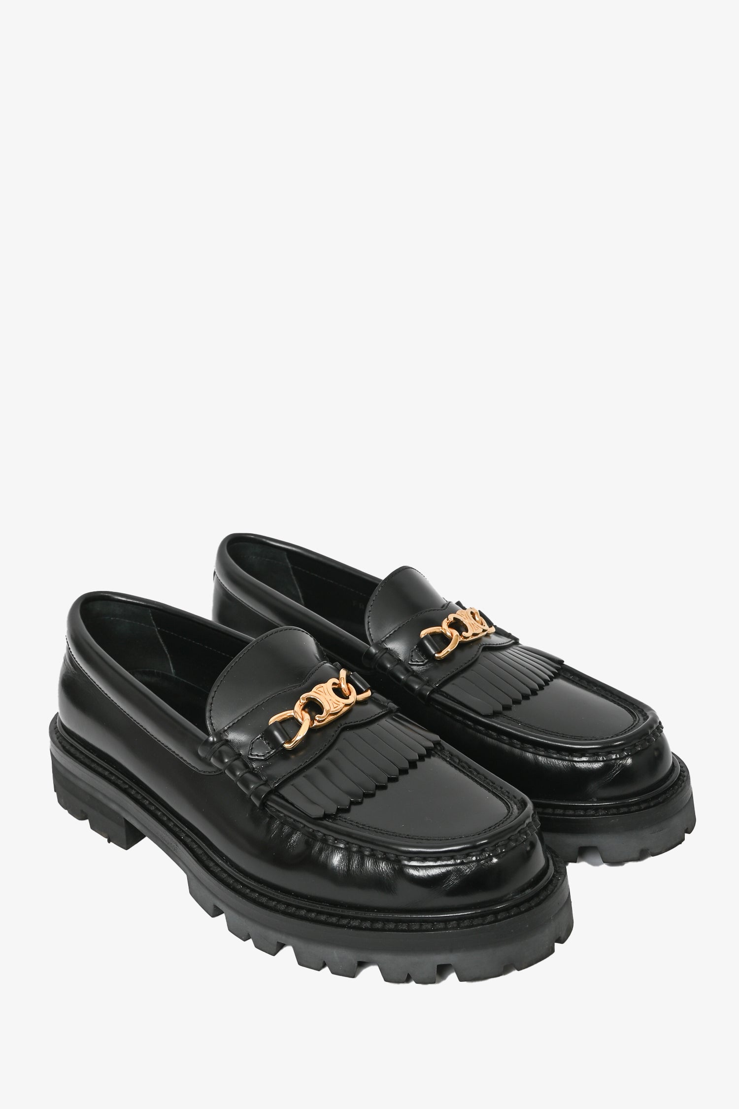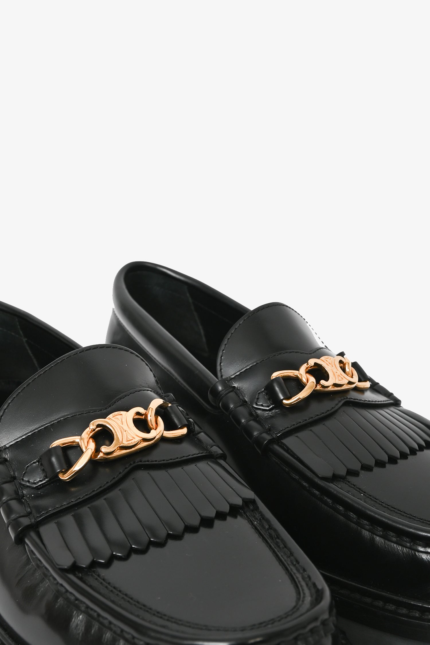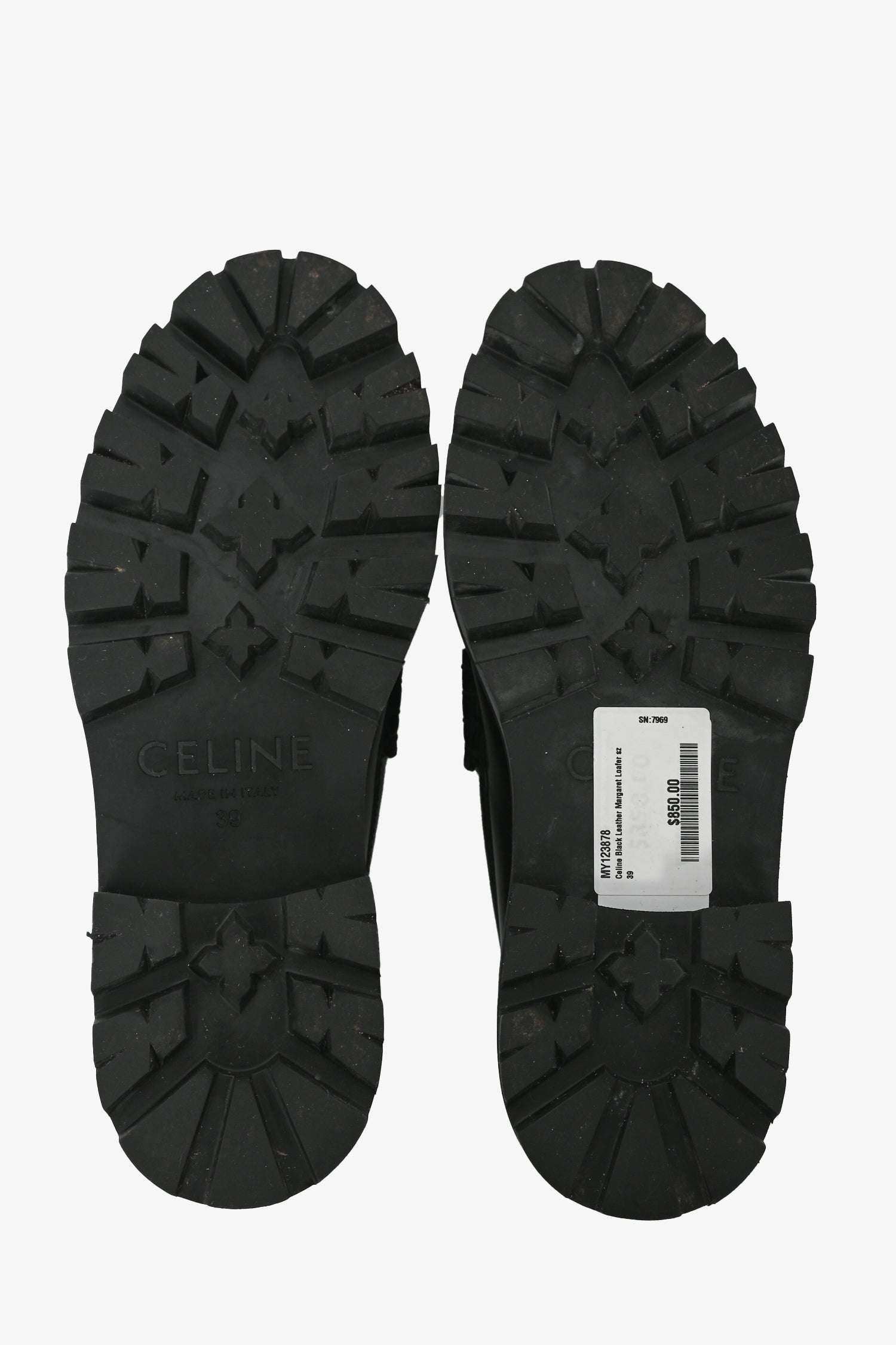 Celine Black Leather Margaret Loafer. Triomphe logo. Gold-tone hardware. Slip-on. Round toe. Tonal stitching.