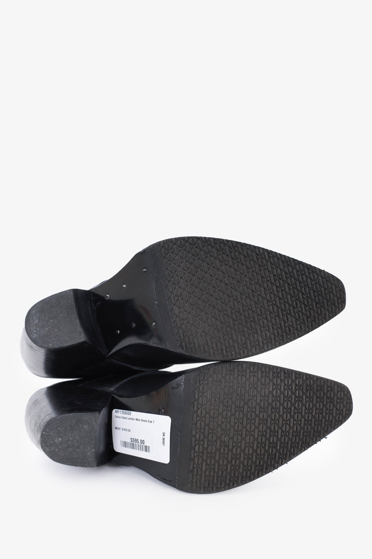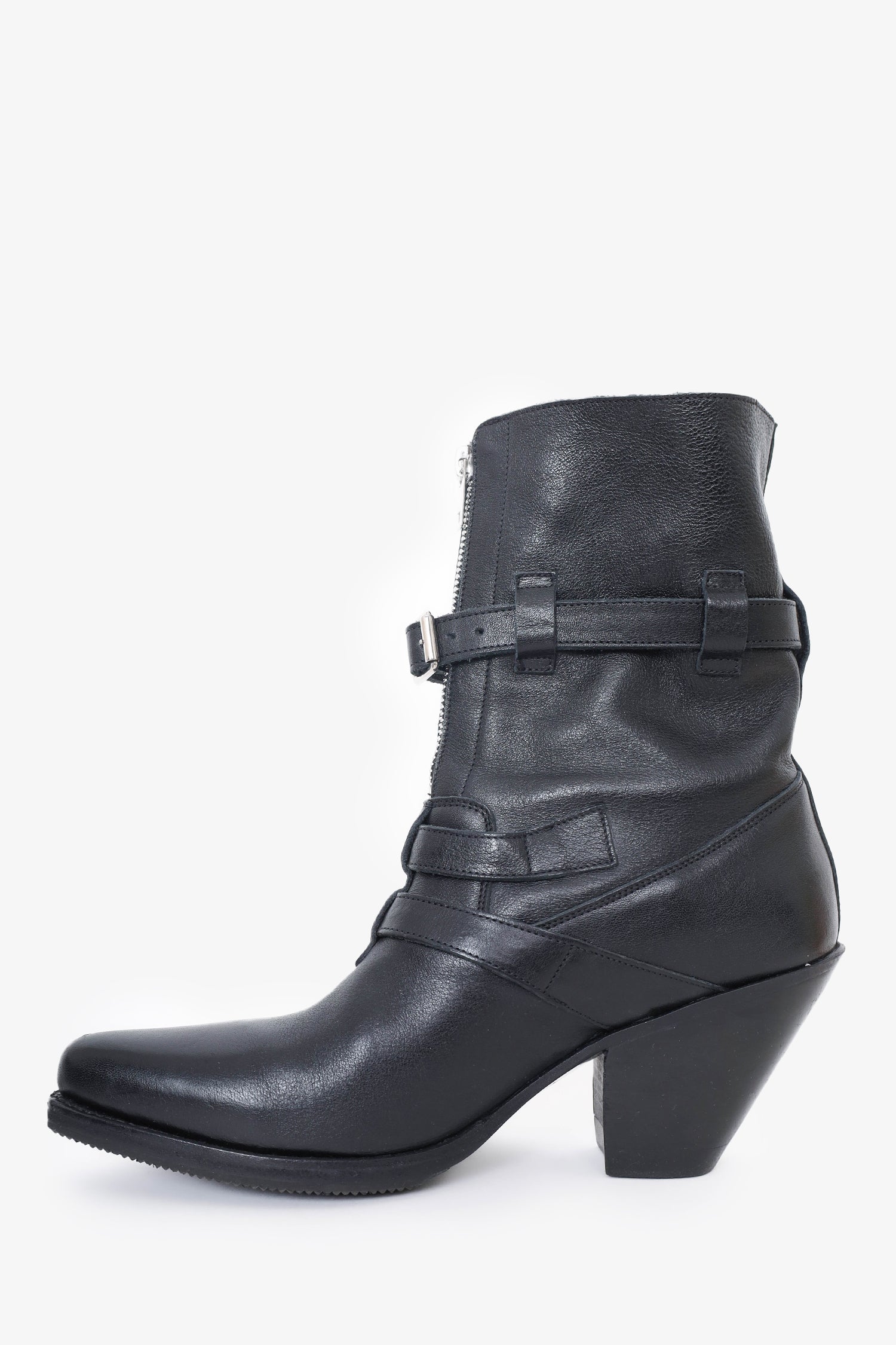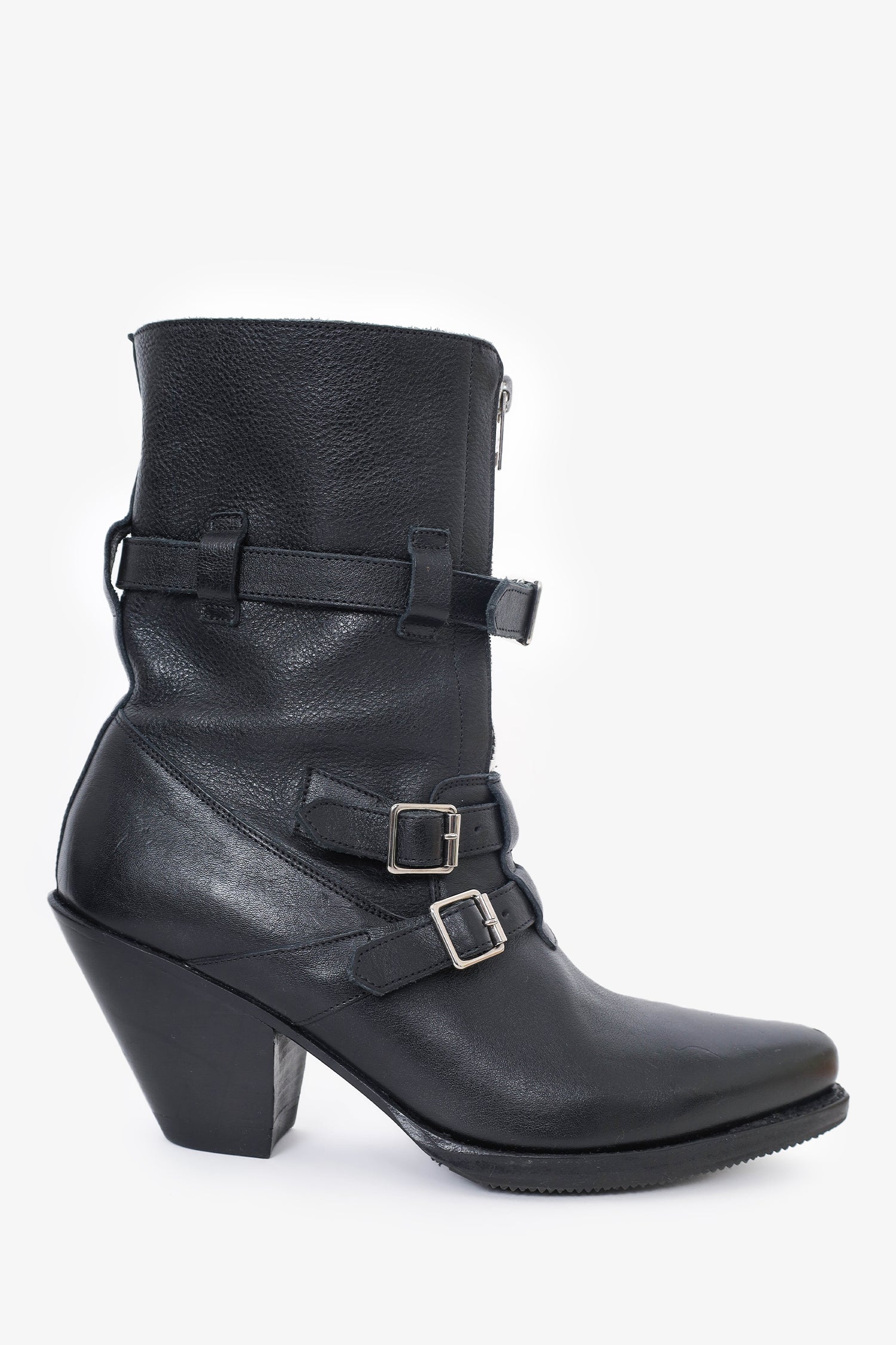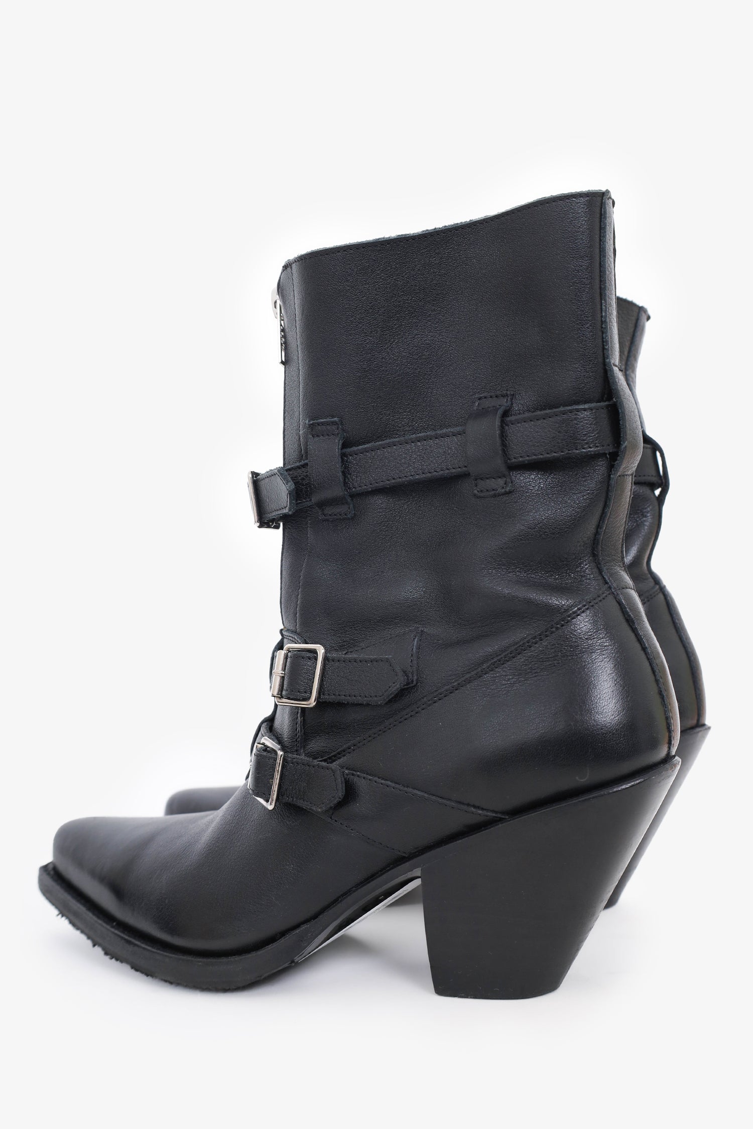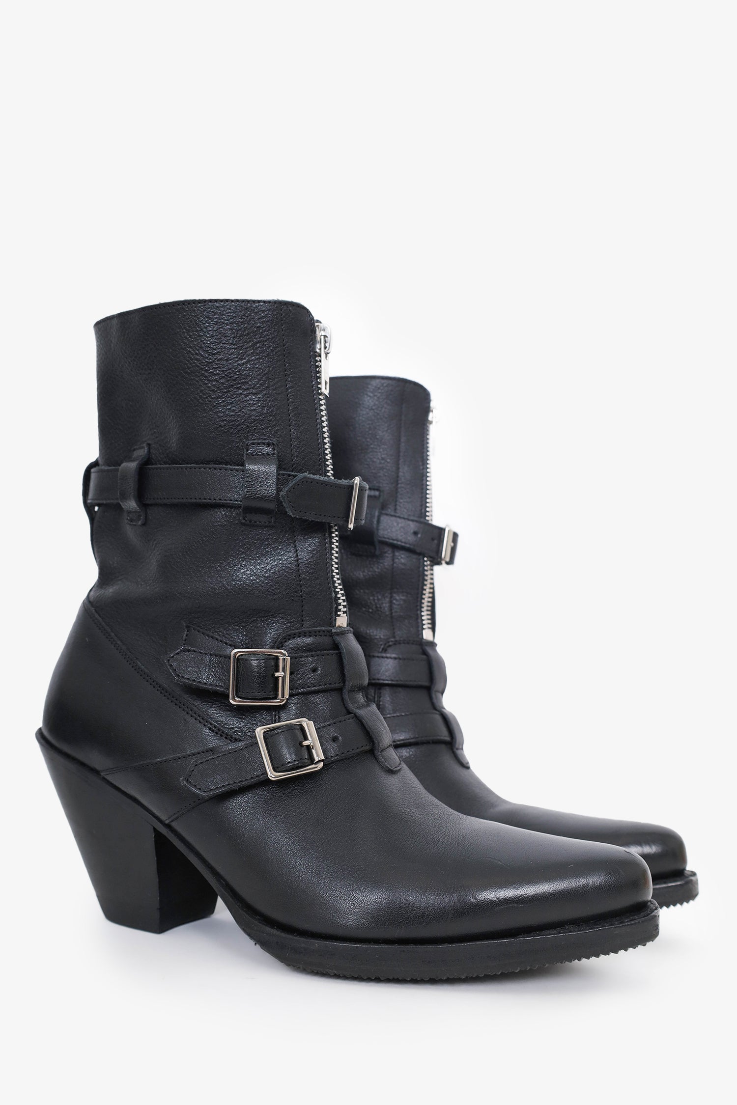Refresh availabilityCeline Black Leather Moto Boots. Front zip closure with adjustable pull-through buckle opening. Pointed toe. Silver-tone hardware. Tonal stitching.