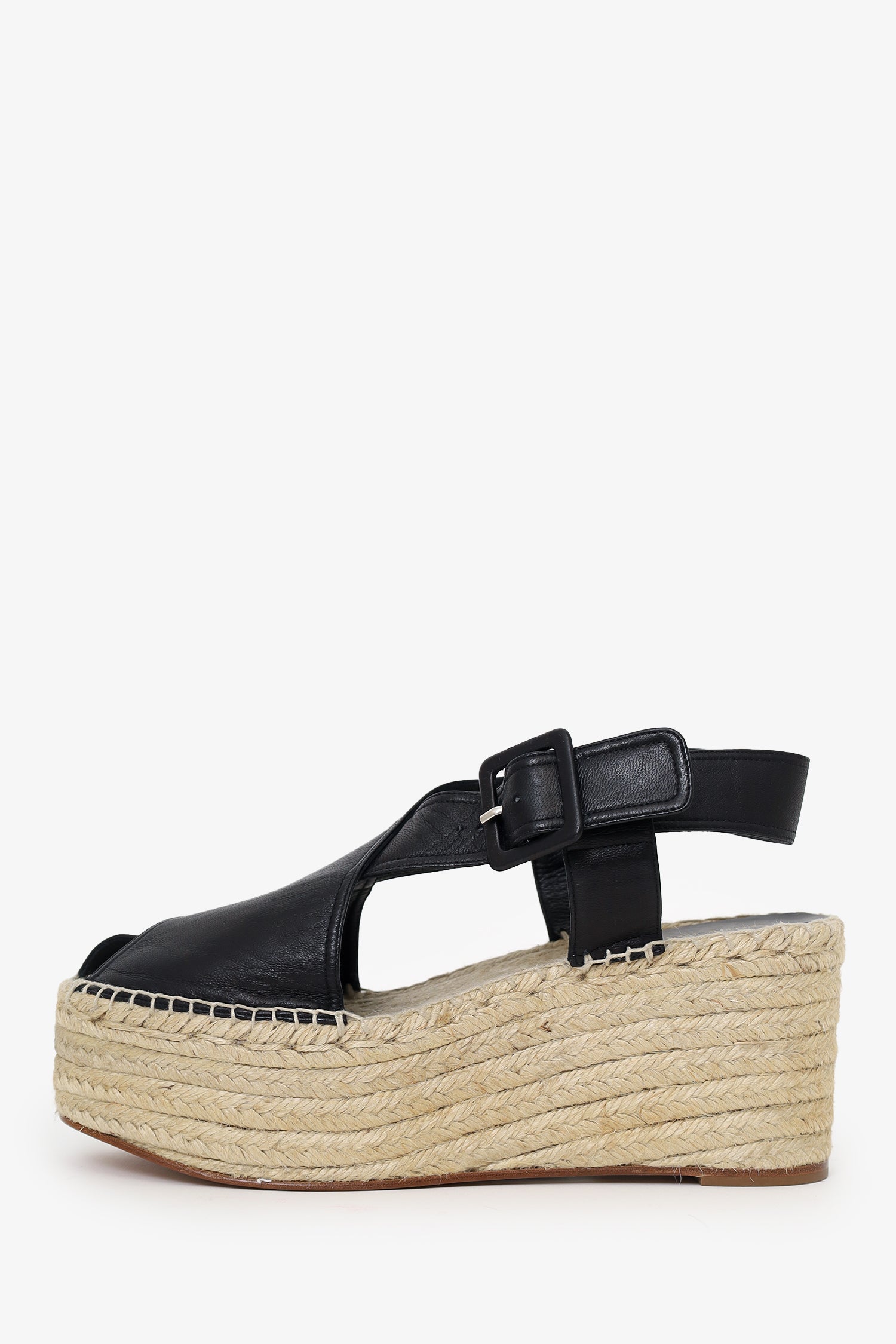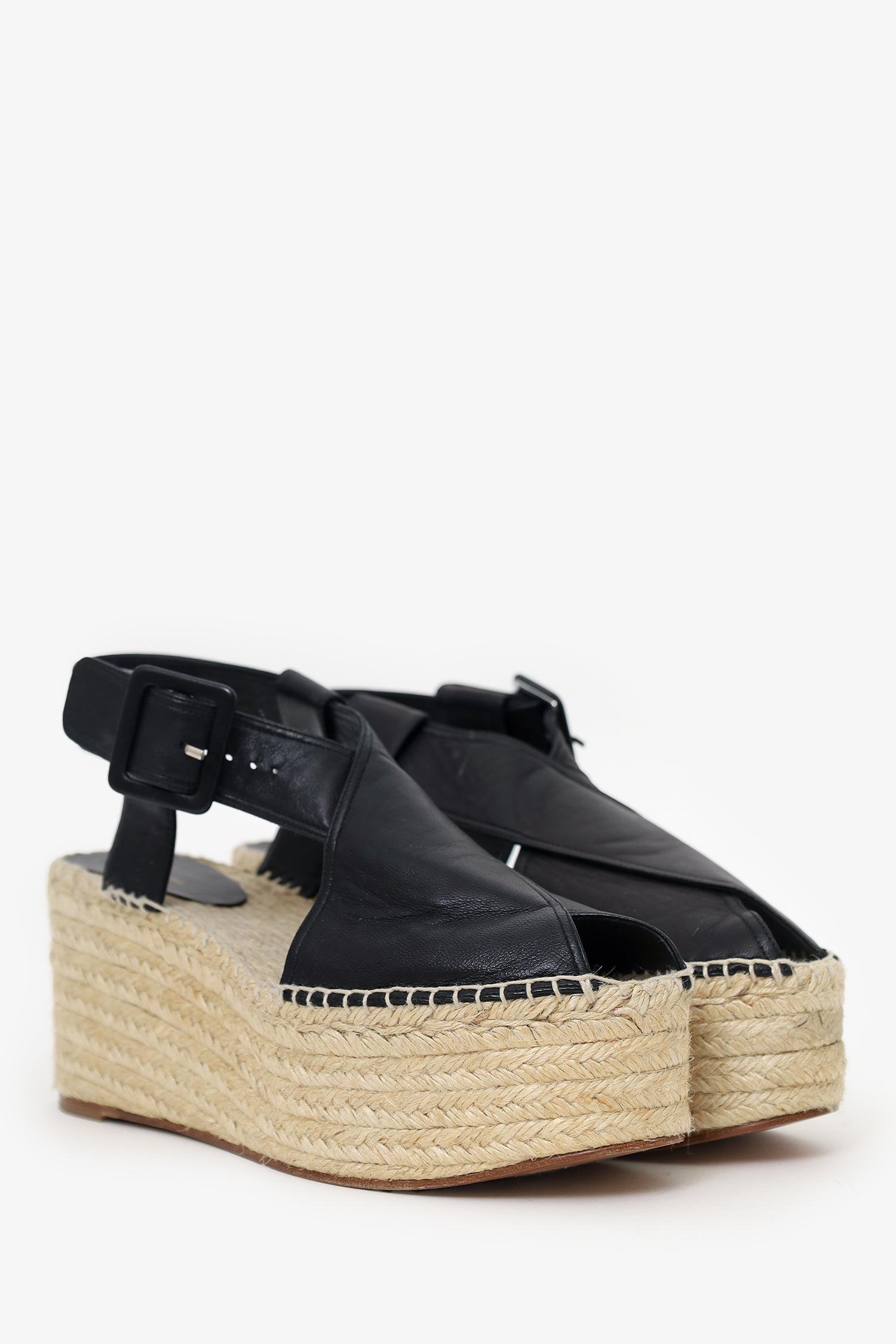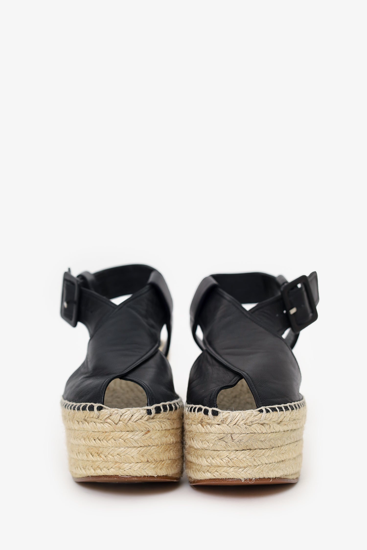 Refresh availabilityCeline Black Leather Peep-Toe Buckle Espadrille Wedges. Slip-on. Front rounded peep-toe. Slingback with adjustable pull-through closure. Tonal stitching.