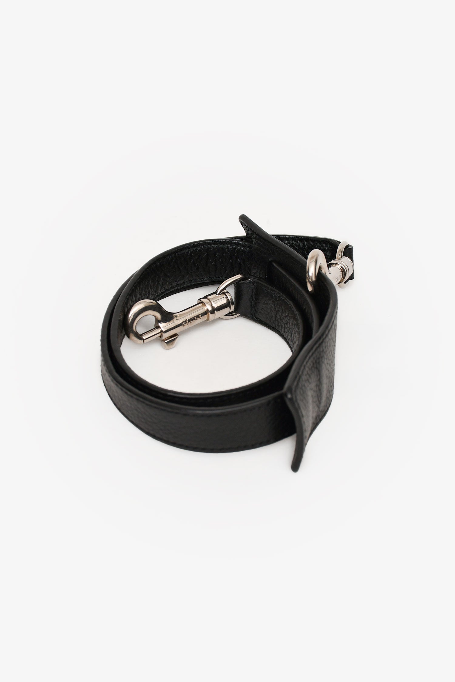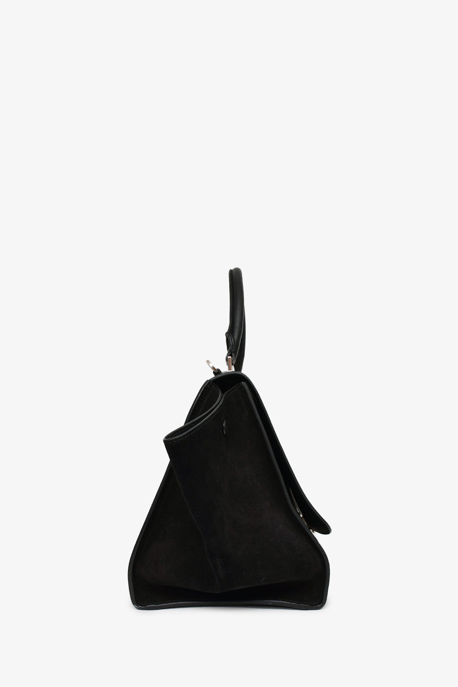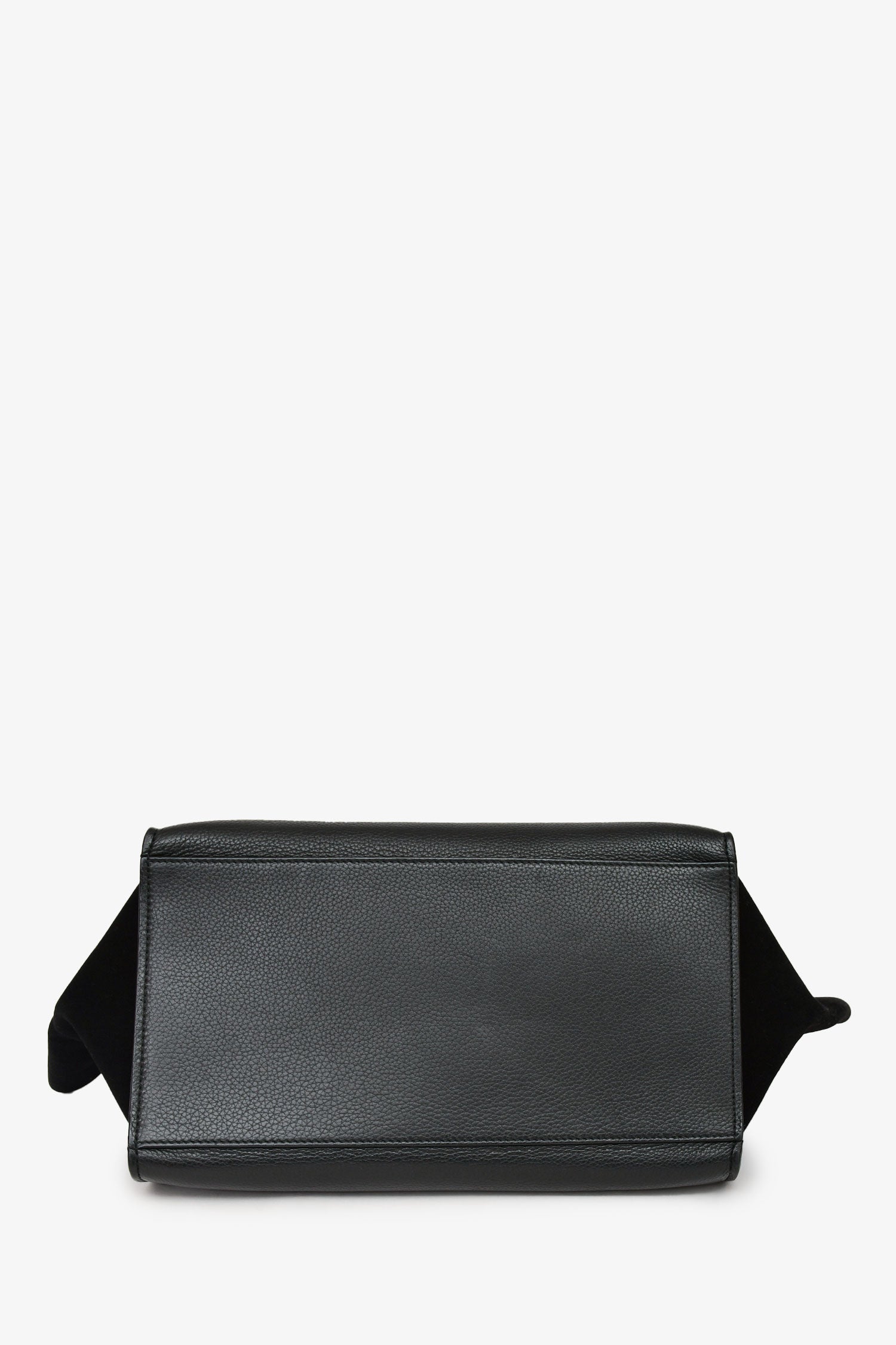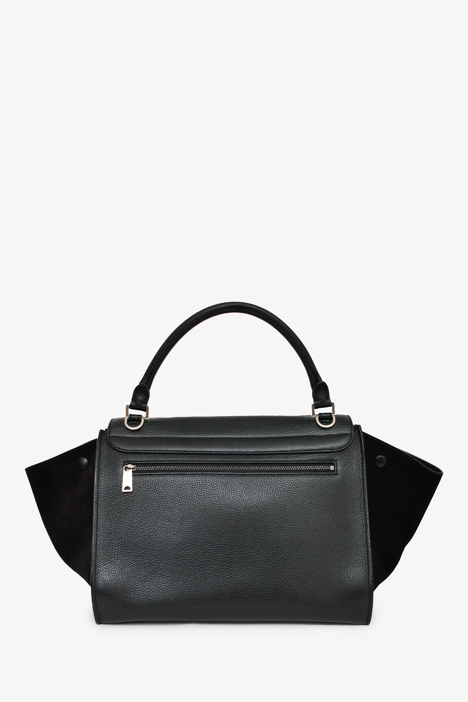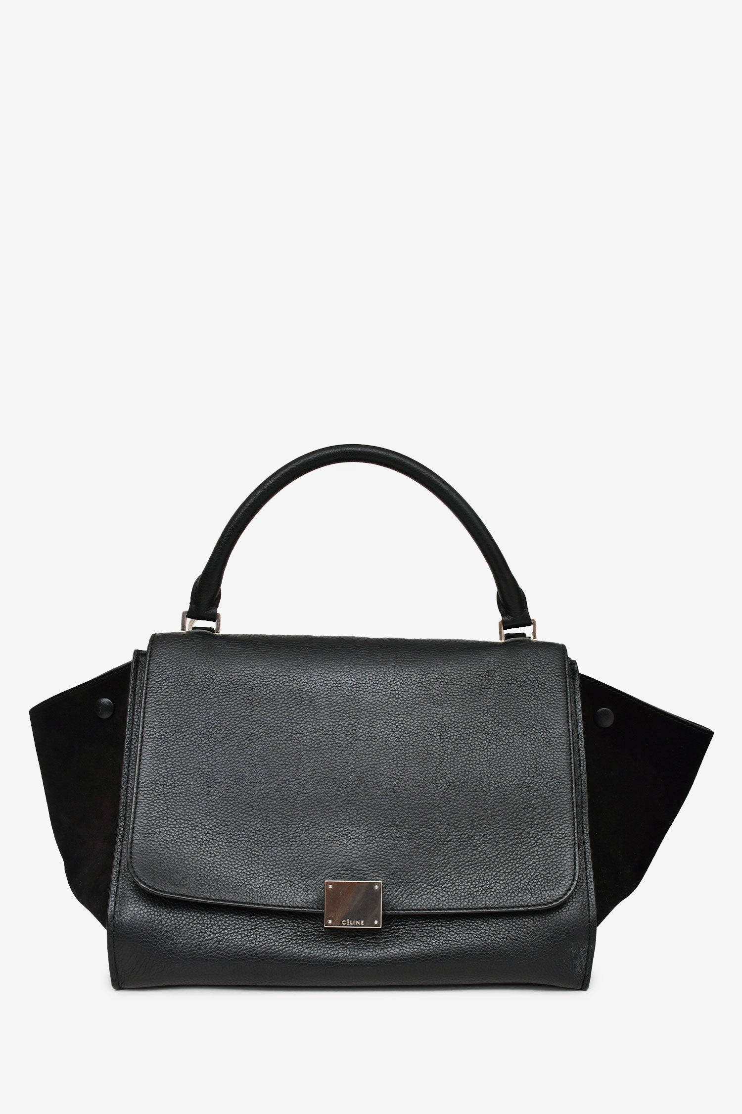Refresh availabilityCeline Black Leather/Suede Trapeze Bag with Strap. Flap front with silver-tone turn-lock closure and top zip. Rolled leather top handle and detachable shoulder strap. Leather-lined interior with two slip pockets. Tonal stitching.