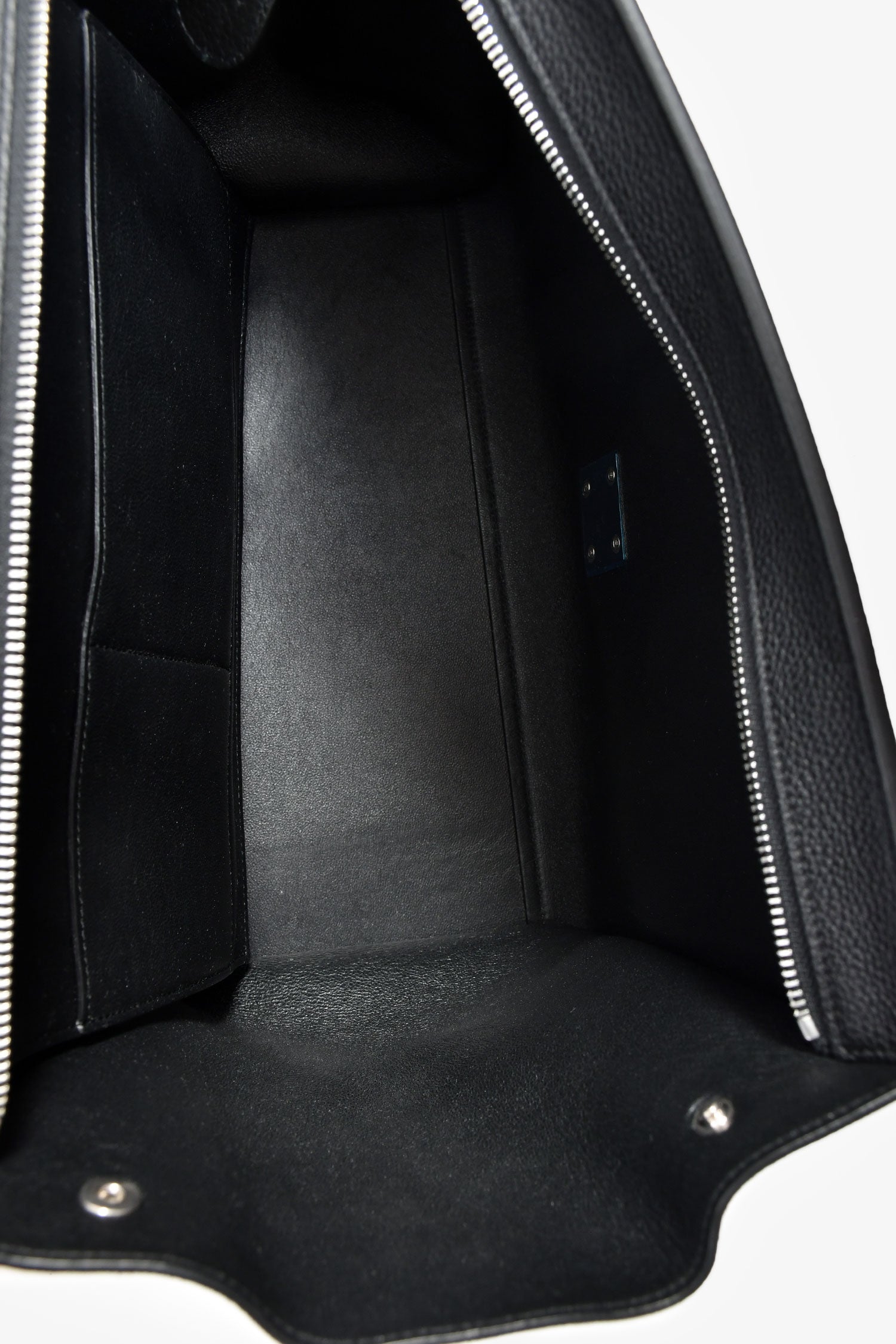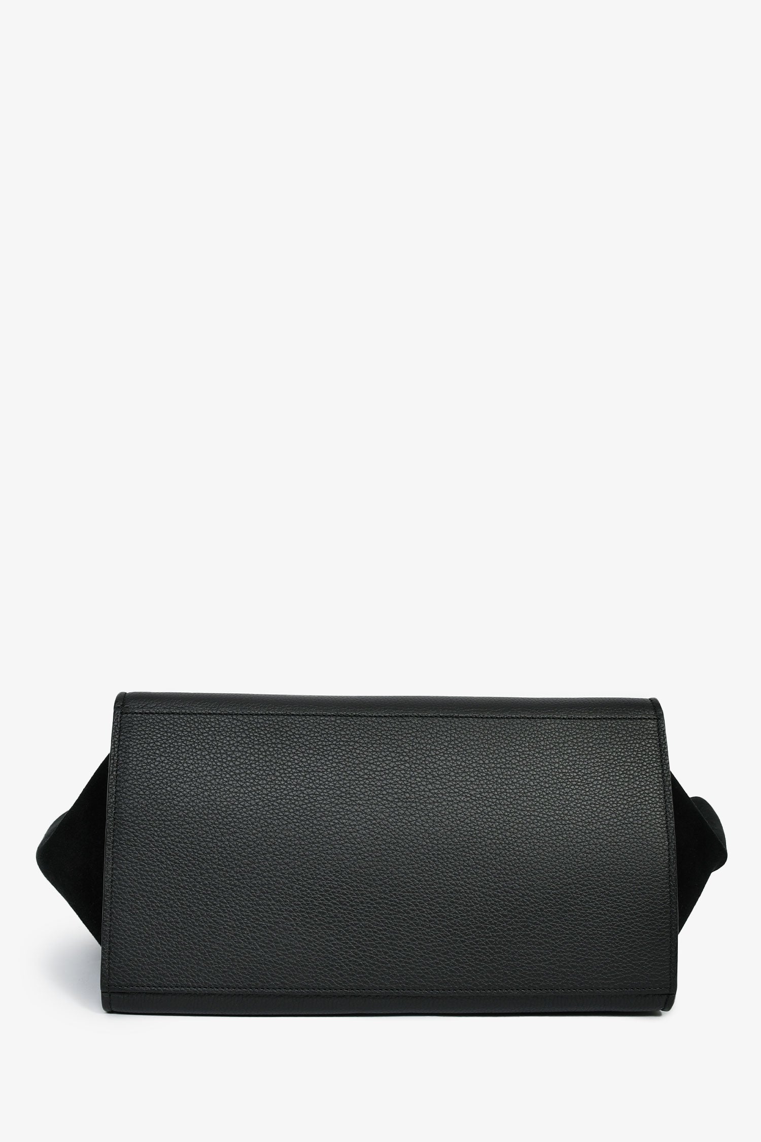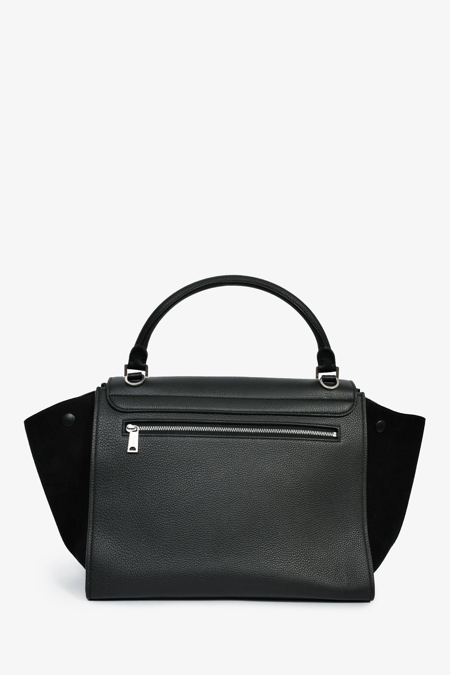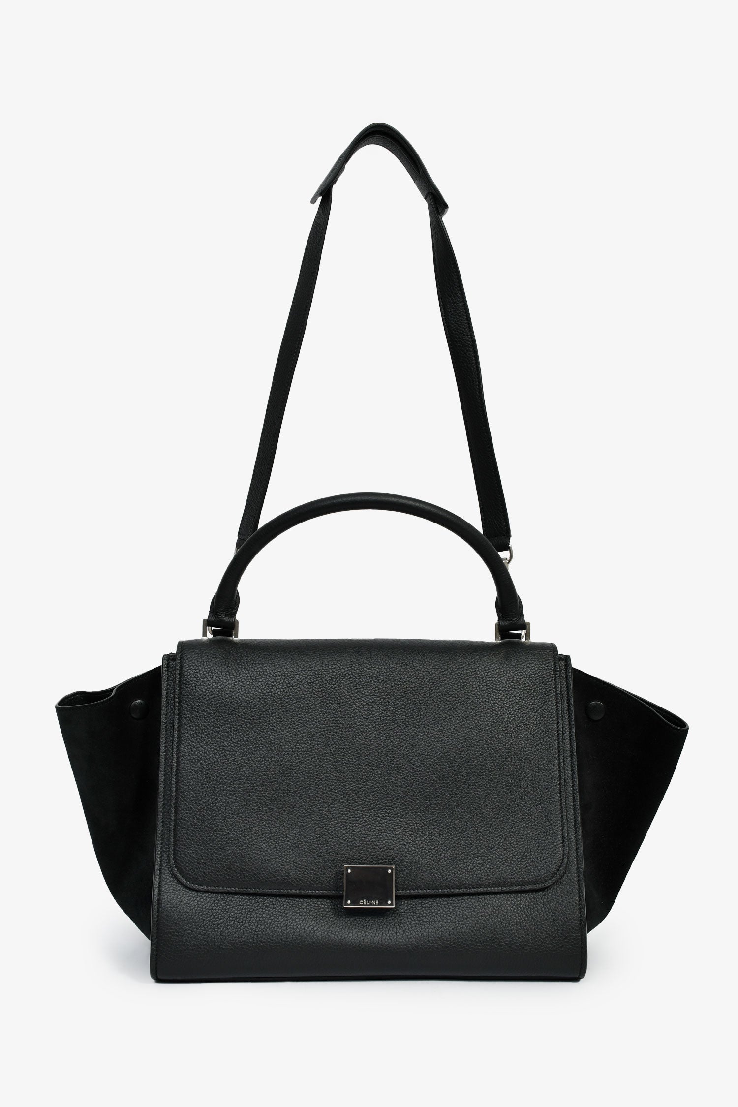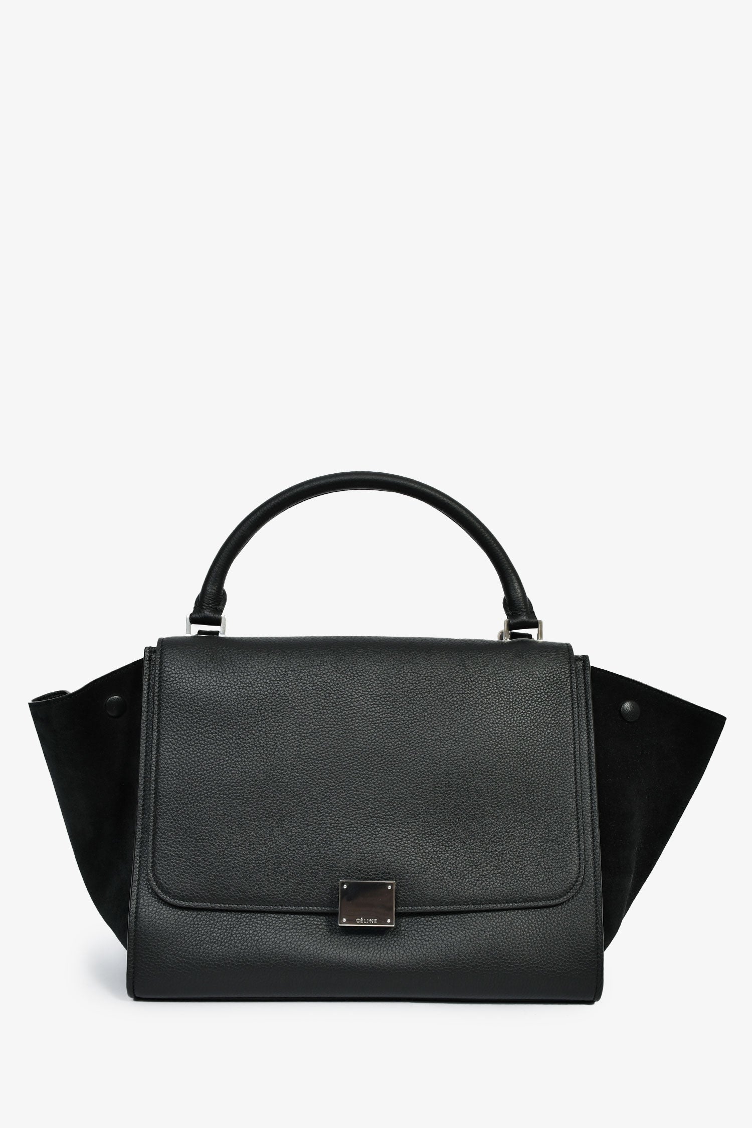 Refresh availabilityCeline Black Leather/Suede Medium 'Trapeze' Bag with Strap. Front fold-over flap with flip lock closure. Top handle. Removable shoulder strap. Snap-button closure at side exterior. Rear exterior zip pocket. Suede-lined interior. Single interior compartment with 2 slip pockets. Gold-tone hardware. Tonal stitching.