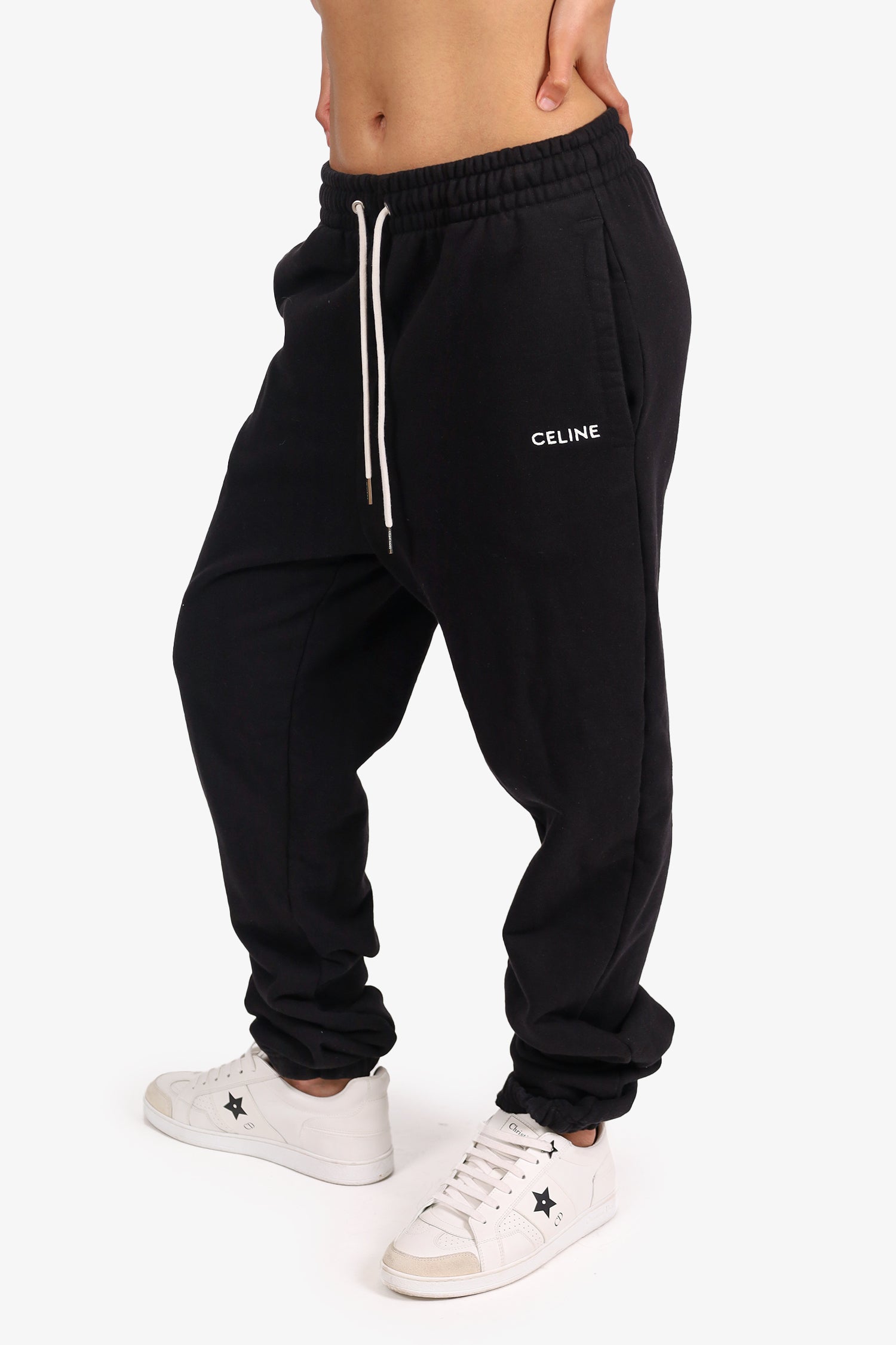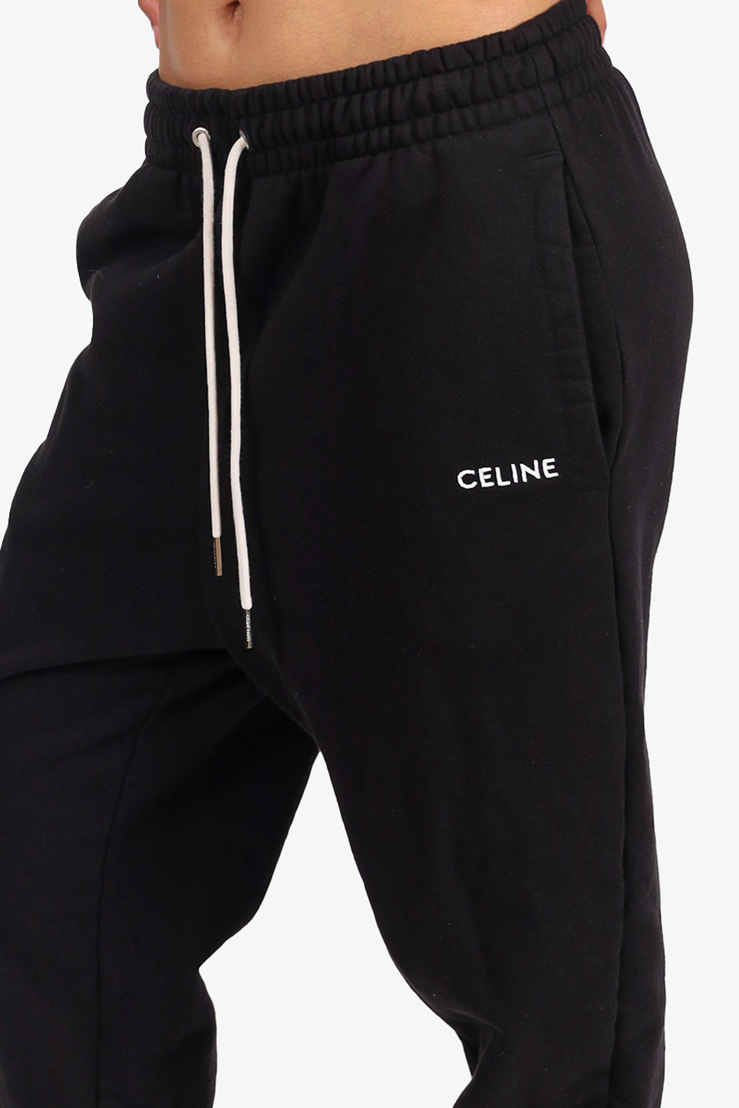 Refresh availabilityCeline Black Logo Embroidered Track Pants. Slip-on. Elasticated waistband with drawstring closure. 2 side slip pockets. Silver-tone hardware. Tonal stitching.
