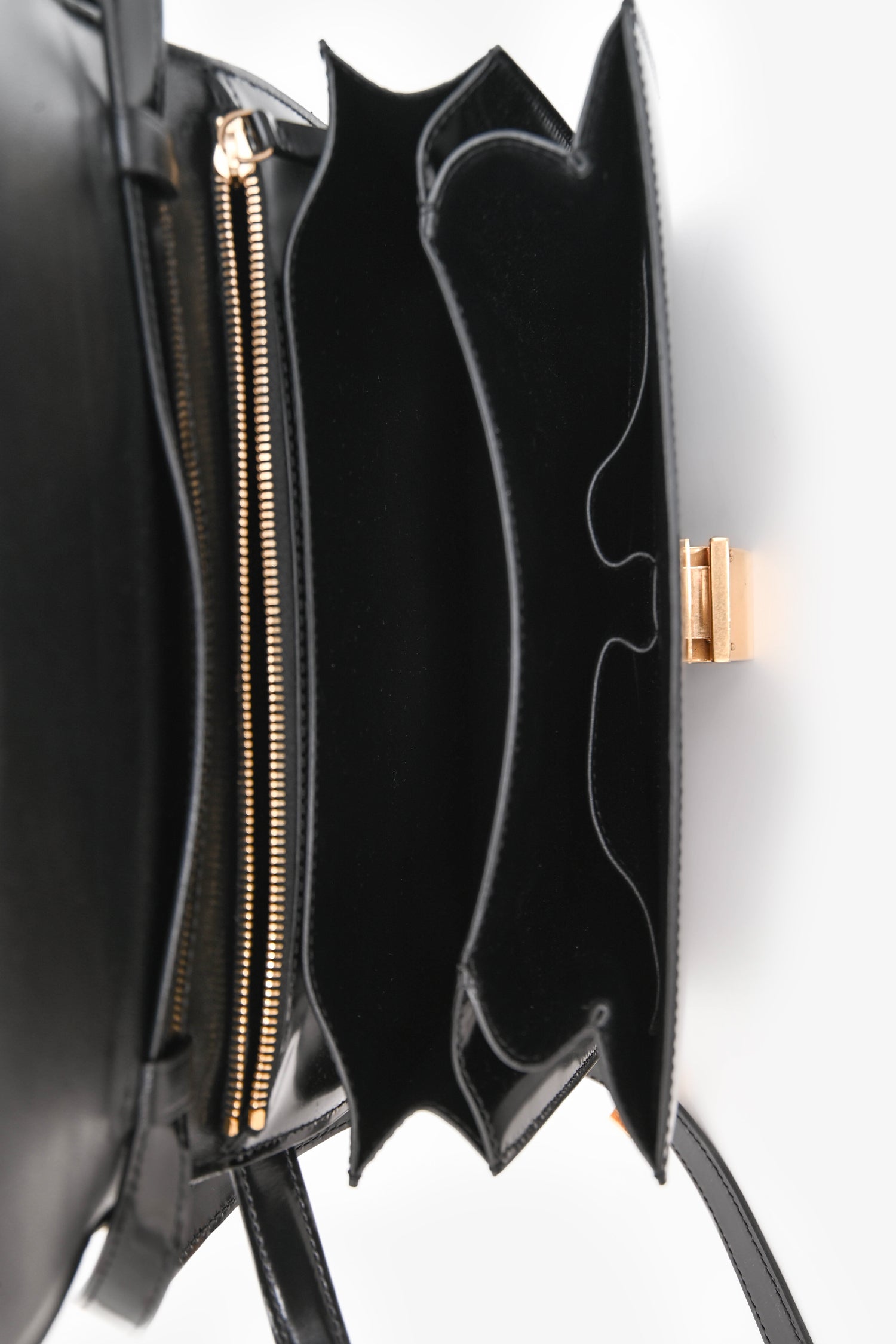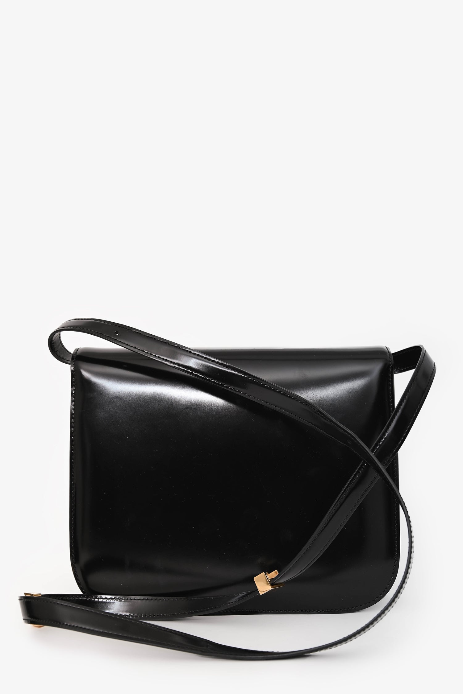 Refresh availabilityCeline Black Patent Leather Medium Box Bag. Front flap with push-lock closure. Adjustable leather shoulder strap. 1 interior zip pocket. 2 interior compartments, 1 with 2 slip pockets. Gold-tone hardware. Tonal stitching.