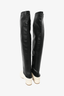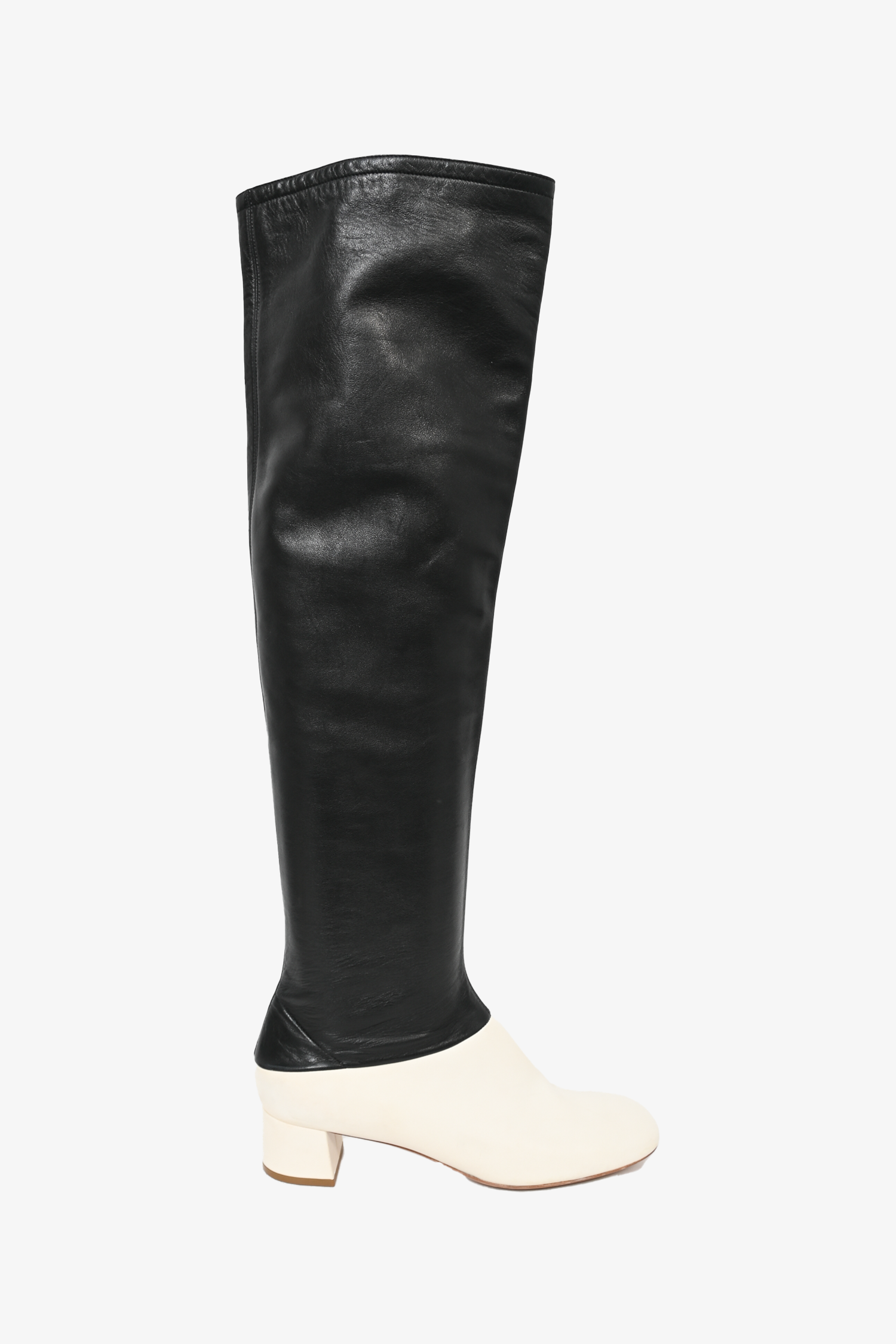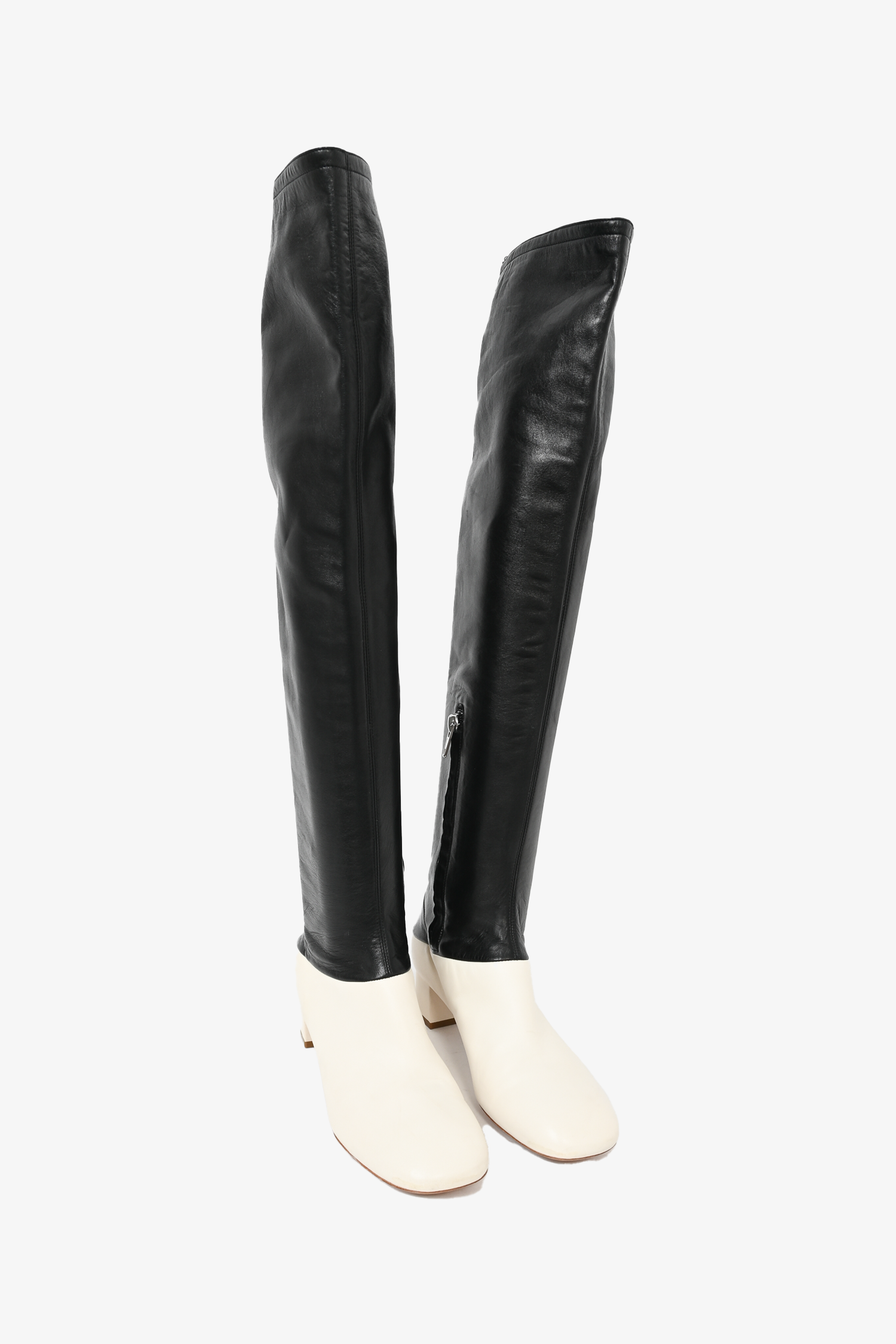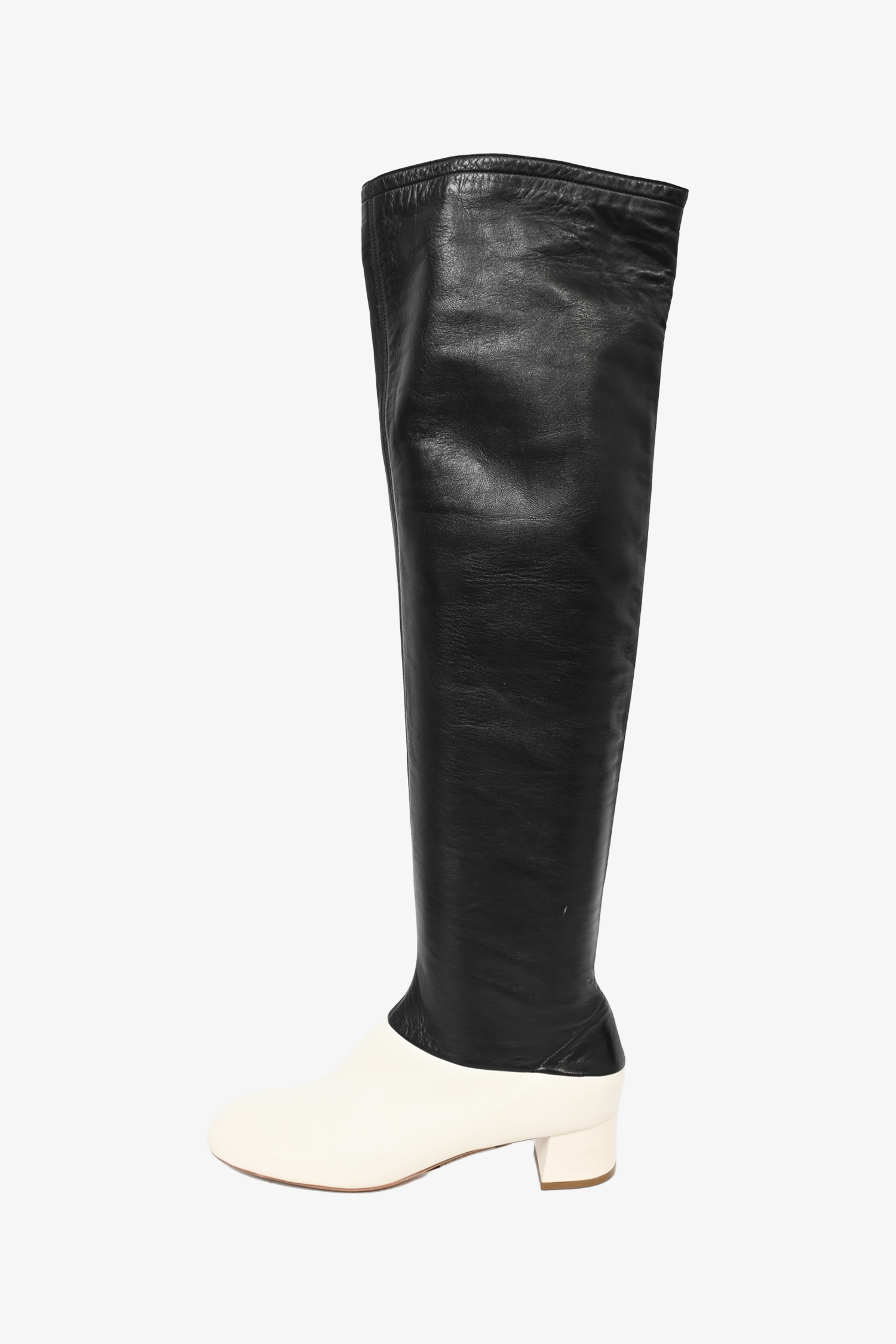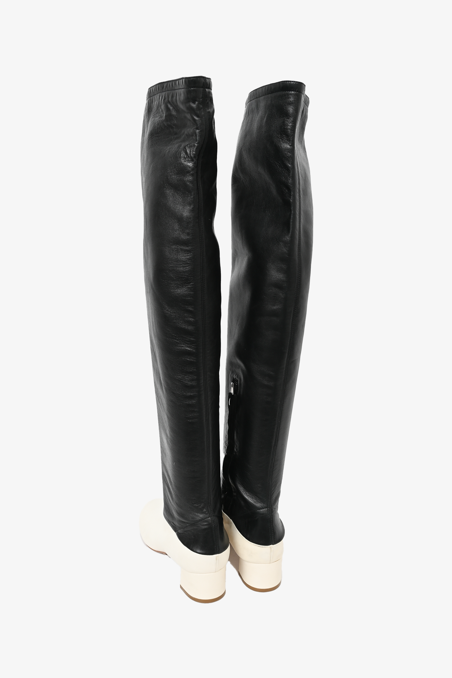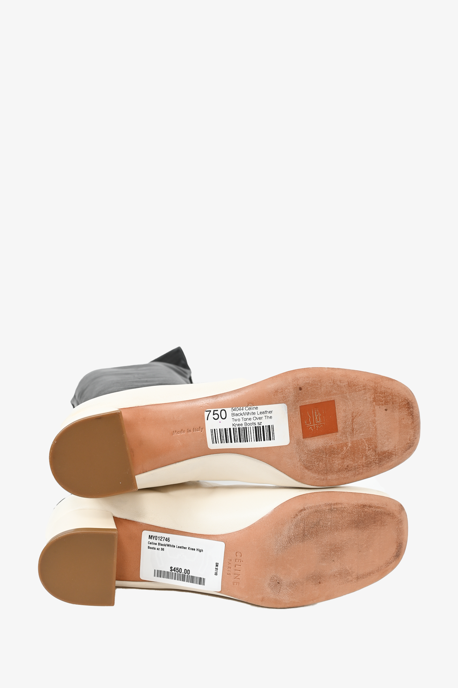 Refresh availabilityCeline Black/White Leather Knee High Boots. Rounded square toe. Inner side zip closure. Block heel. Tonal stitching.