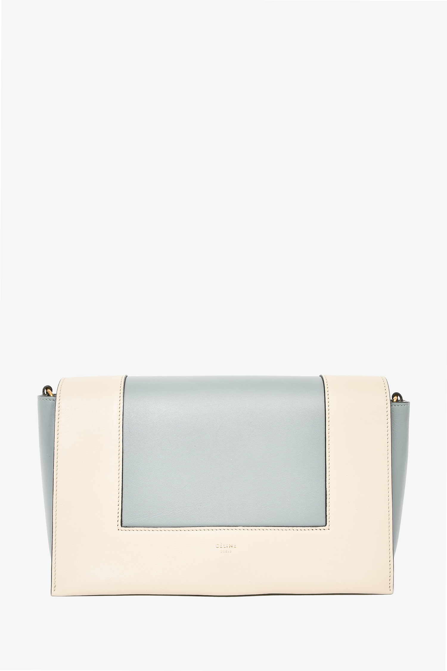 Refresh availabilityCeline Blue/Cream Leather Rectangle 'Frame' Shoulder Bag. 1 interior slip pocket. 1 interior zip pocket. Fold over magnetic tab closure. Tonal stitching.