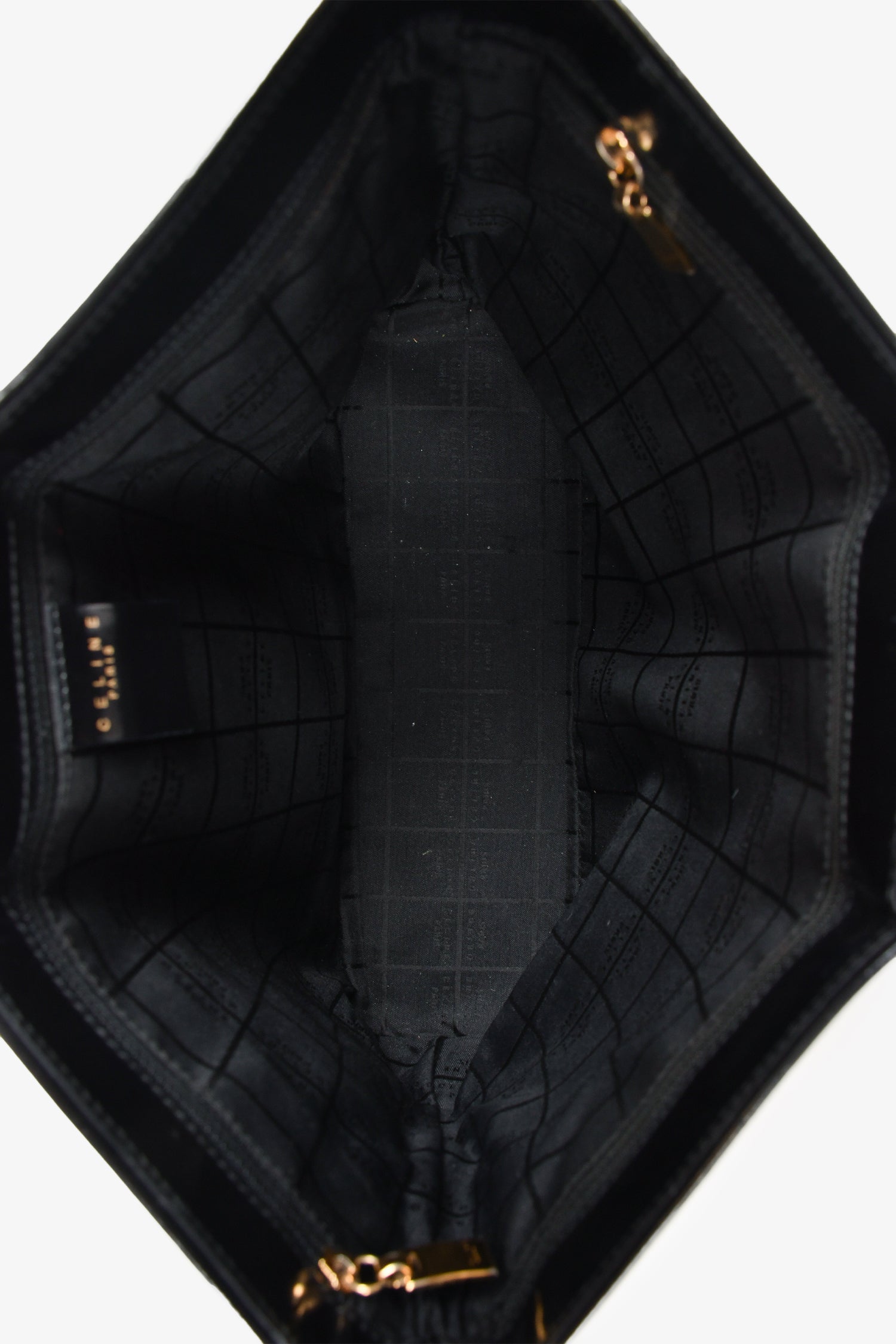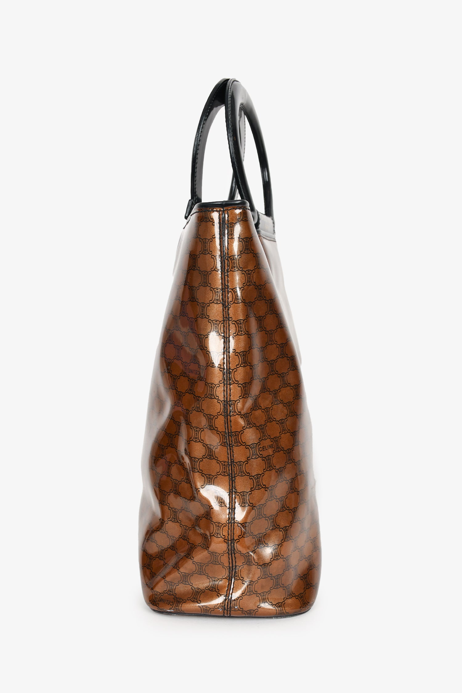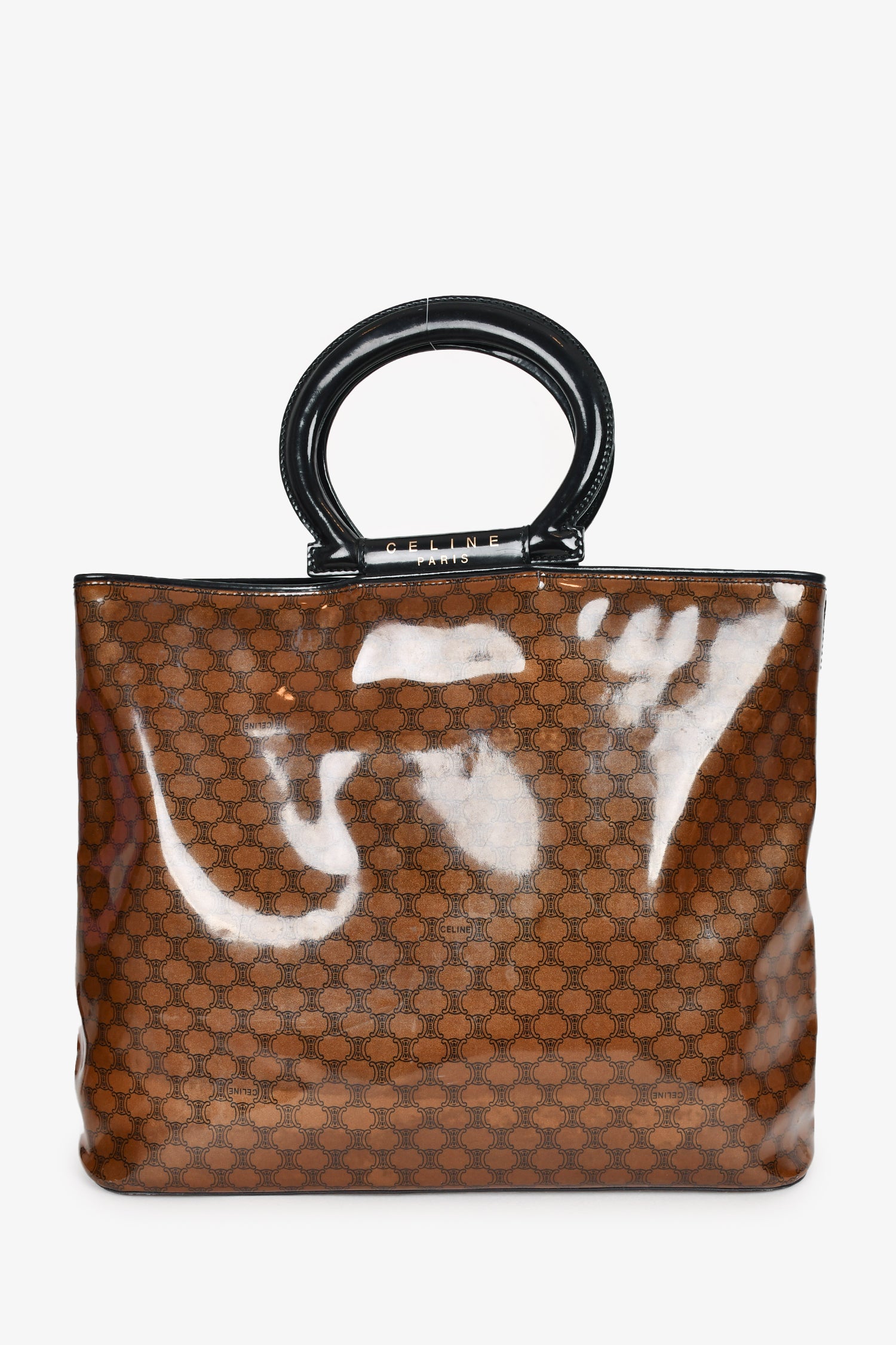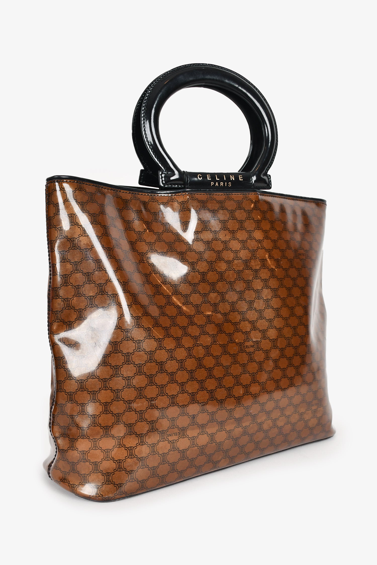 Refresh availabilityCeline Brown Brown/Black Patent Top Handle Bag. Macadam patent motif throughout. Tonal stitching. Circular patent top handles. 2 interior zippered compartments. Gold-toned bag feet at base.