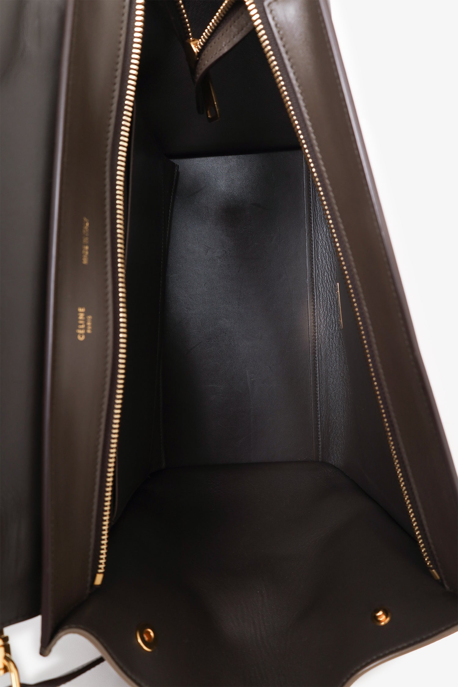Refresh availabilityCeline Brown Crocodile Embossed Medium Trapeze Top Handle Bag. Pull down lock closure. 2 interior slip pockets. 1 exterior rear zip closure. Detachable long strap. Gold-tone hardware. Tonal stitching.