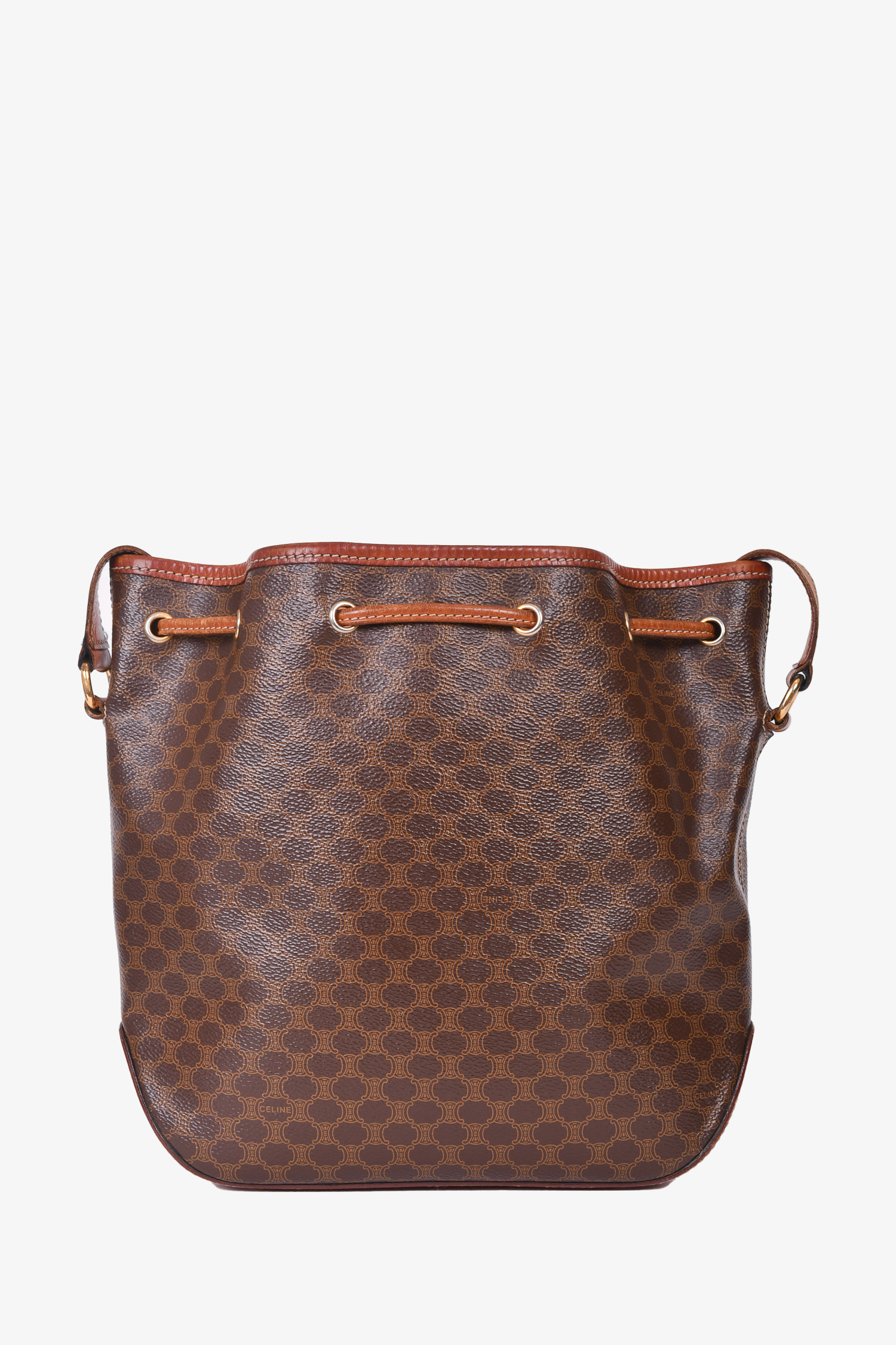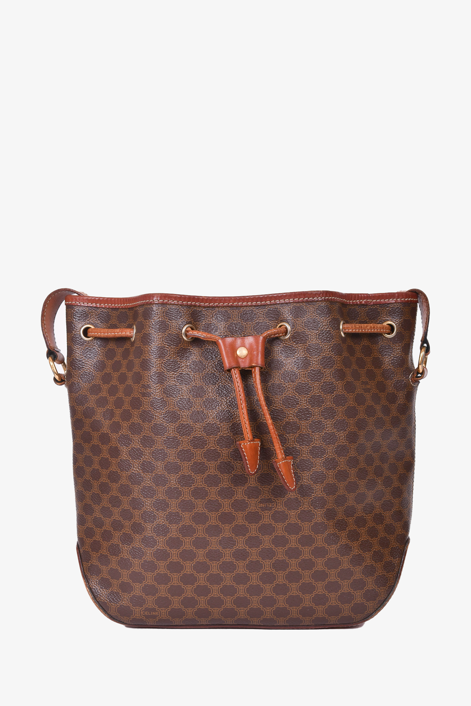 Refresh availabilityCeline Brown Leather/Canvas Monogram Crossbody Bucket Bag. Front drawstring closure. Light brown interior. Single interior wall zip pocket. Adjustable strap. Protective metal bottom. Gold-tone hardware. Tonal stitching.