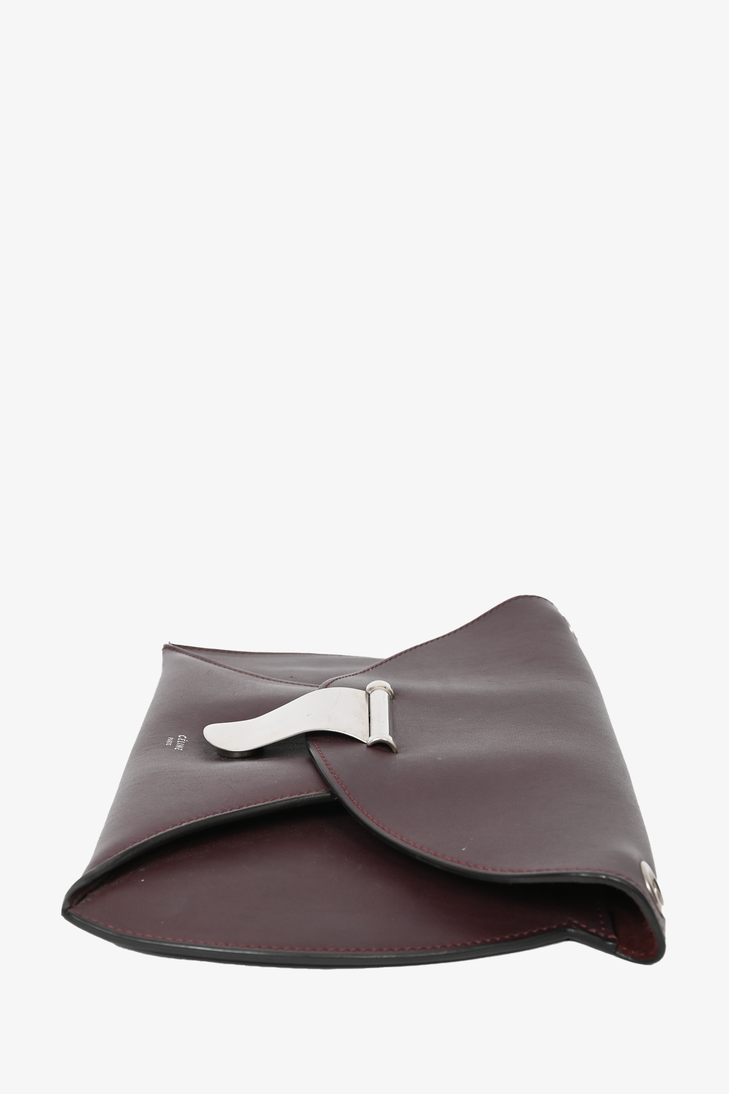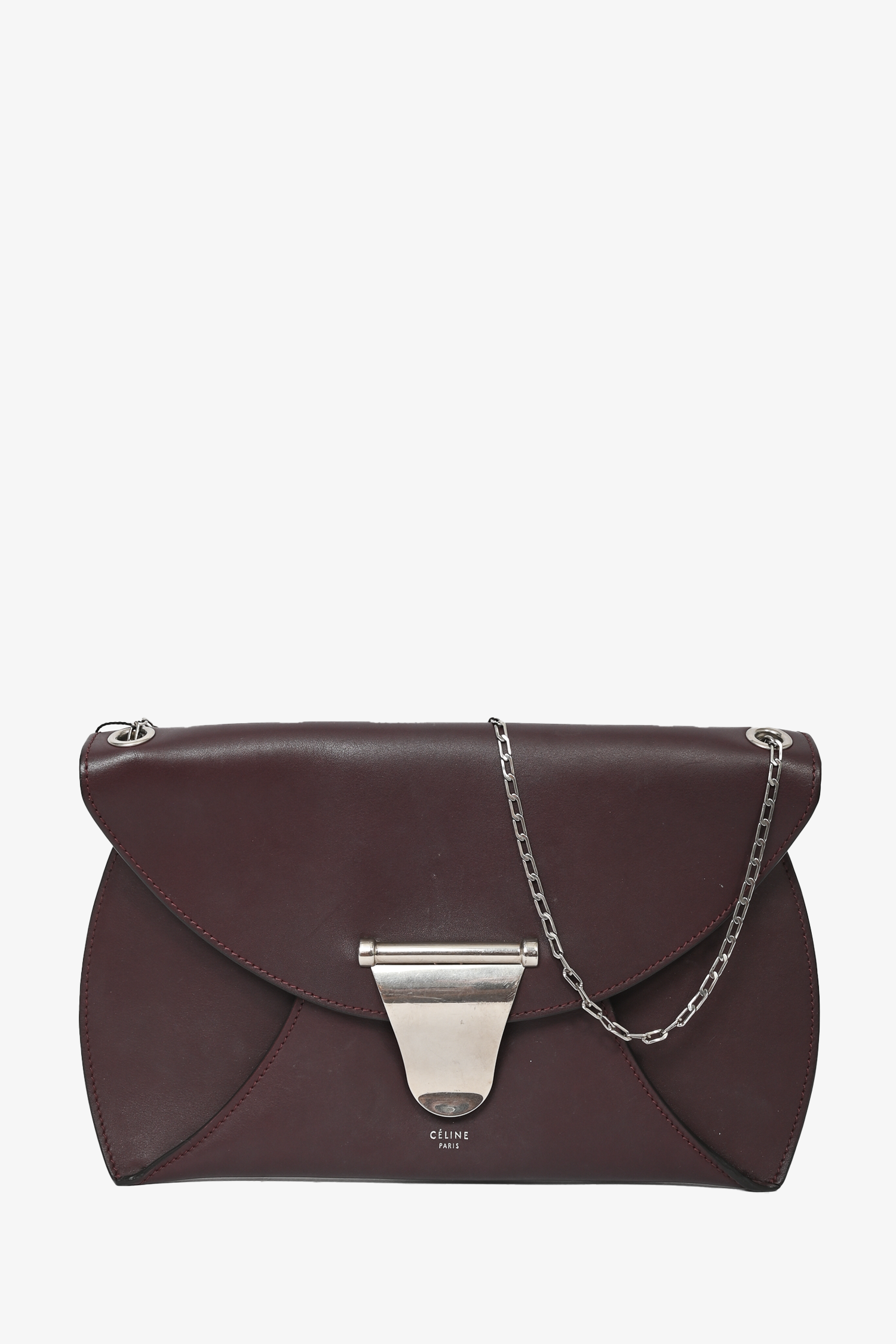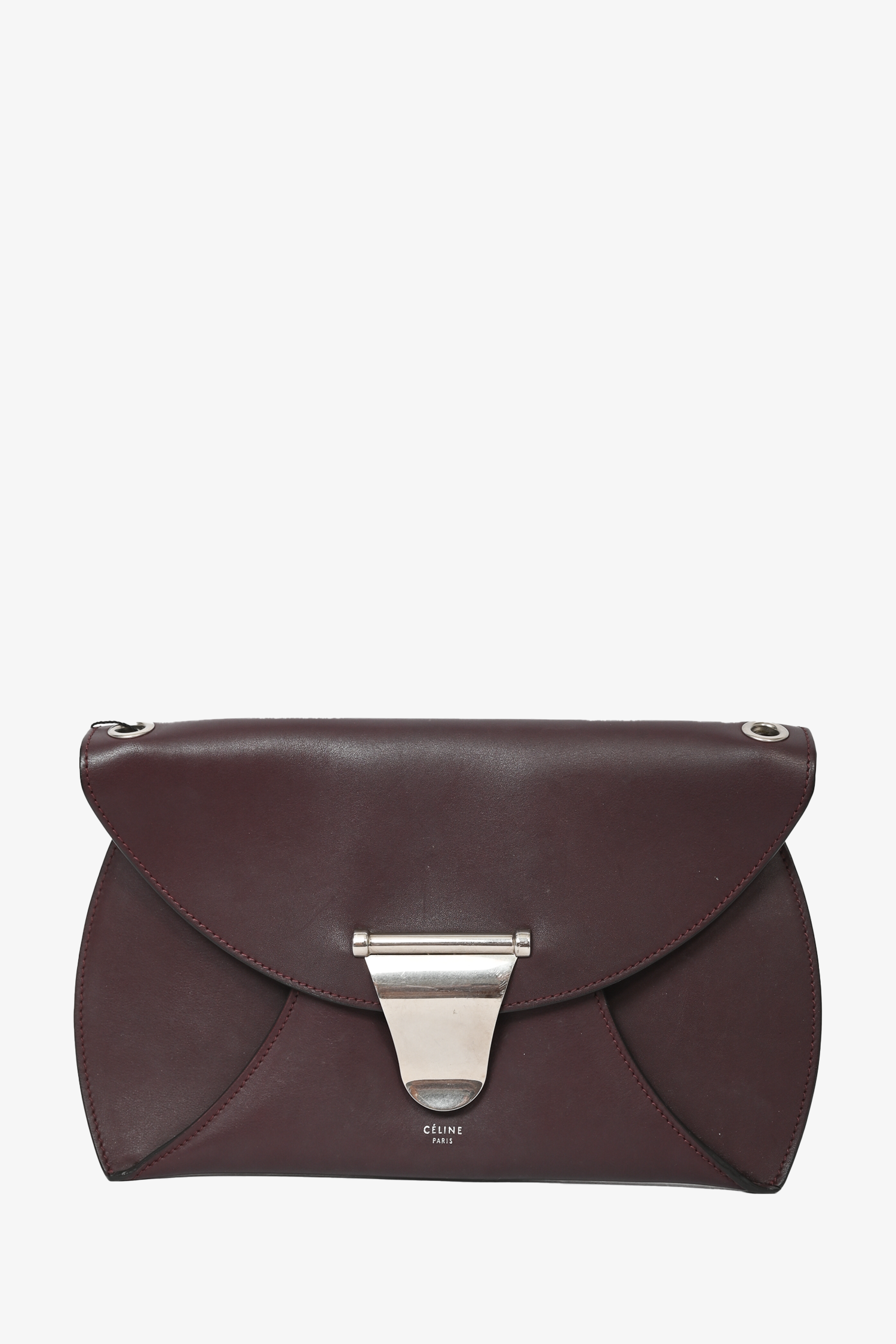 Refresh availabilityCeline Dark Burgundy Leather Curved Flap Shoulder Bag. Front fold-over flap with magnetic button closure. Tonal interior. 6 interior wall card slots. Silver-tone hardware. Tonal stitching.