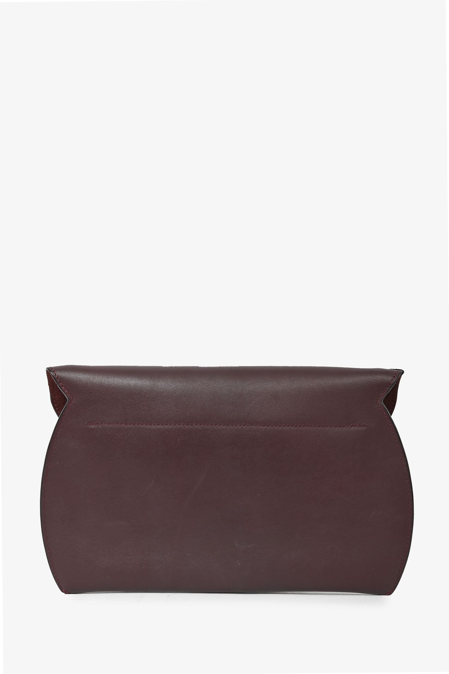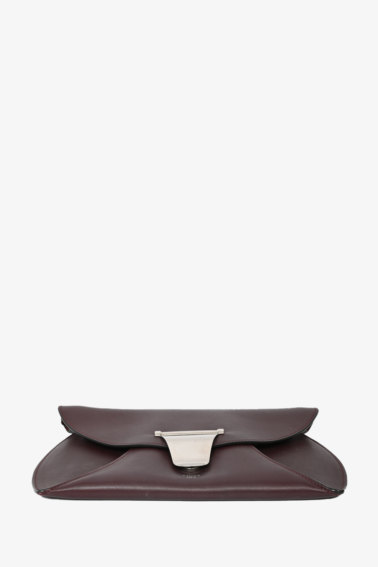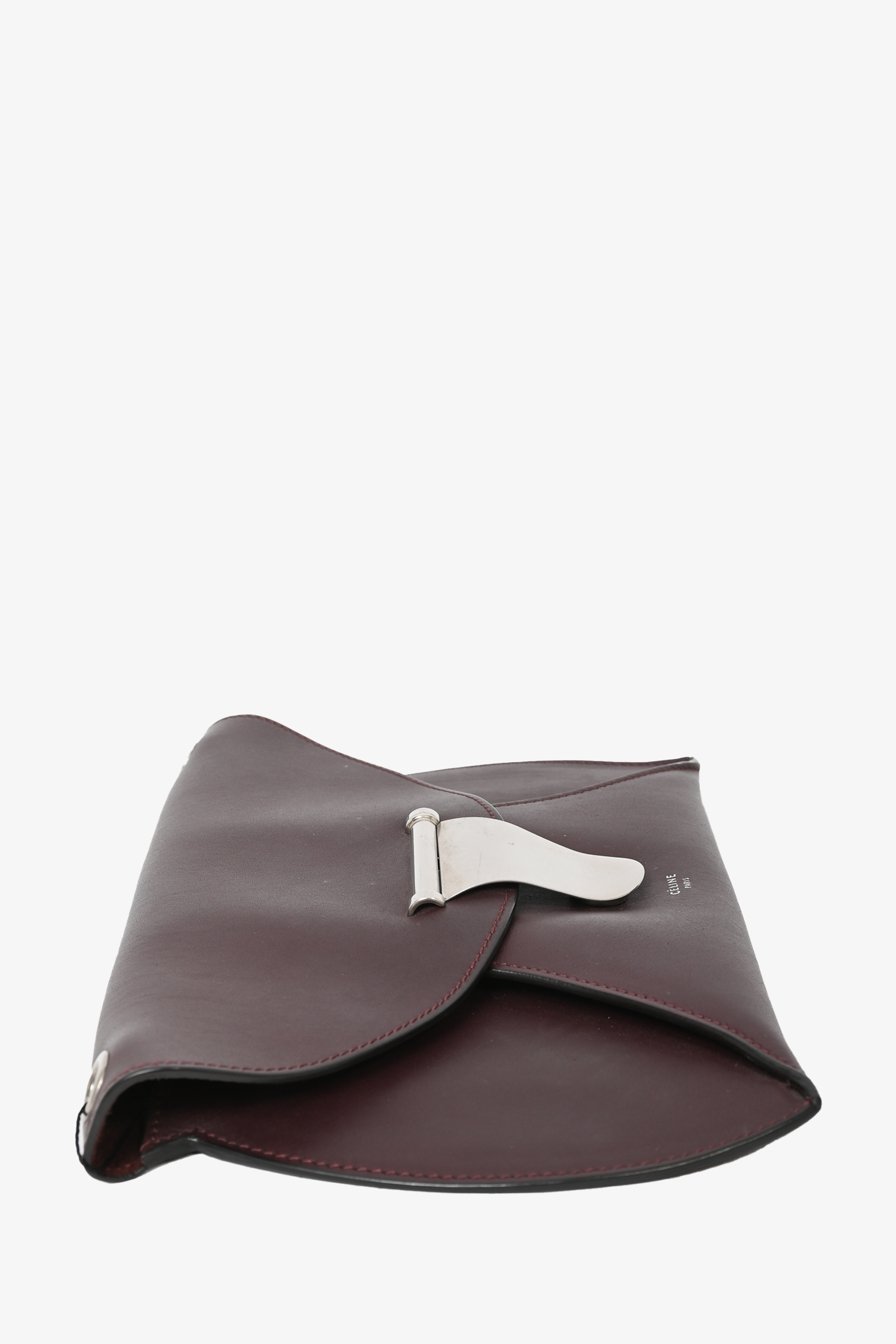 Refresh availabilityCeline Dark Burgundy Leather Curved Flap Shoulder Bag. Front fold-over flap with magnetic button closure. Tonal interior. 6 interior wall card slots. Silver-tone hardware. Tonal stitching.