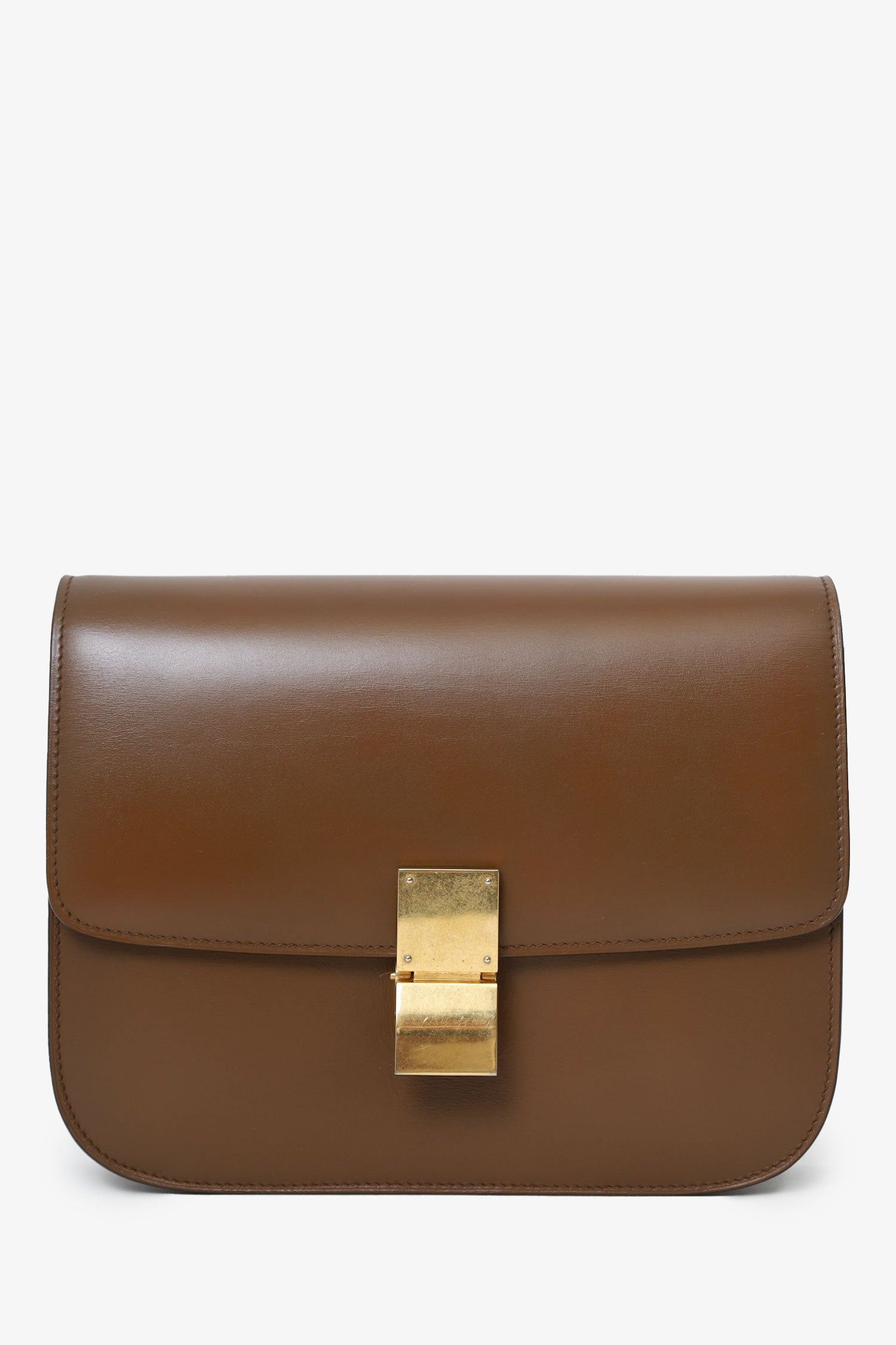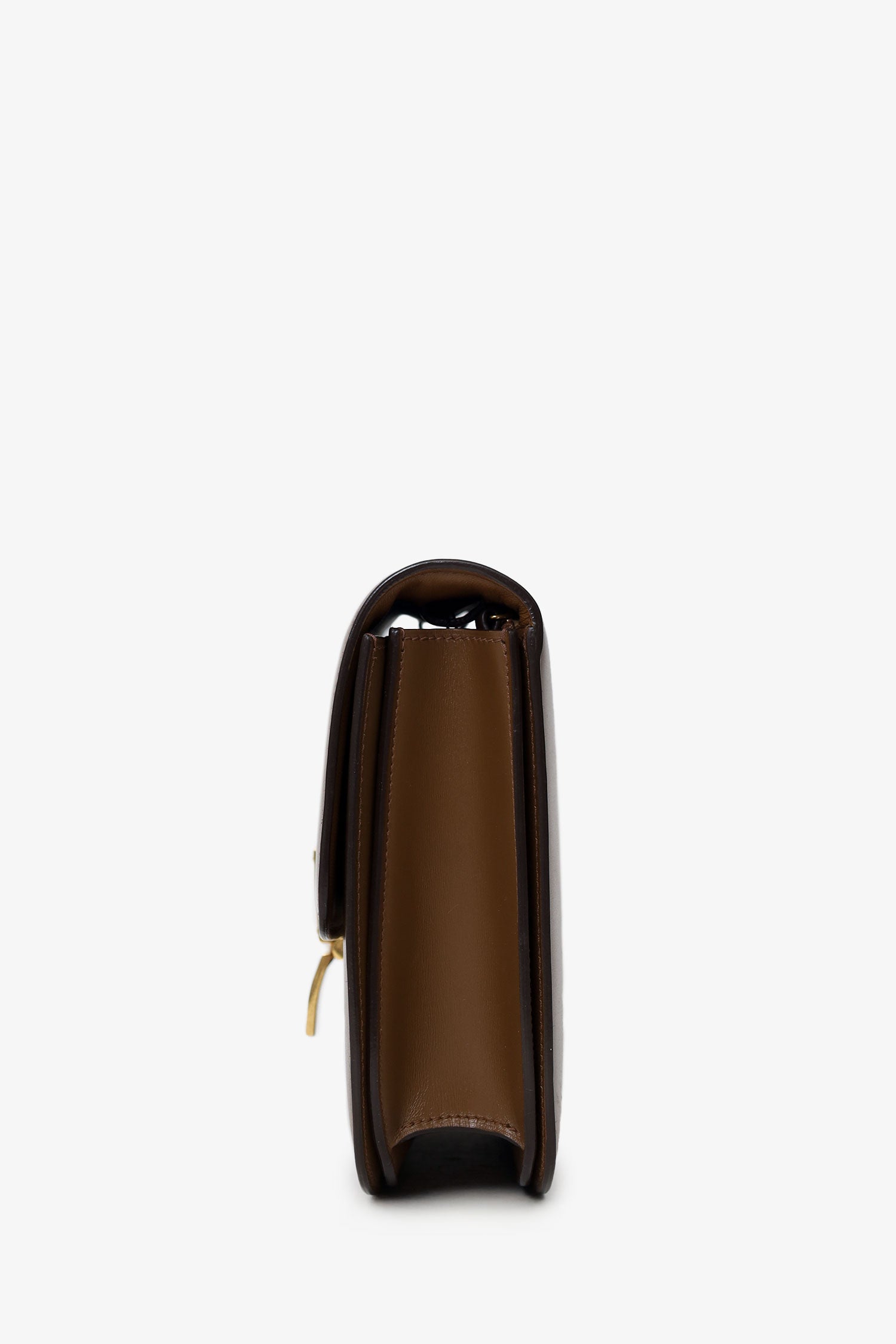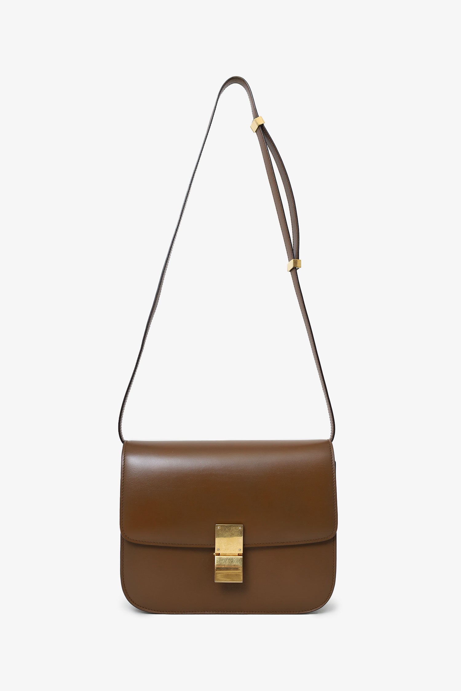 Refresh availability Front fold-over flap with push lock closure. 3 interior compartments; 2 open; 1 with zip closure. 2 interior slip pockets in front compartment. Adjustable crossbody strap. Leather lining. Gold-tone hardware. Tonal stitching.