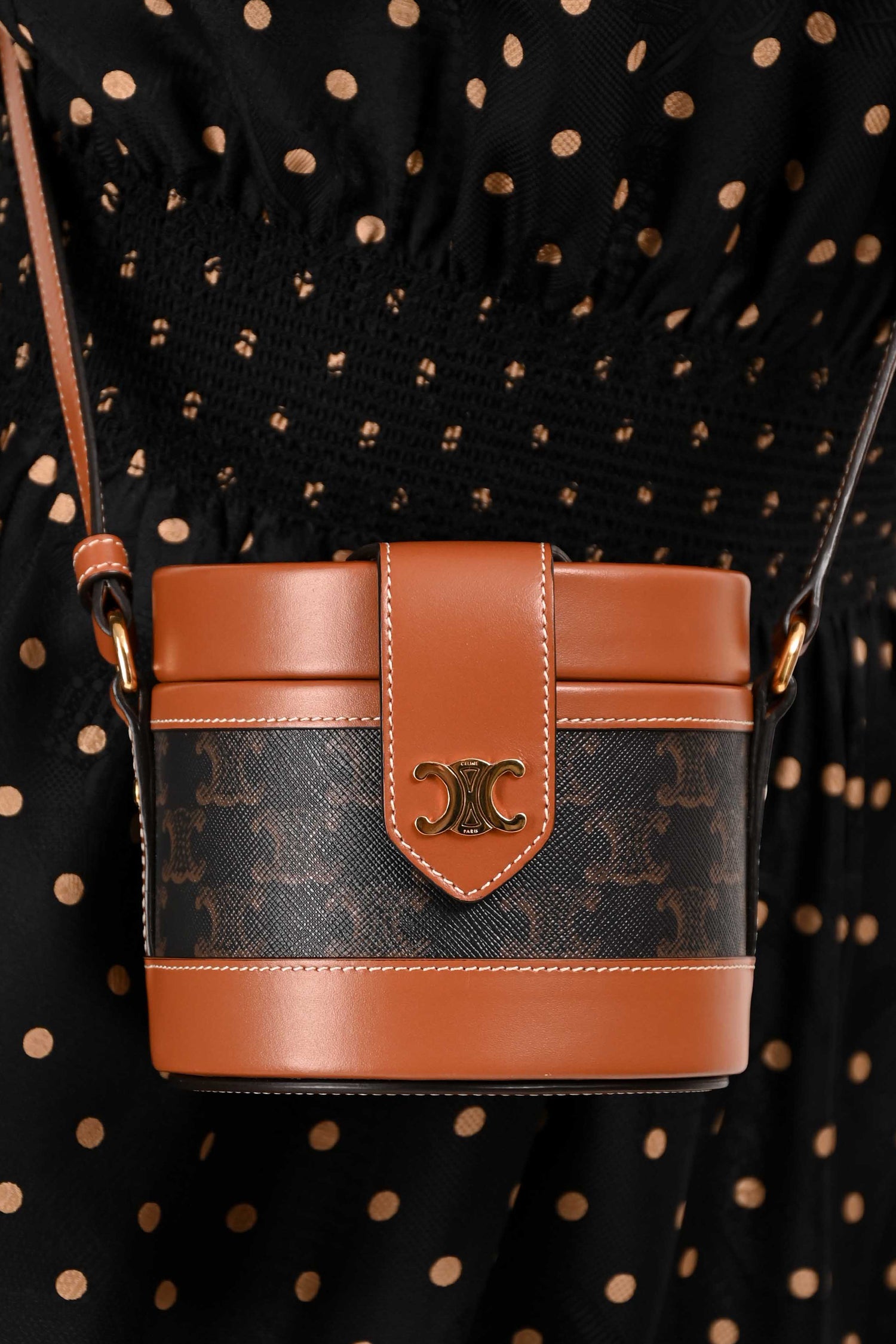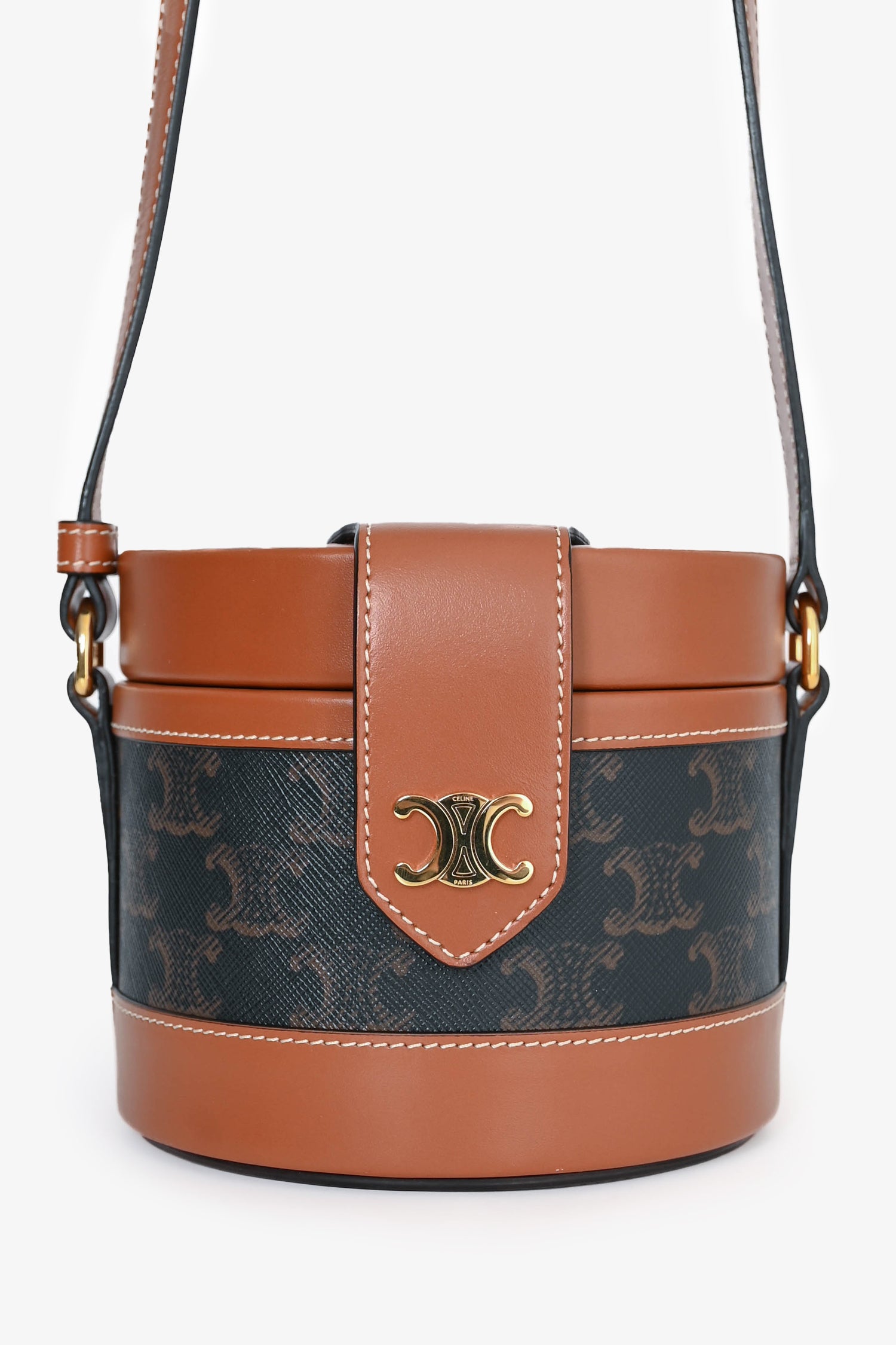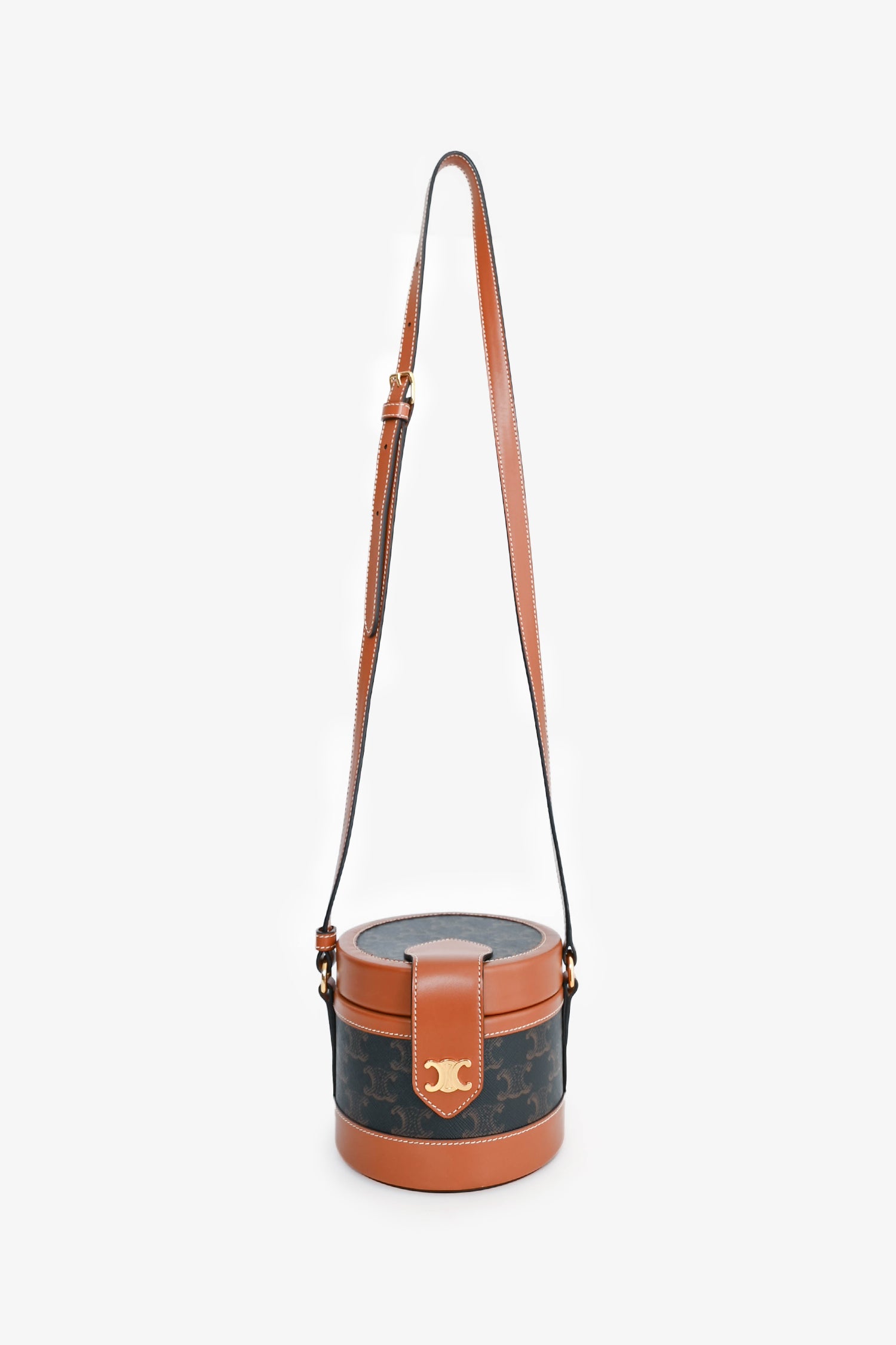 Refresh availabilityCeline Brown Leather Medium Triomphe Vanity Crossbody. Top fold-over strap with snap-button closure. Brown textile interior lining. Open interior. Adjustable strap. Gold-tone hardware.
