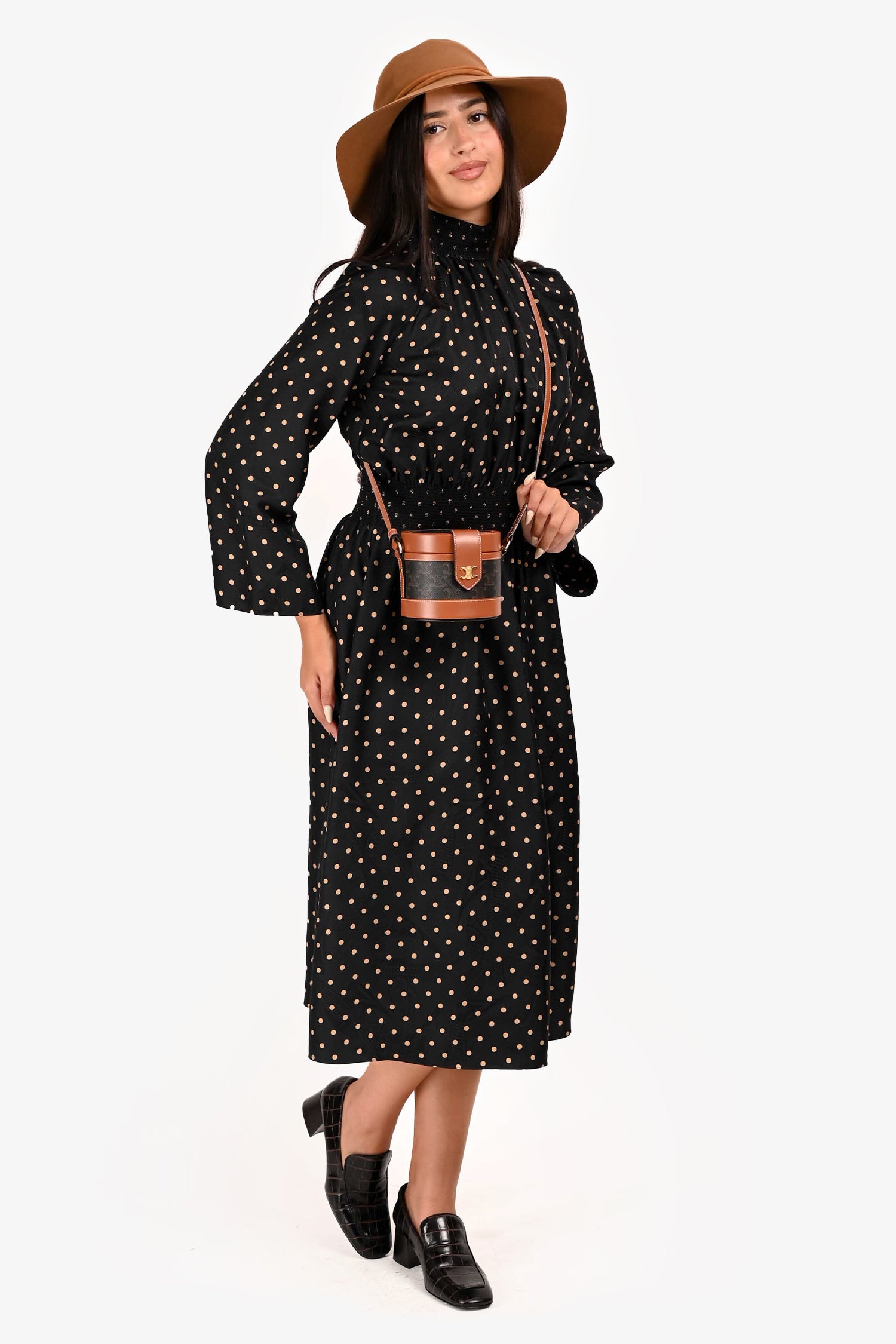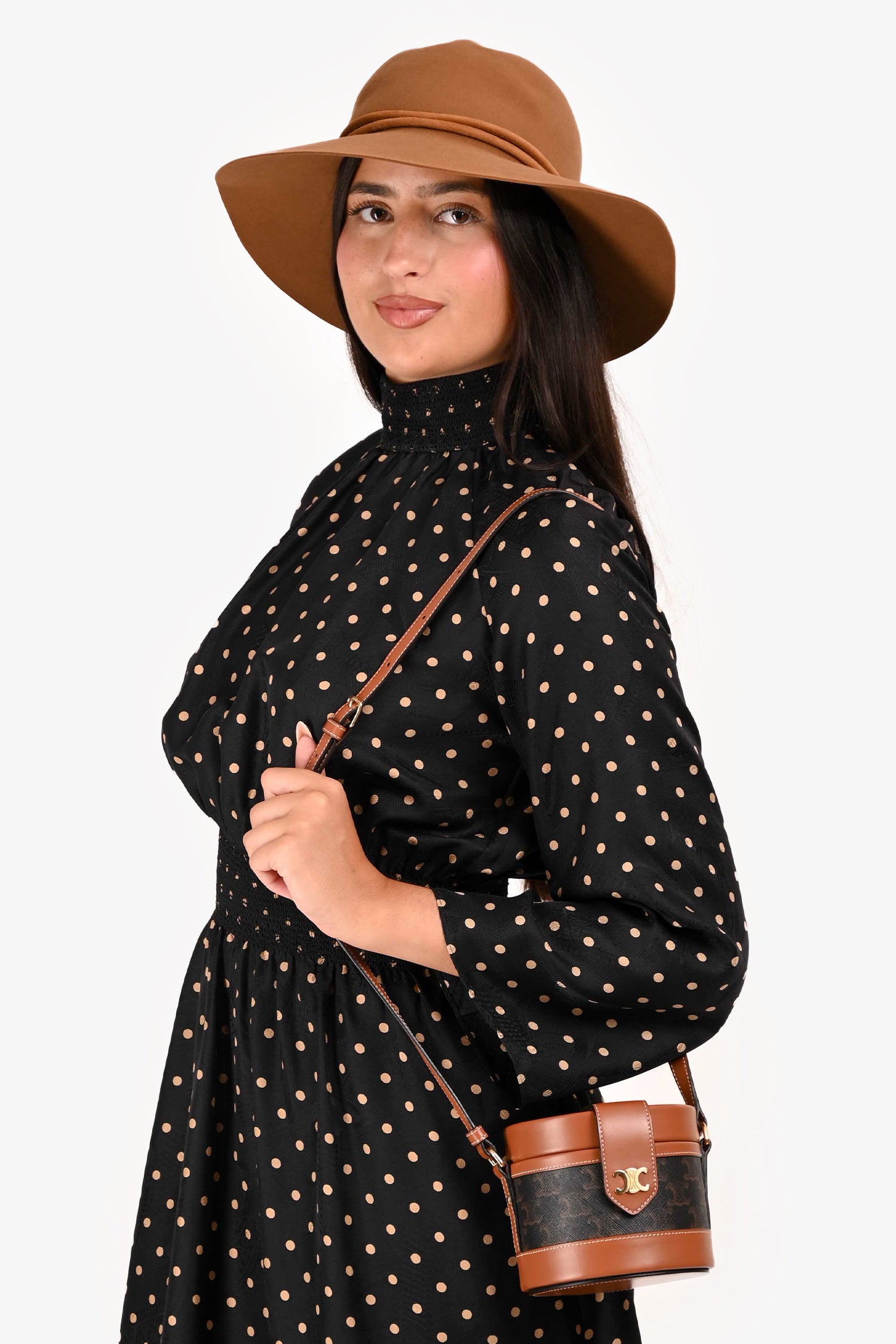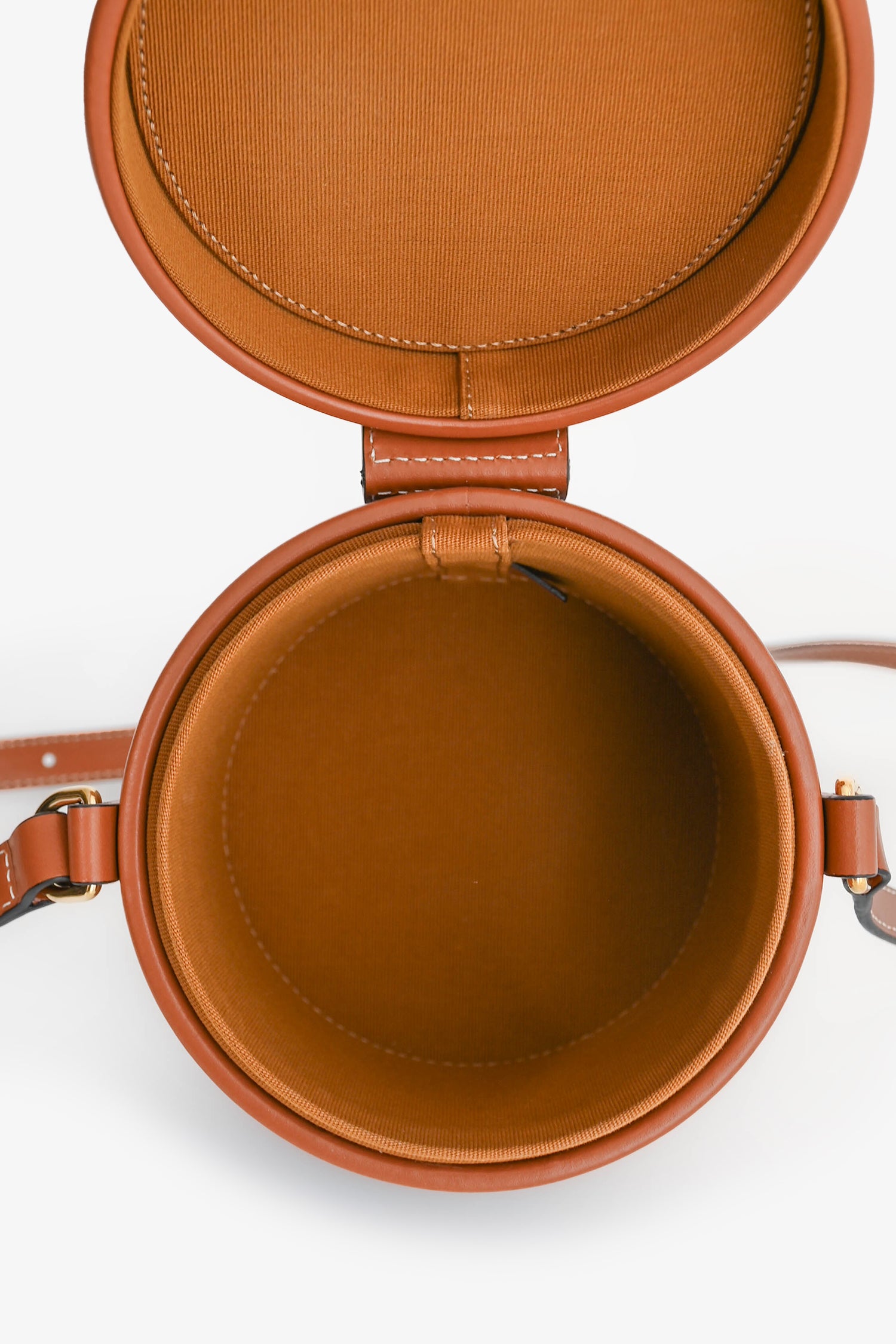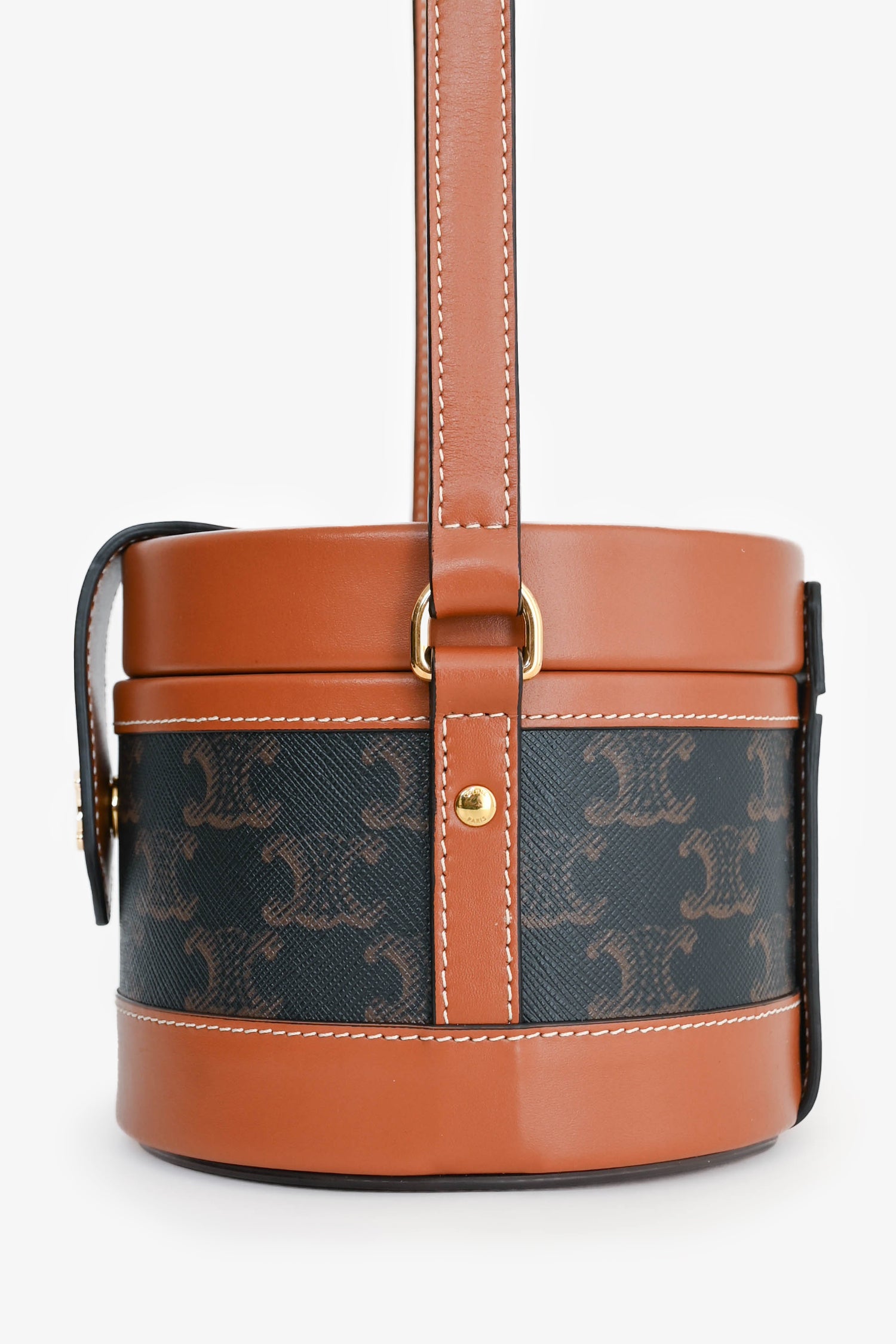 Refresh availabilityCeline Brown Leather Medium Triomphe Vanity Crossbody. Top fold-over strap with snap-button closure. Brown textile interior lining. Open interior. Adjustable strap. Gold-tone hardware.