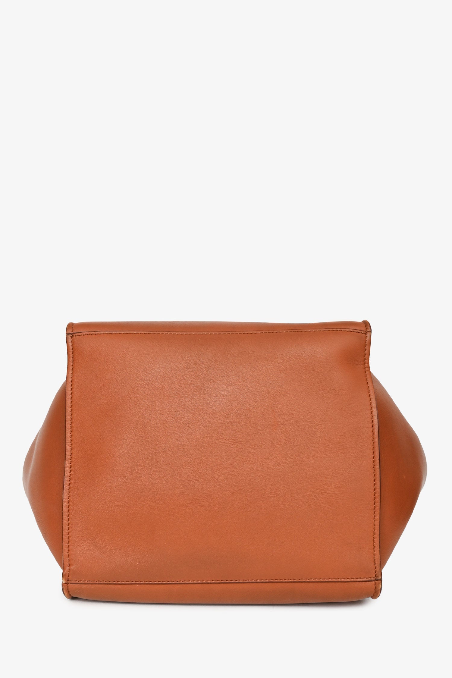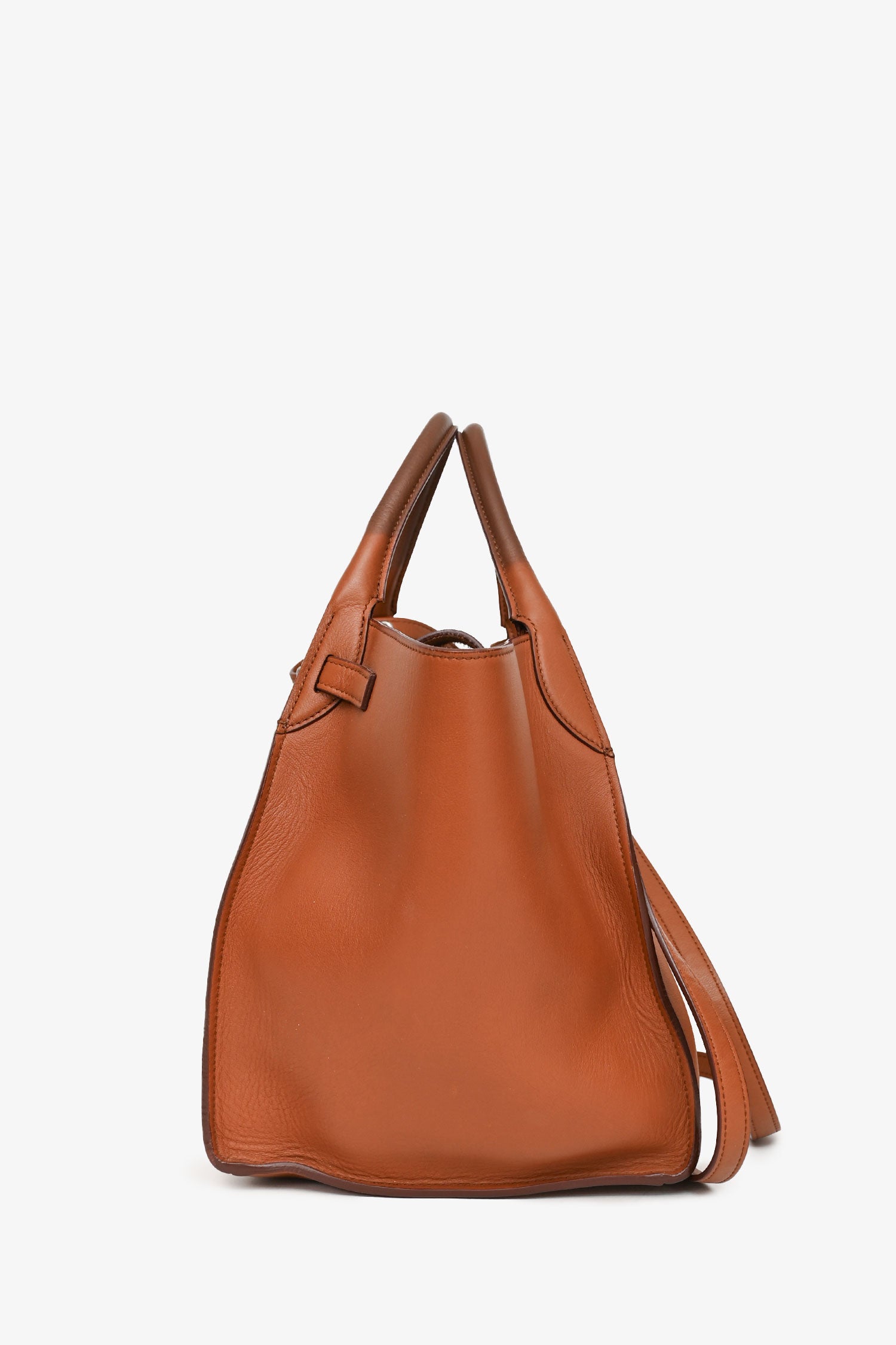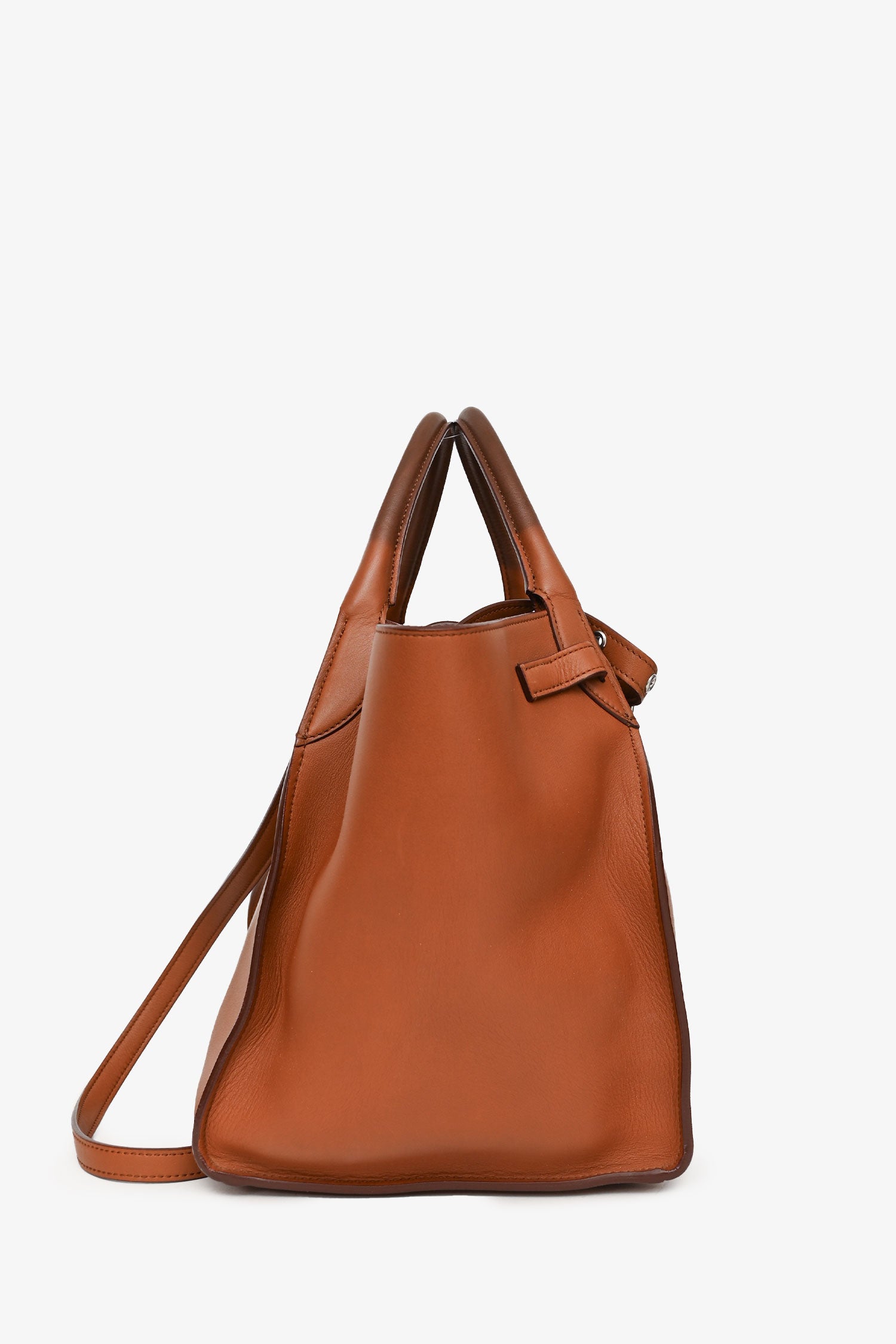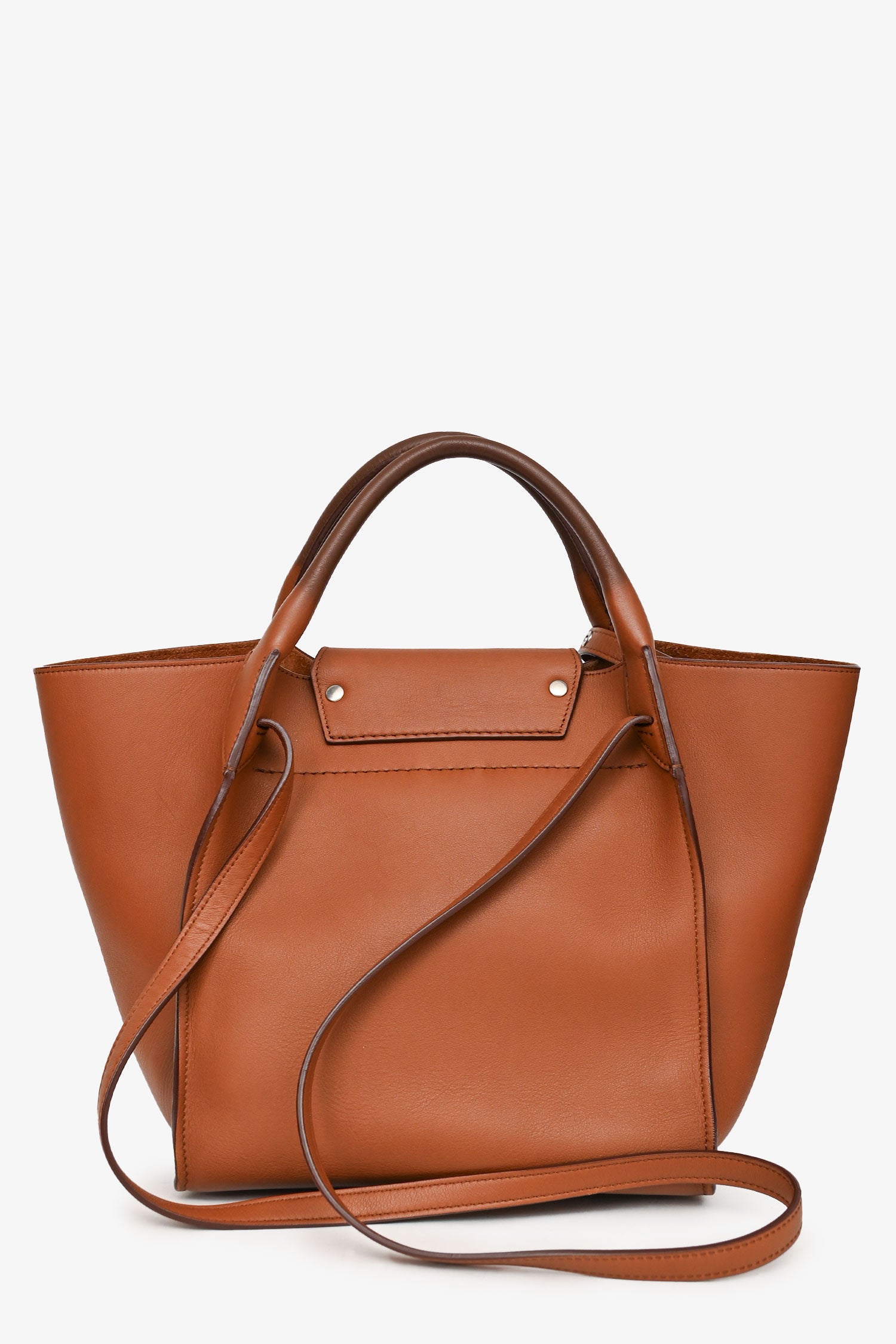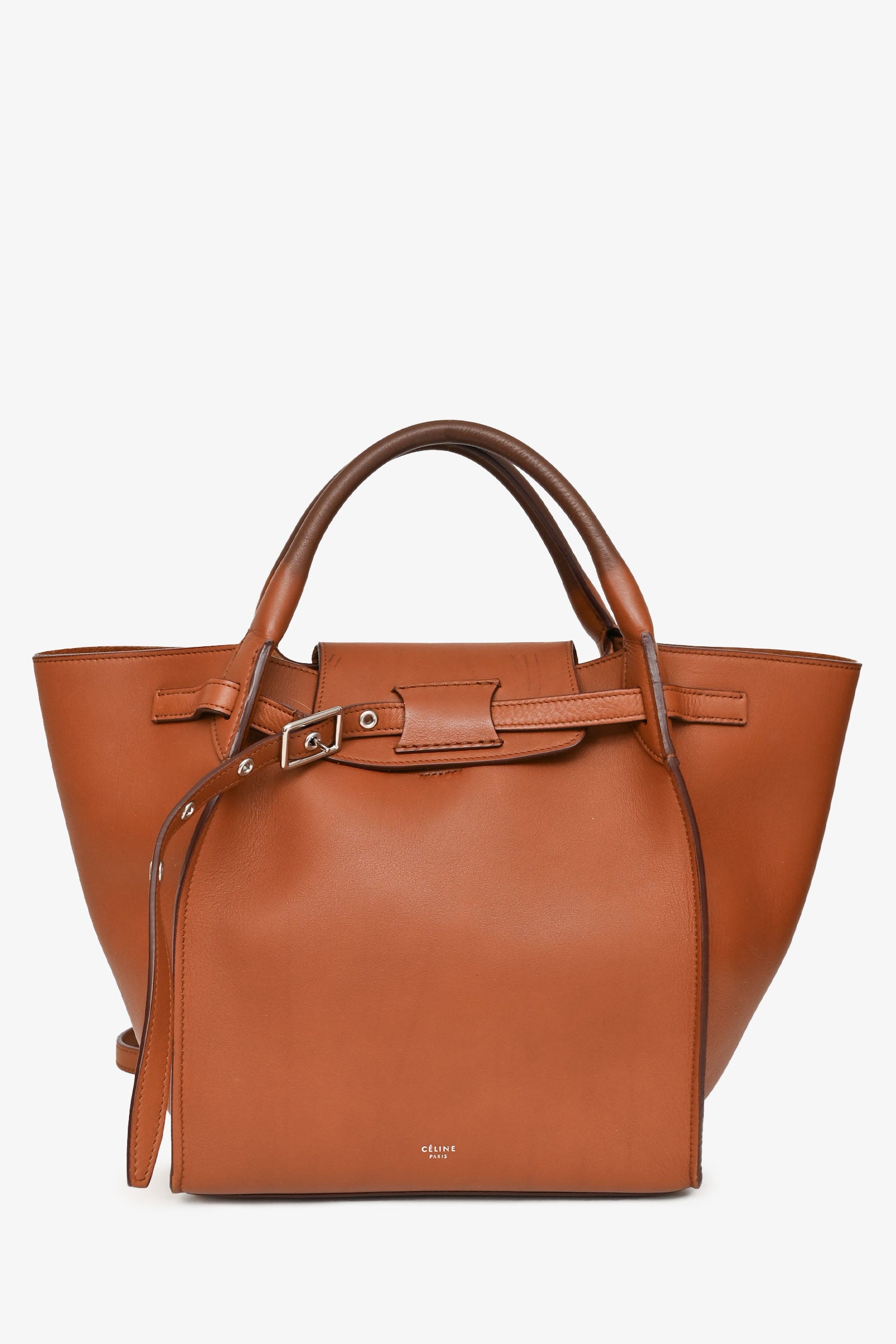 Refresh availabilityCeline Brown Leather Small Big Bag with Strap. Dual top handles and adjustable shoulder strap. Open top with clasp closure and center flap. Adjustable belt buckle detail at front. Unlined interior with leather zip pocket. Tonal stitching.
