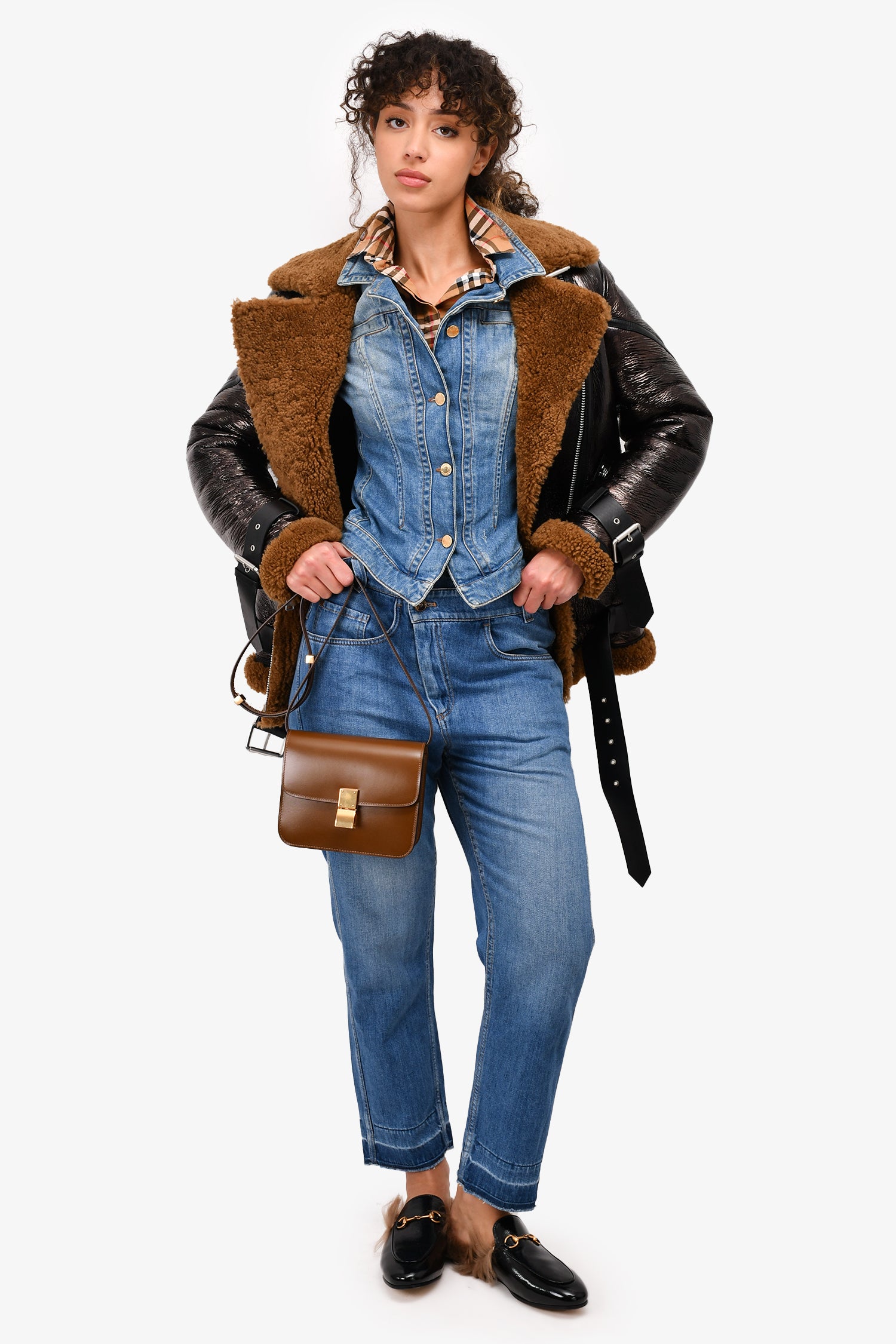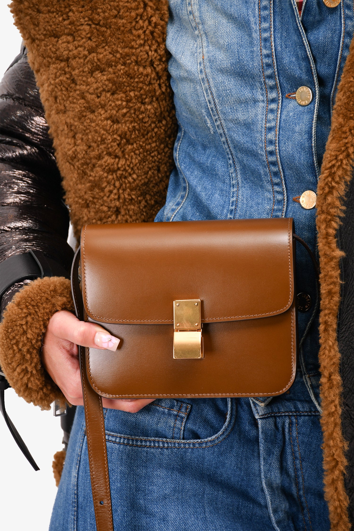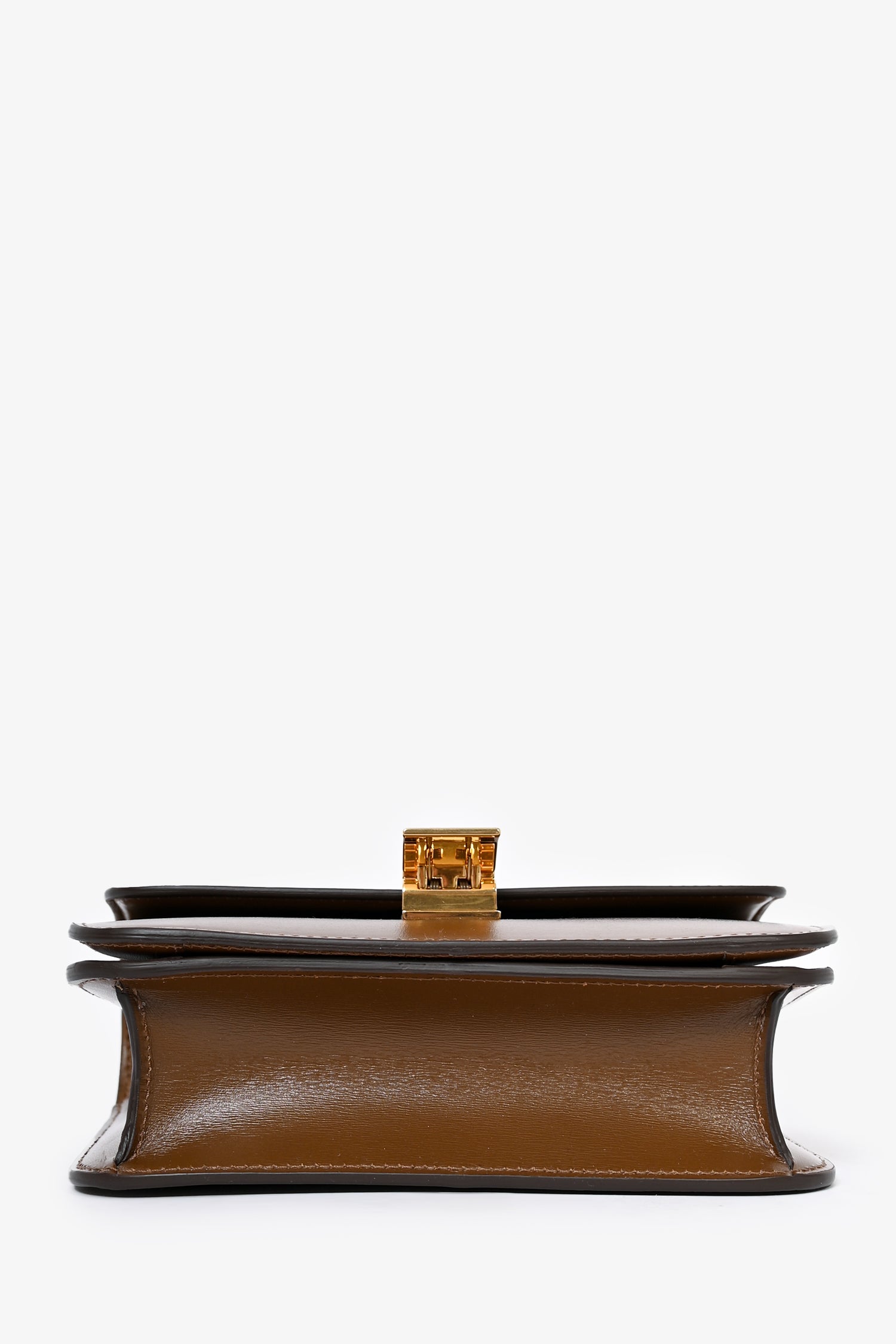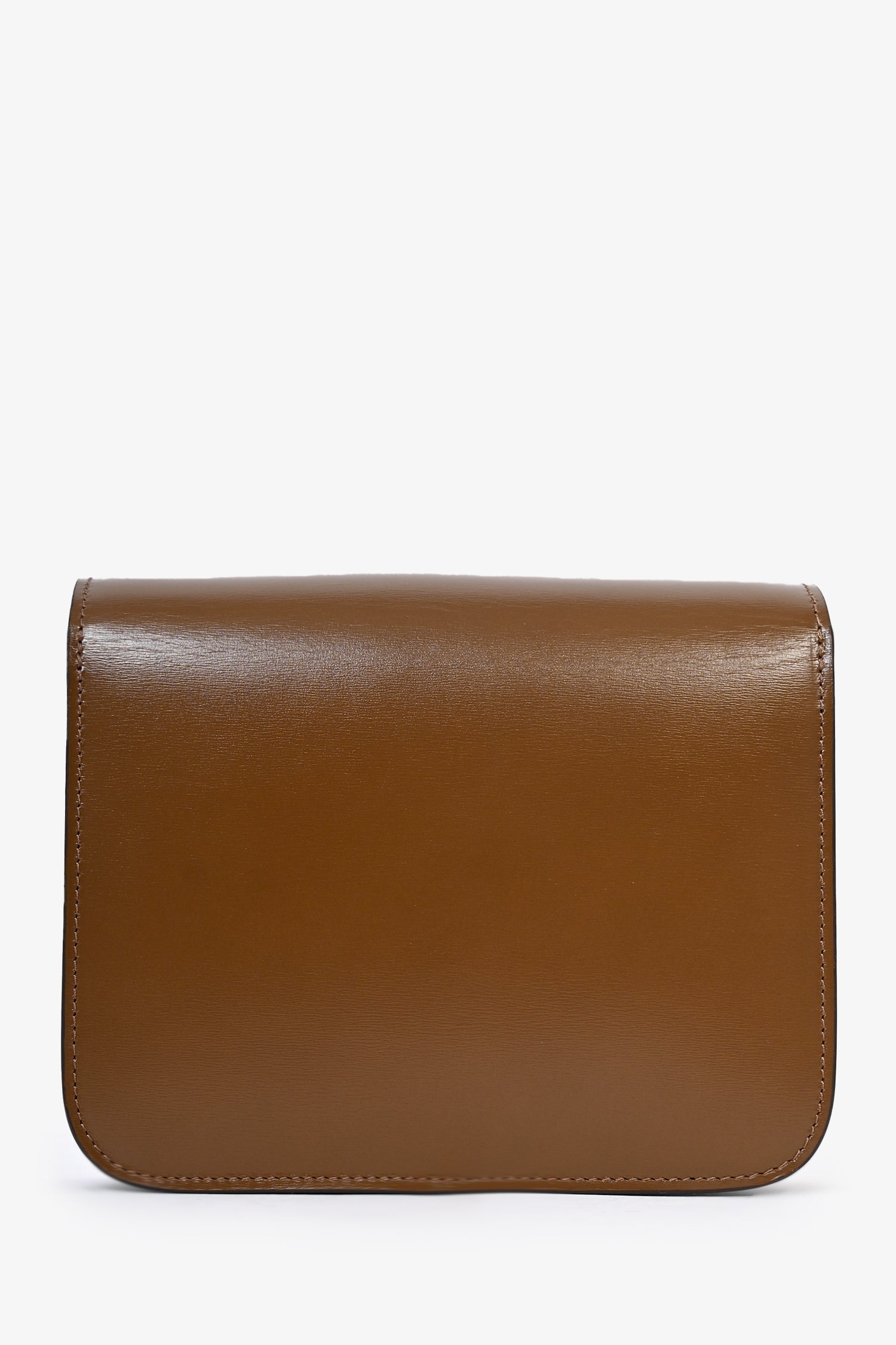 Refresh availabilityCeline Brown Leather Teen Box Bag. Front fold-over flap with push-lock closure. 2 interior compartments; separated by a divider. Single interior wall slip pocket. Removable and adjustable strap. Gold-tone hardware.