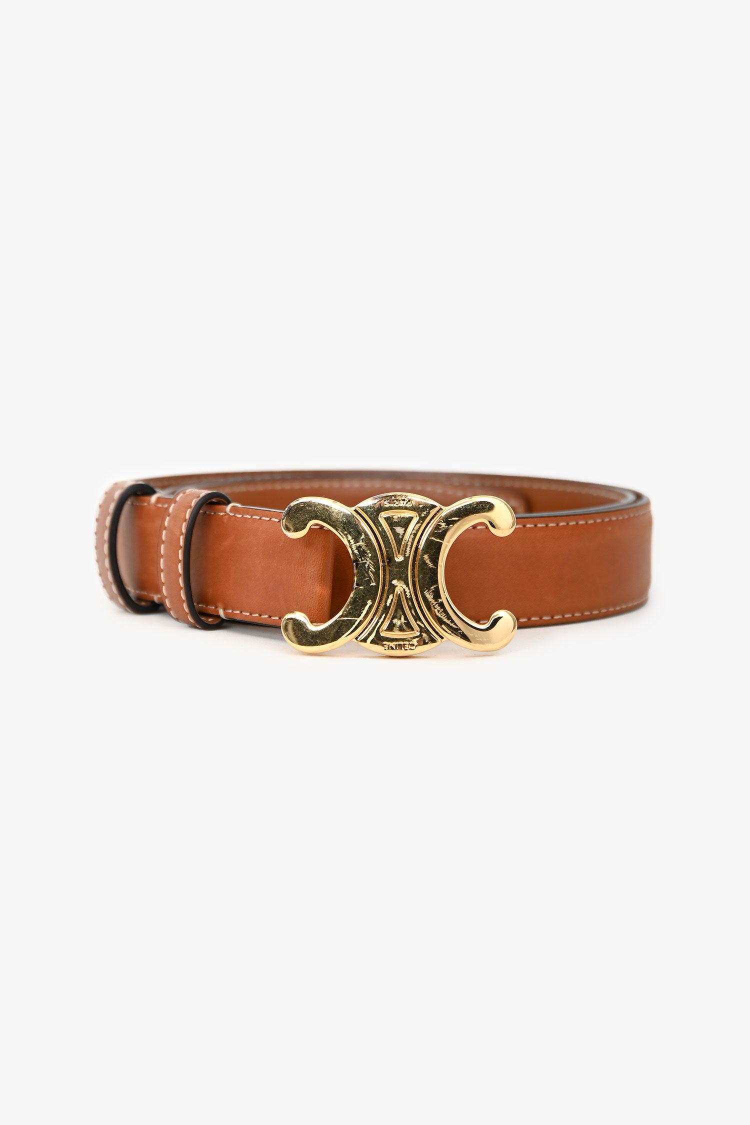 Refresh availabilityCeline Brown Leather Triomphe Belt. Push-tab buckle closure. Gold-tone hardware. Contrast stitching.