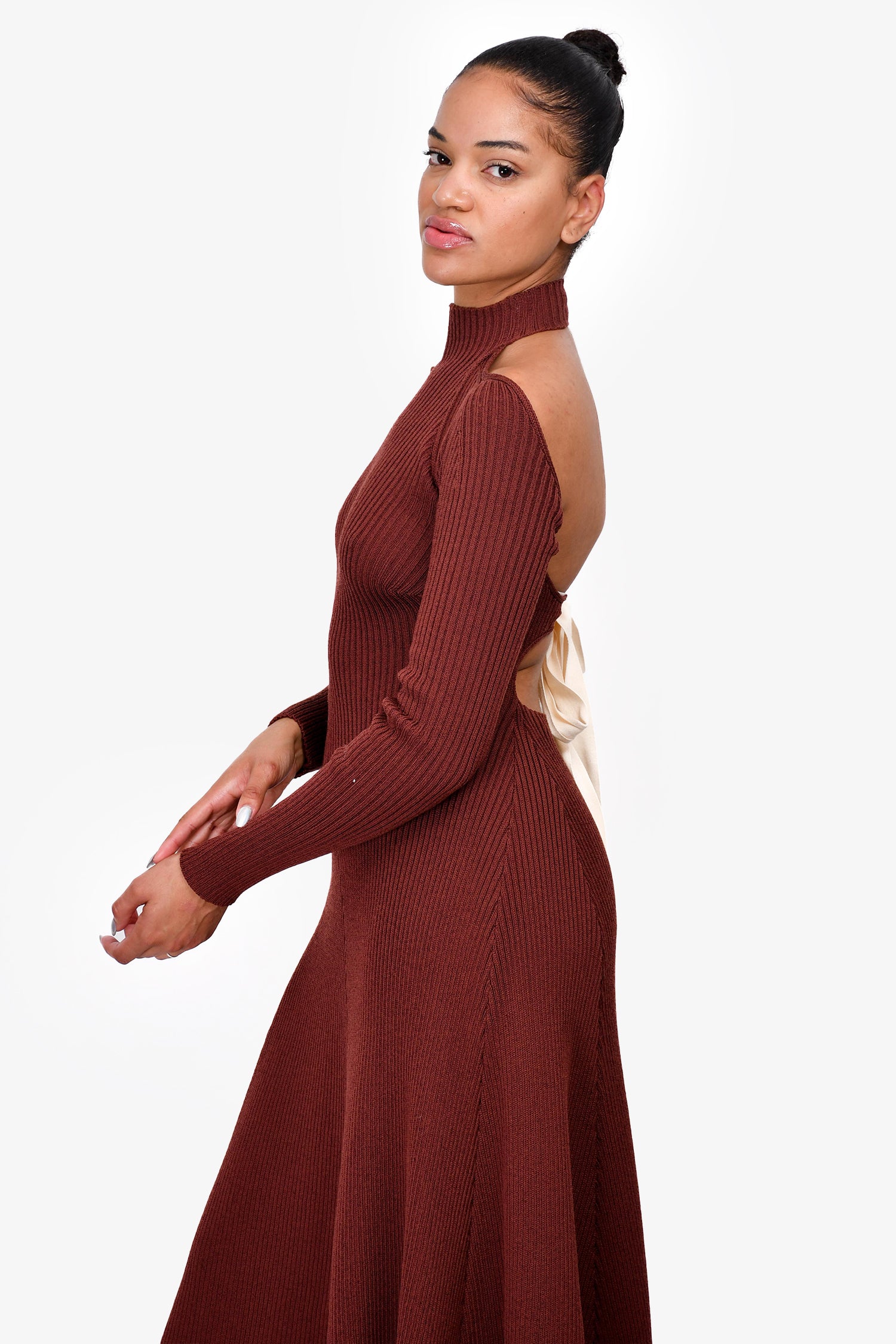 Refresh availabilityCeline Brown Open Back Knit Midi Dress. Pull-on. Mockneck. Rear tie-up closure.