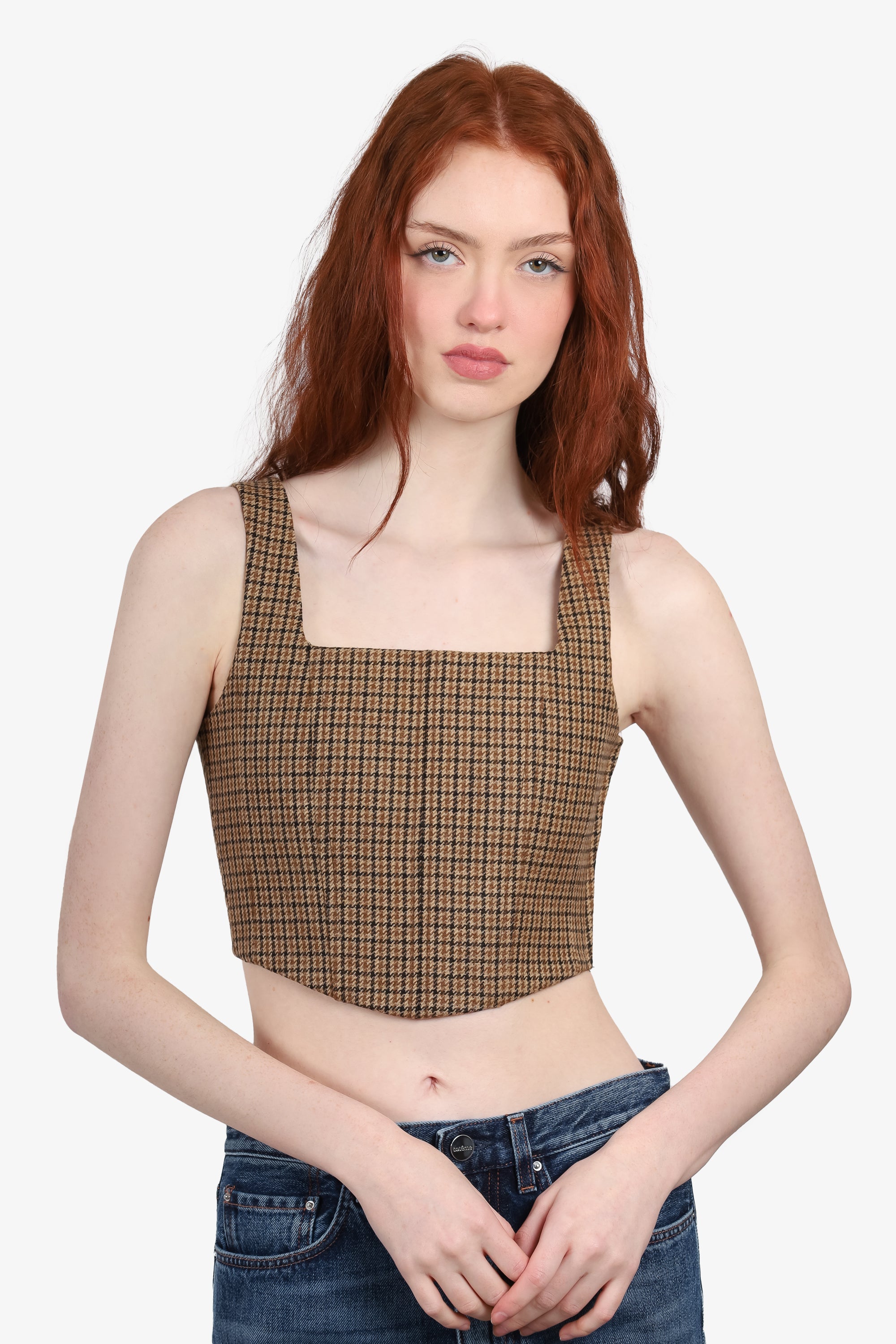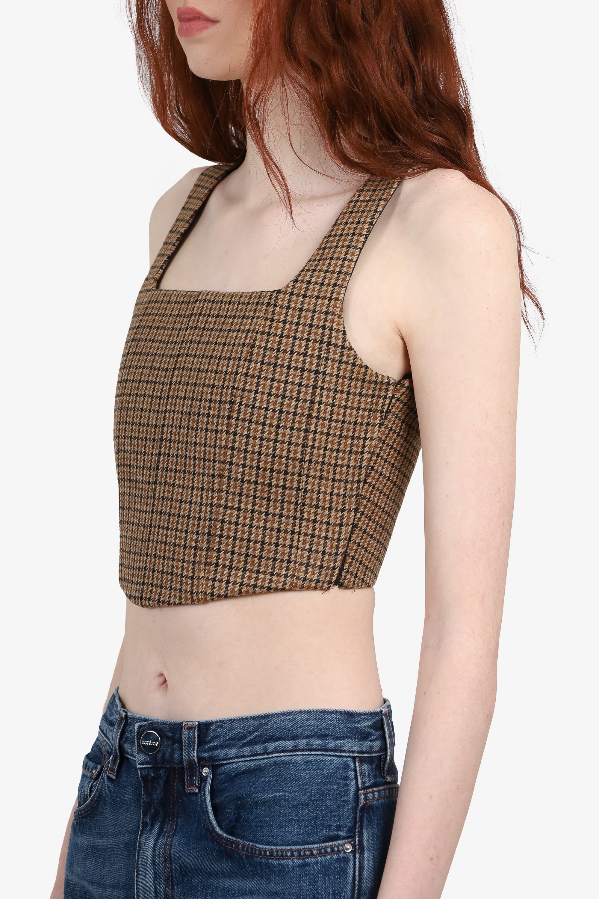 Refresh availabilityCeline Brown Plaid Cropped Tank Top. Side zipper closure. Square neck. Lined. Tonal stitching.