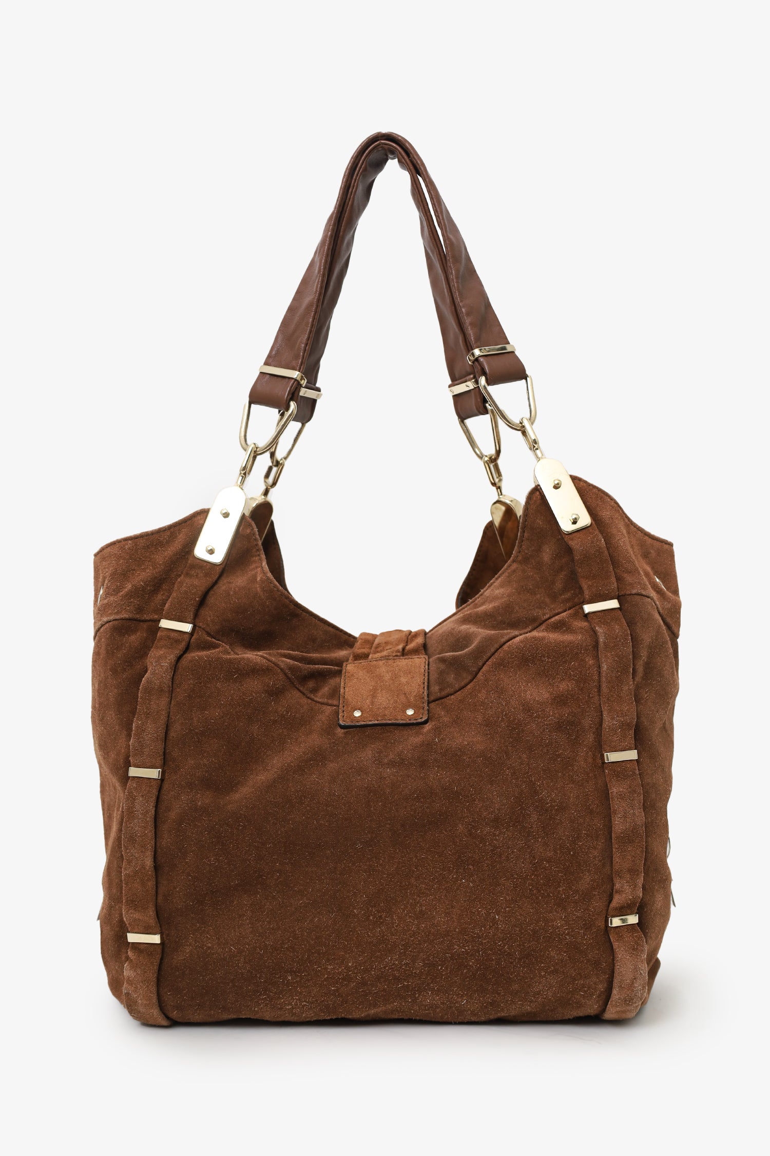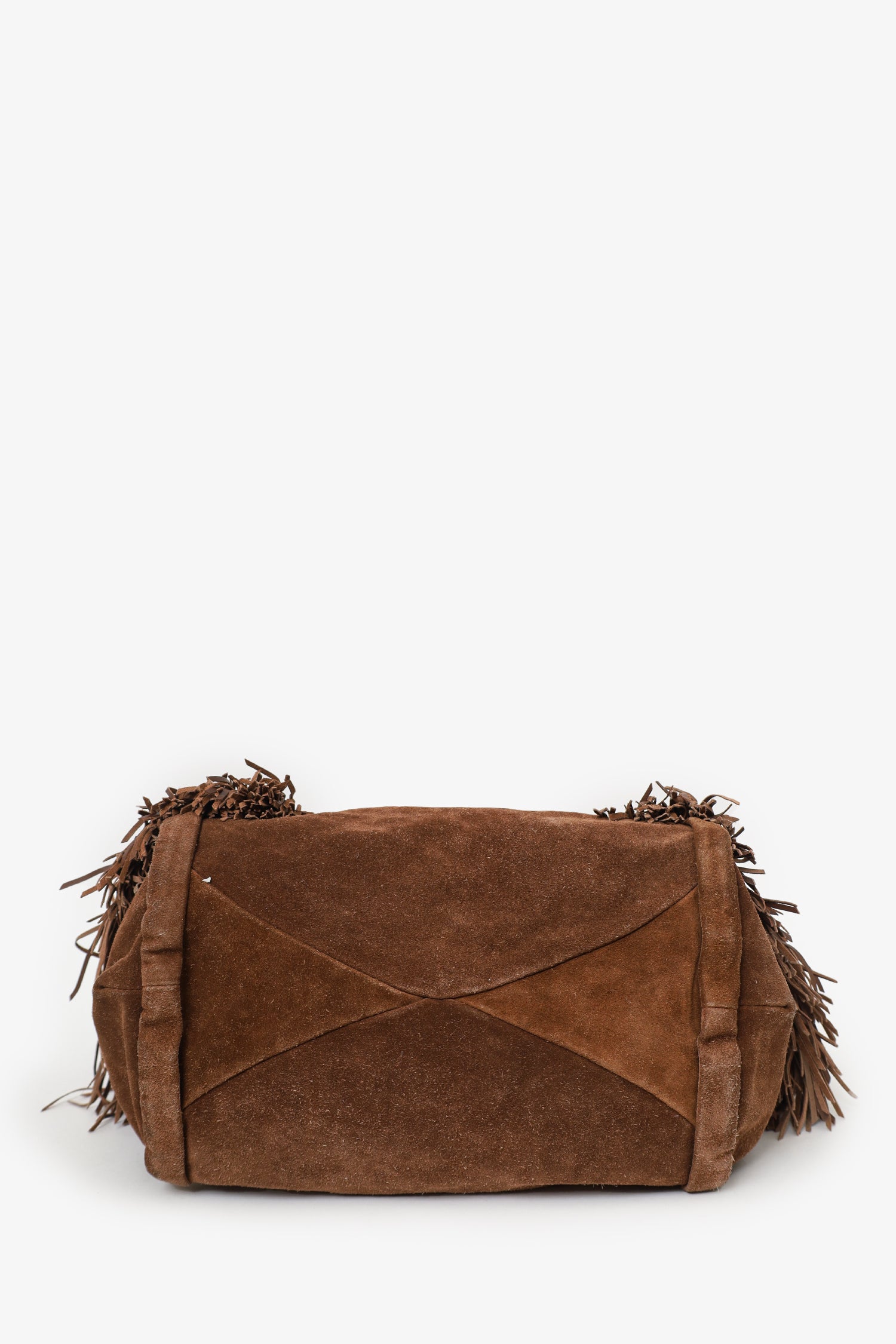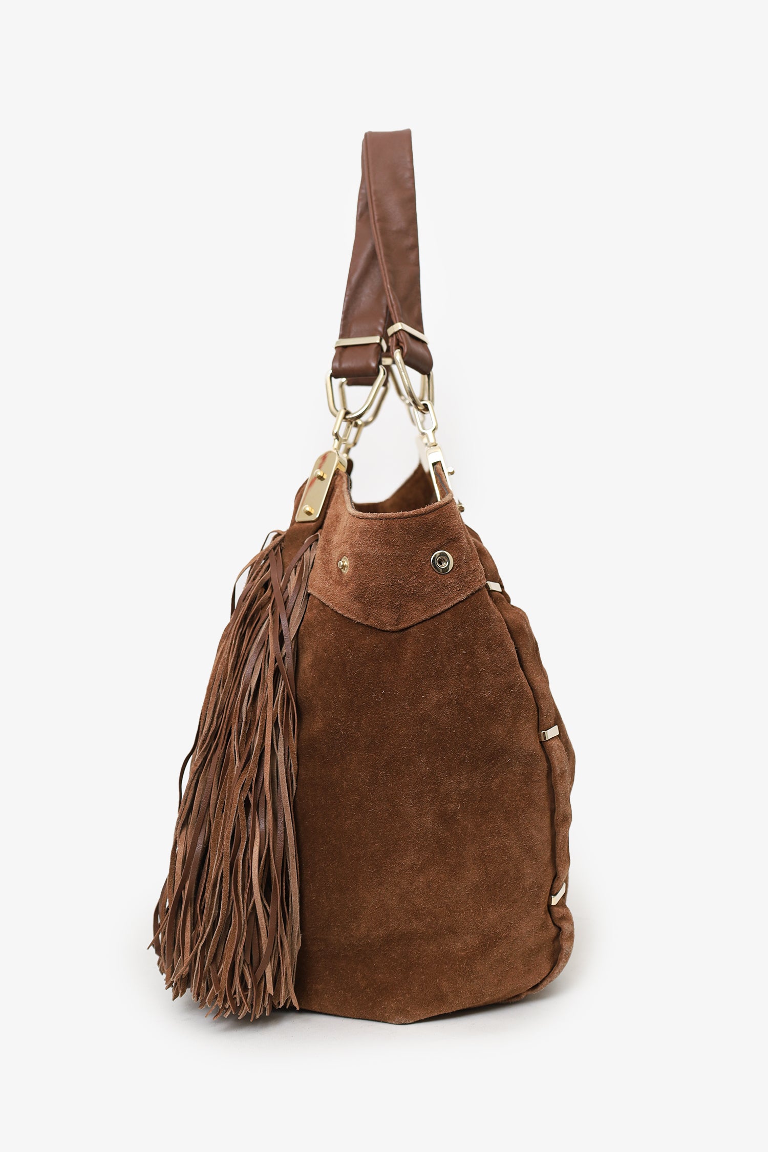 Refresh availabilityCeline Brown Suede Fringed Dimitri Hobo. Top fold-over flap with push-lock closure. Twin straps. Lined interior. 3 interior pockets; 2 slip and 1 zip. Gold-tone hardware. Tonal stitching.