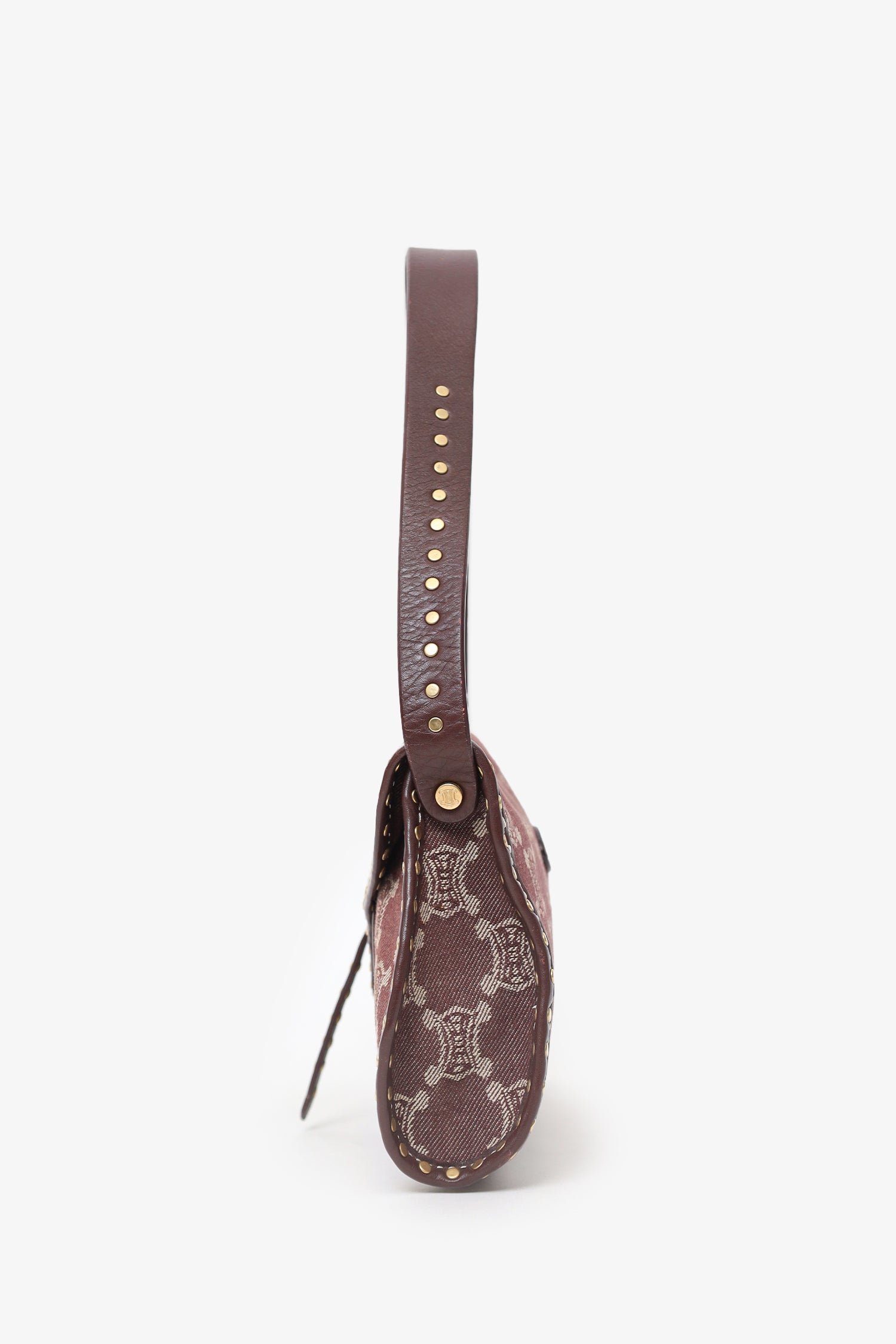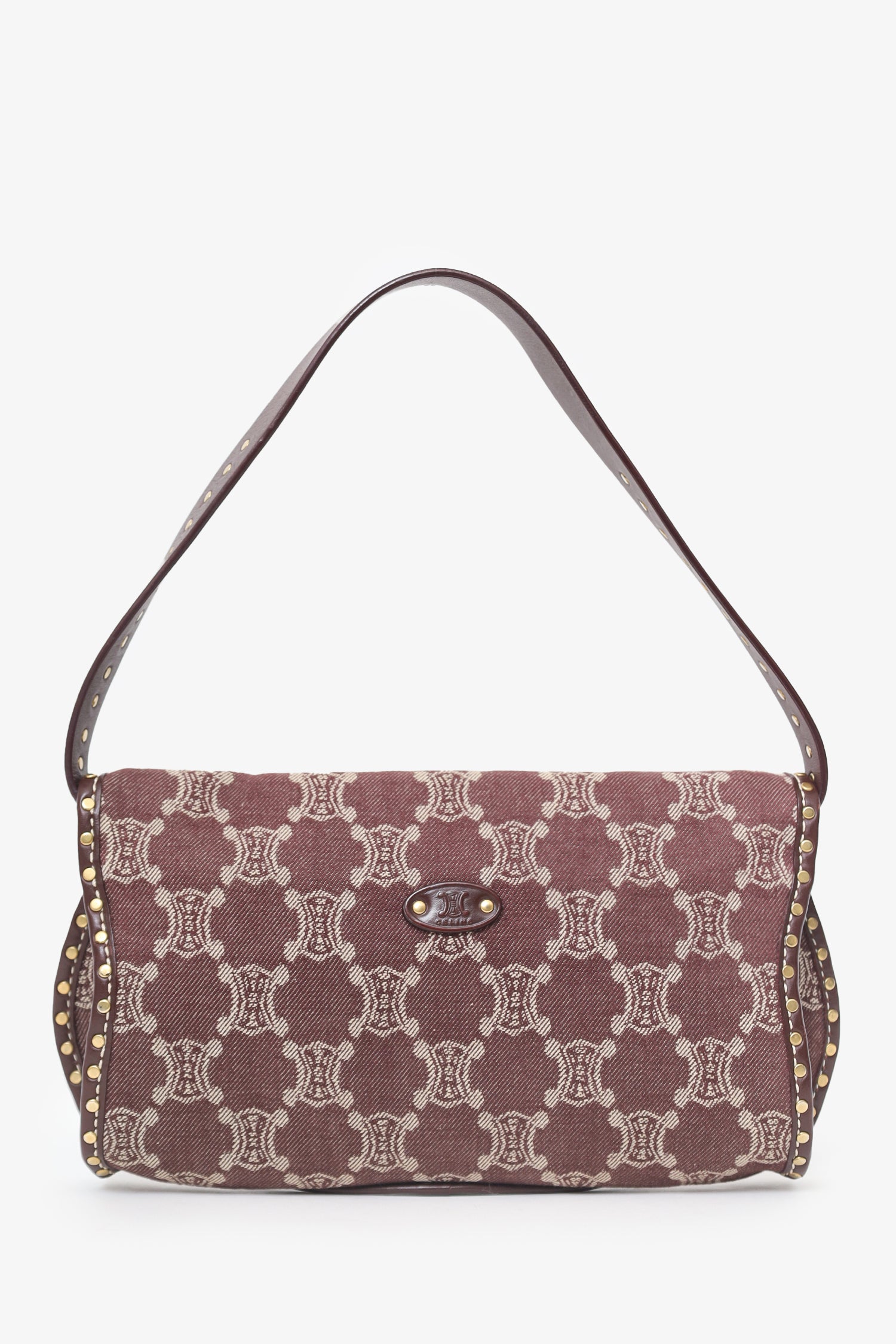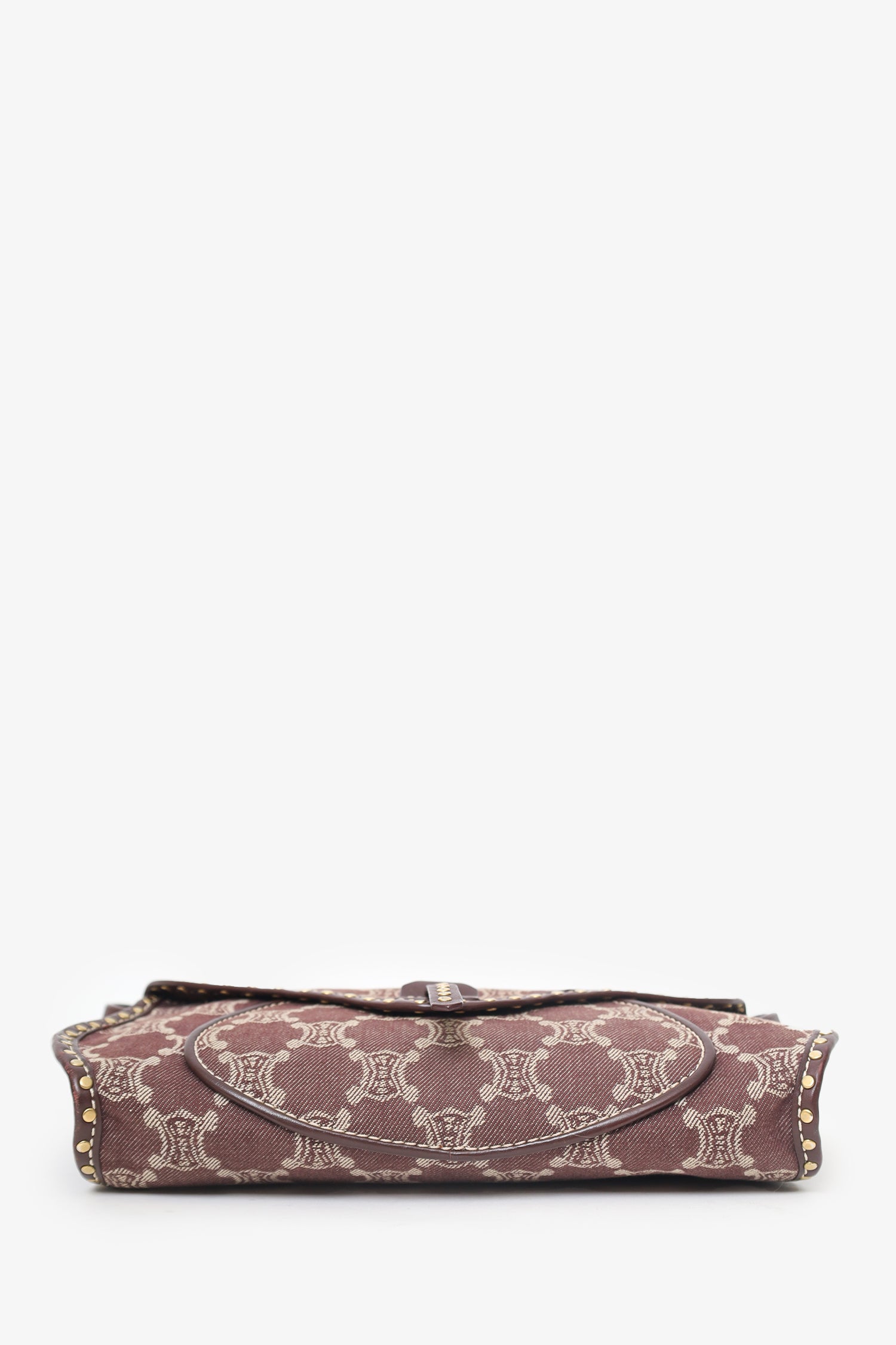 Refresh availabilityCeline Brown Triomphe Denim Poulbot Bag. Front fold-over flap with snap-button closure. Shoulder strap. Lined interior with 2 pockets; 1 slip and 1 button-up. Brass-tone hardware. Contrast stitching.
