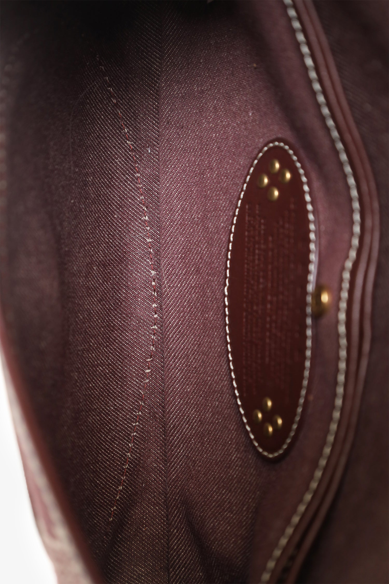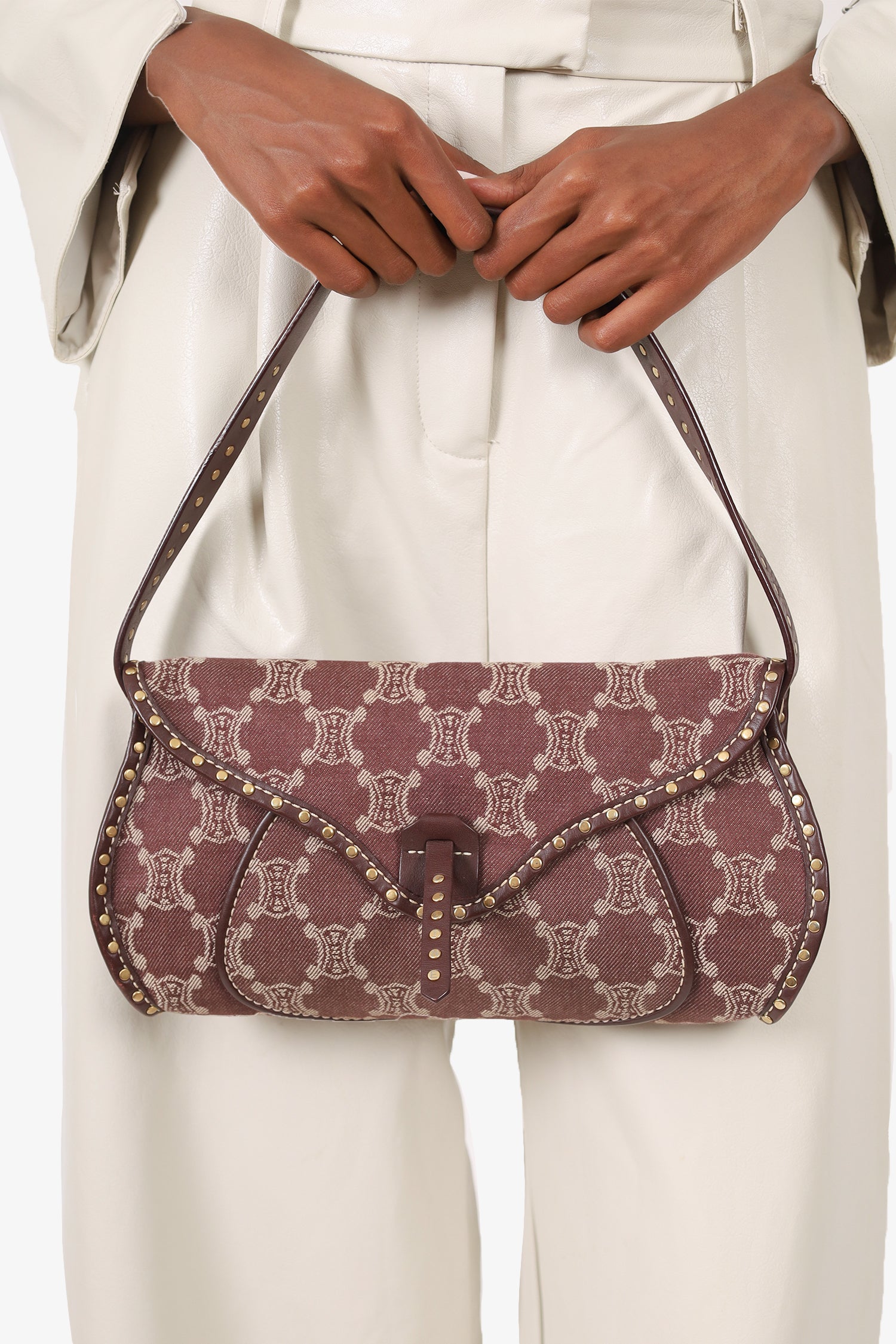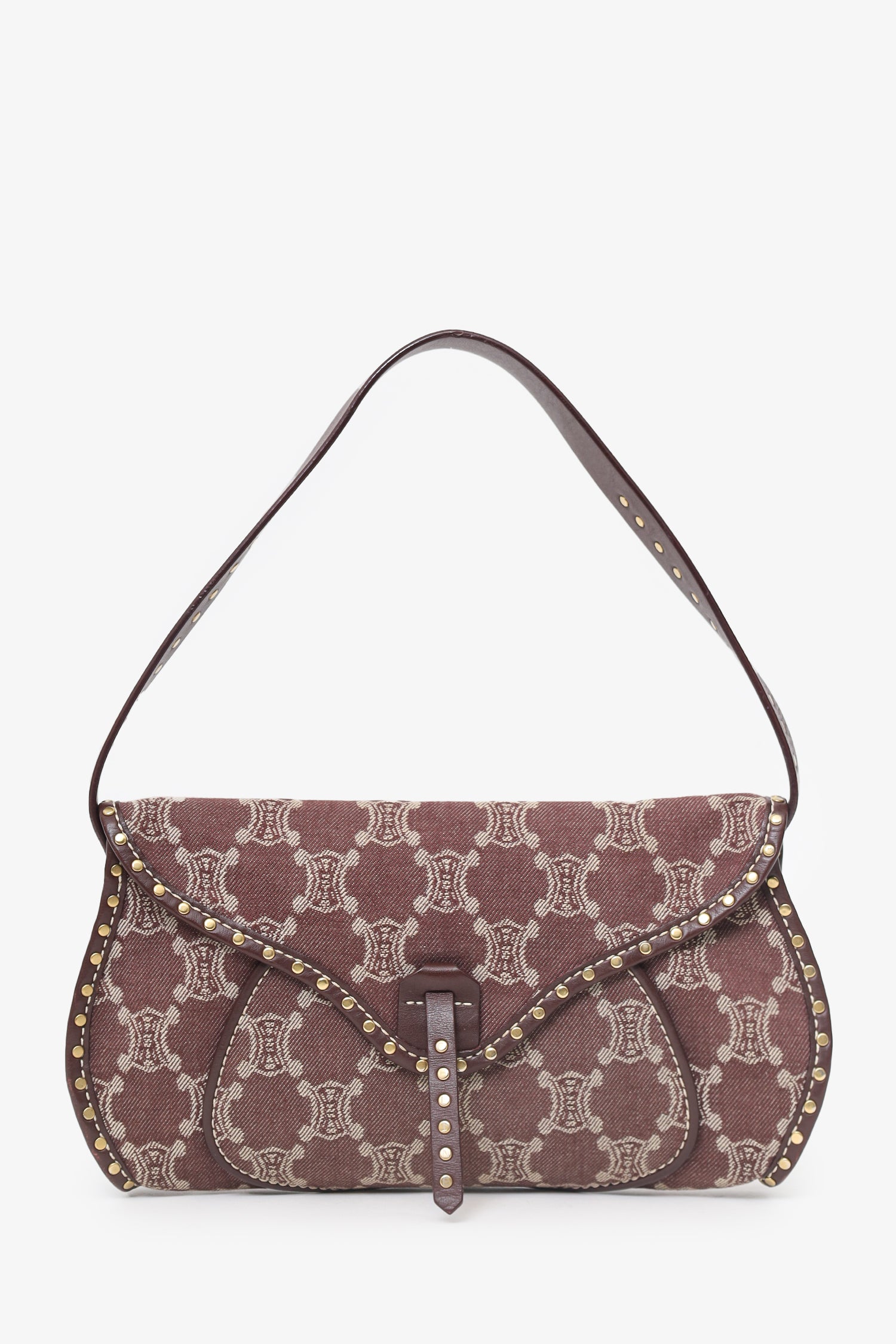 Refresh availabilityCeline Brown Triomphe Denim Poulbot Bag. Front fold-over flap with snap-button closure. Shoulder strap. Lined interior with 2 pockets; 1 slip and 1 button-up. Brass-tone hardware. Contrast stitching.