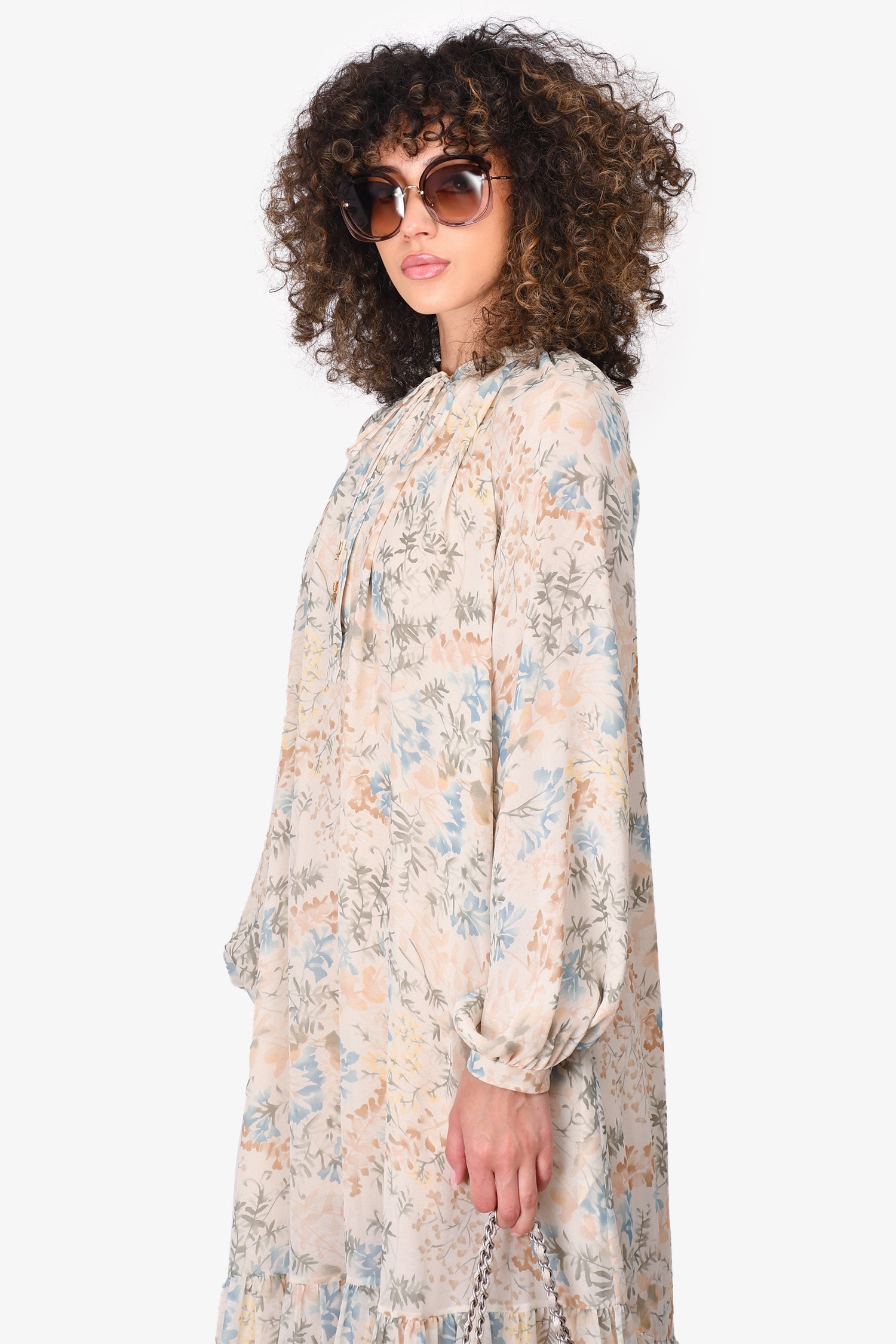 Celine Cream/Green Silk Floral Printed Ruffle Hem Dress Size 38