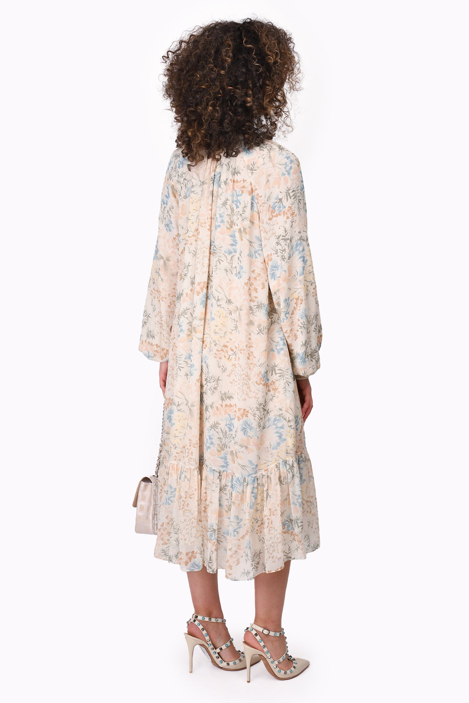 Refresh availabilityCeline Cream/Green Silk Floral Printed Ruffle Hem Dress. V-neck with button-up closure. Button closure on the cuffs. Lined.