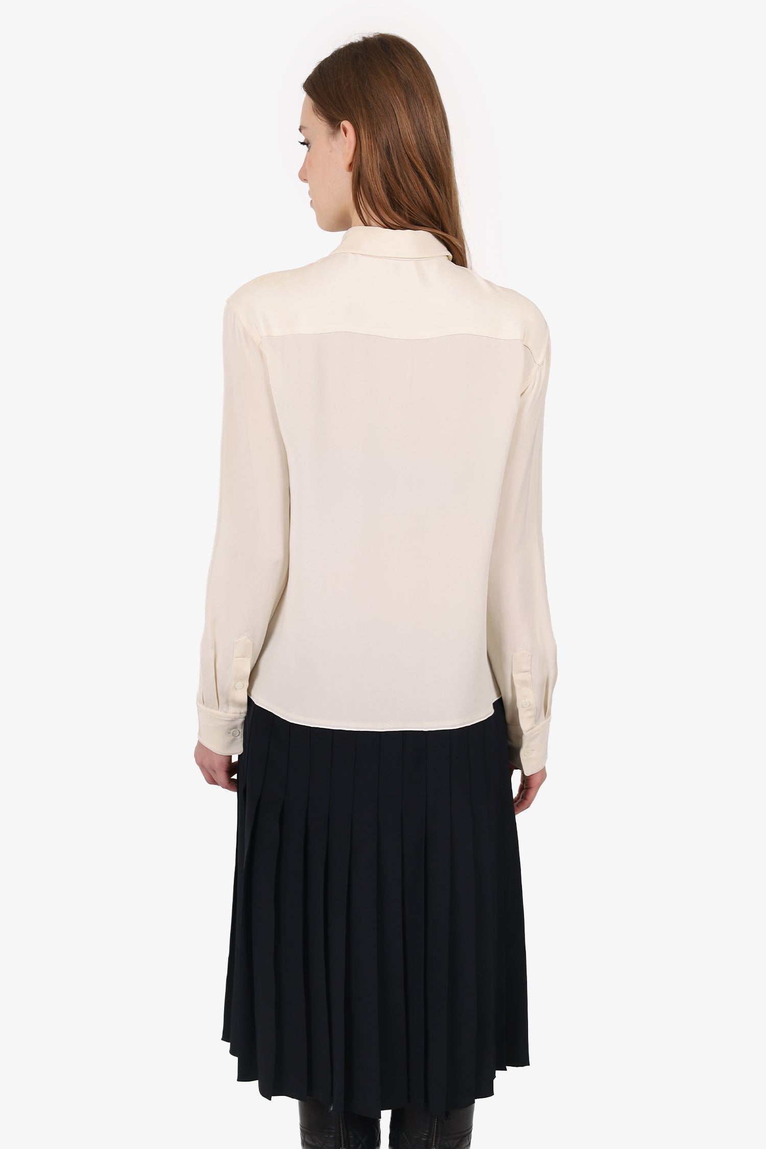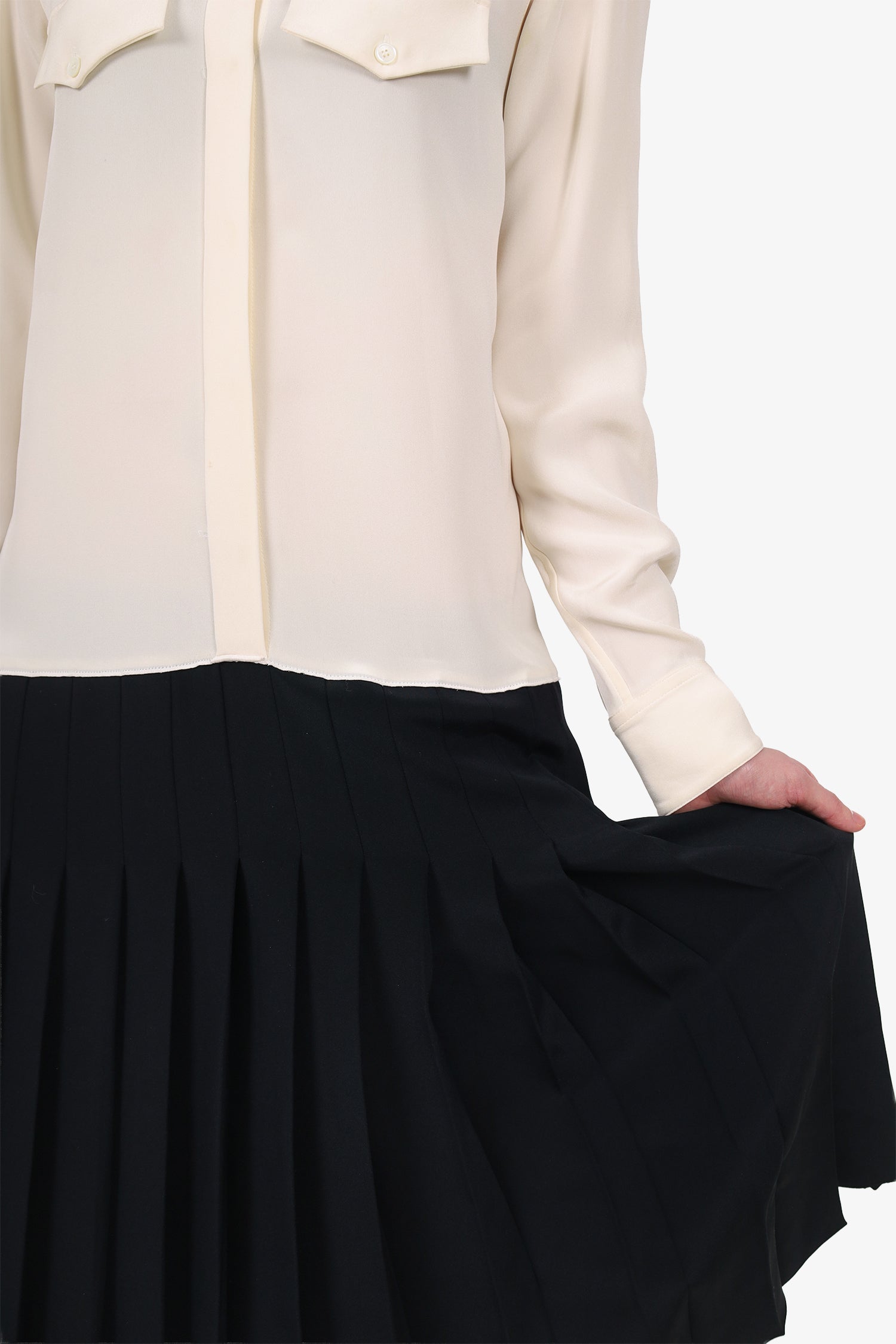 Refresh availabilityCeline Cream/Black Silk Button Up Pleated Dress. Slip-on. Collared neckline. Front button-up closure. Sleeve cuffs with button-up closure. 2 exterior chest-fold-over-flap pockets. Tonal stitching.