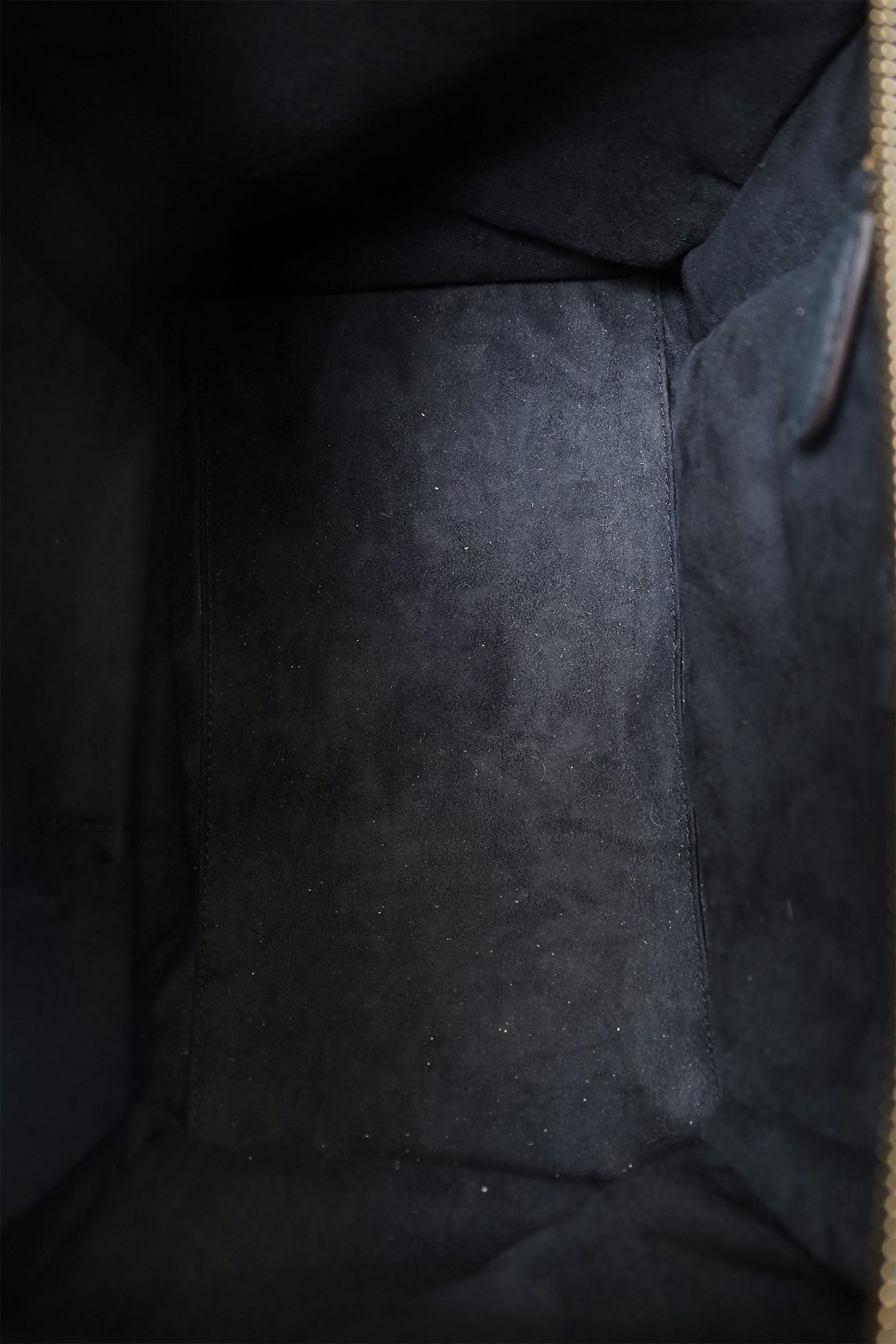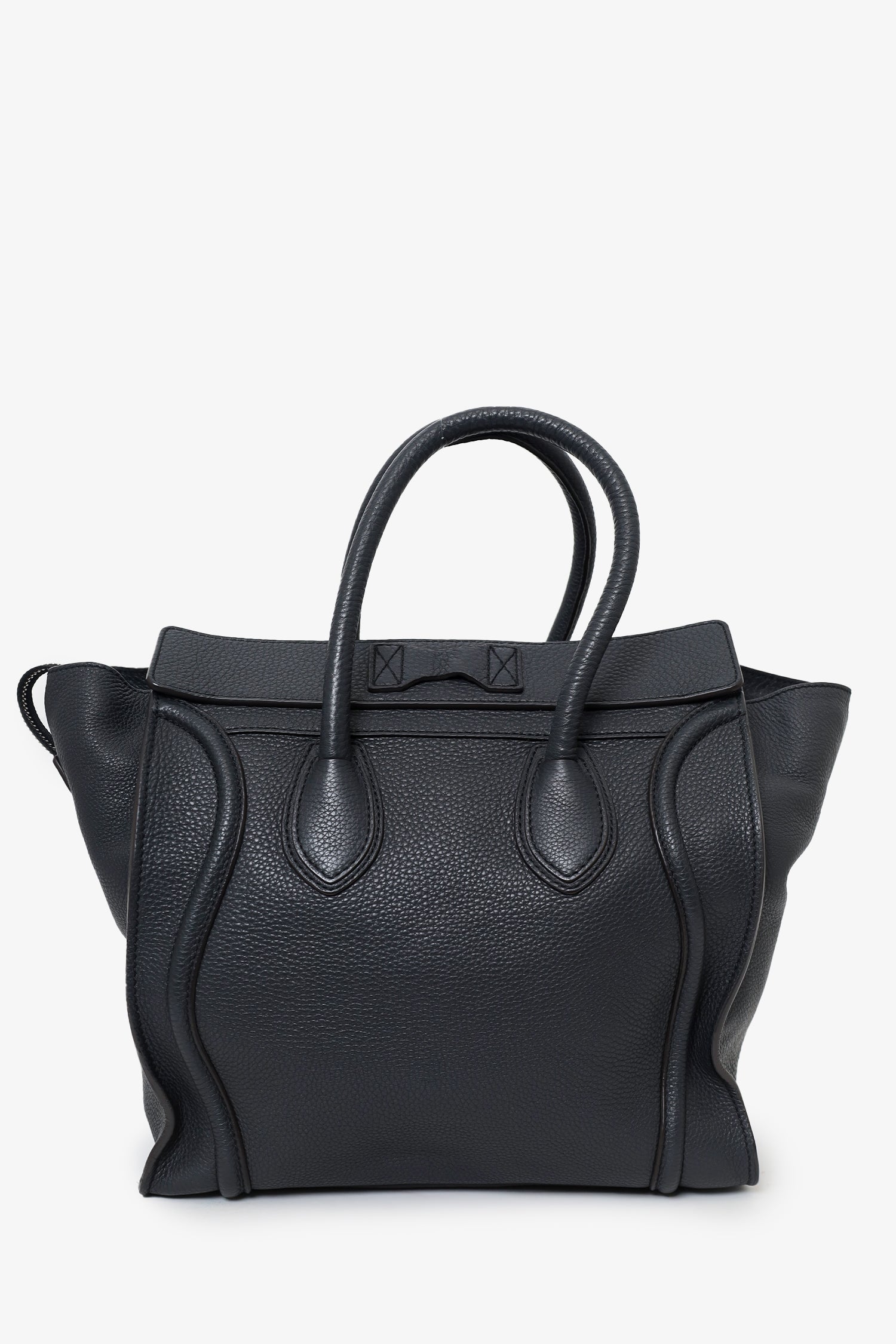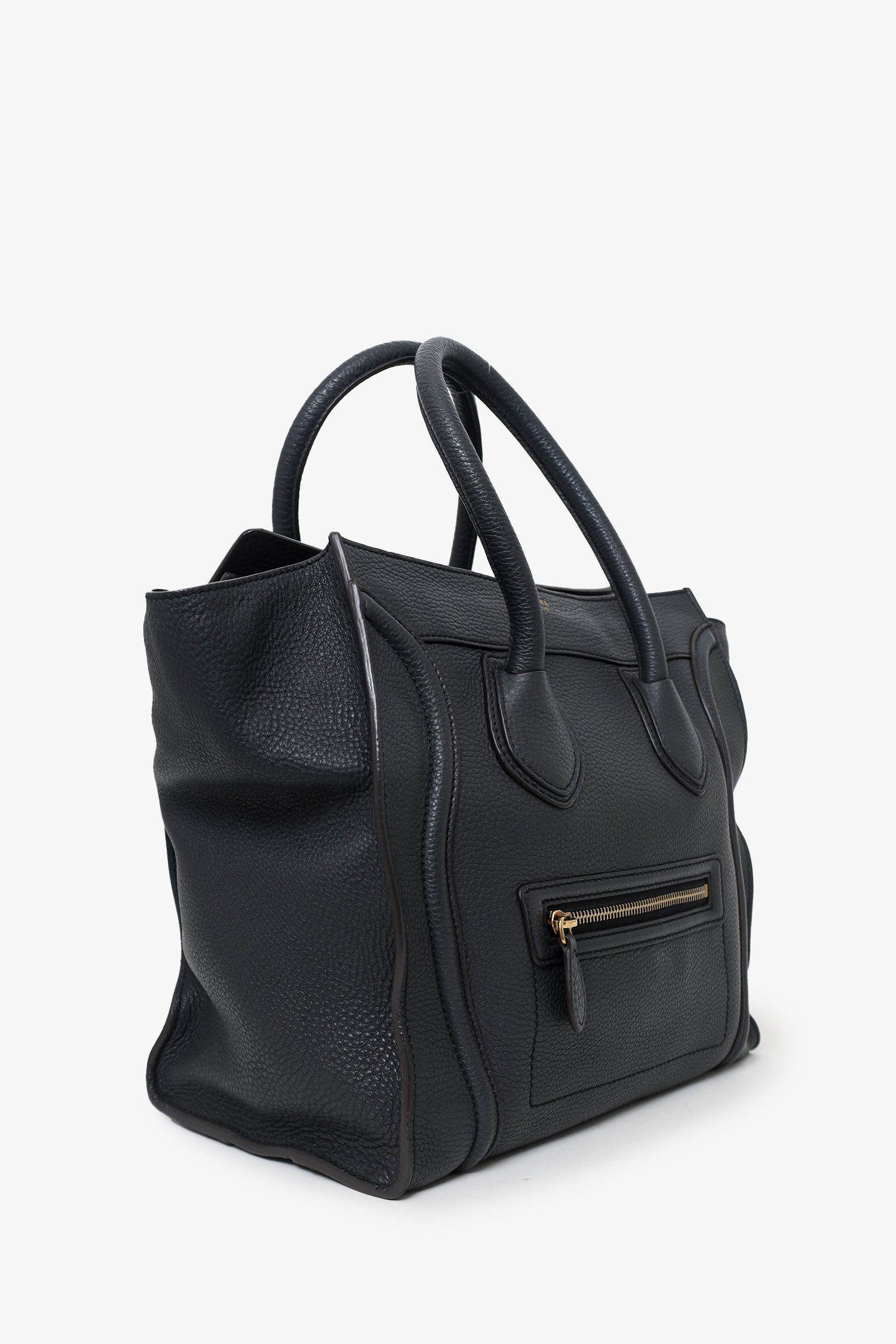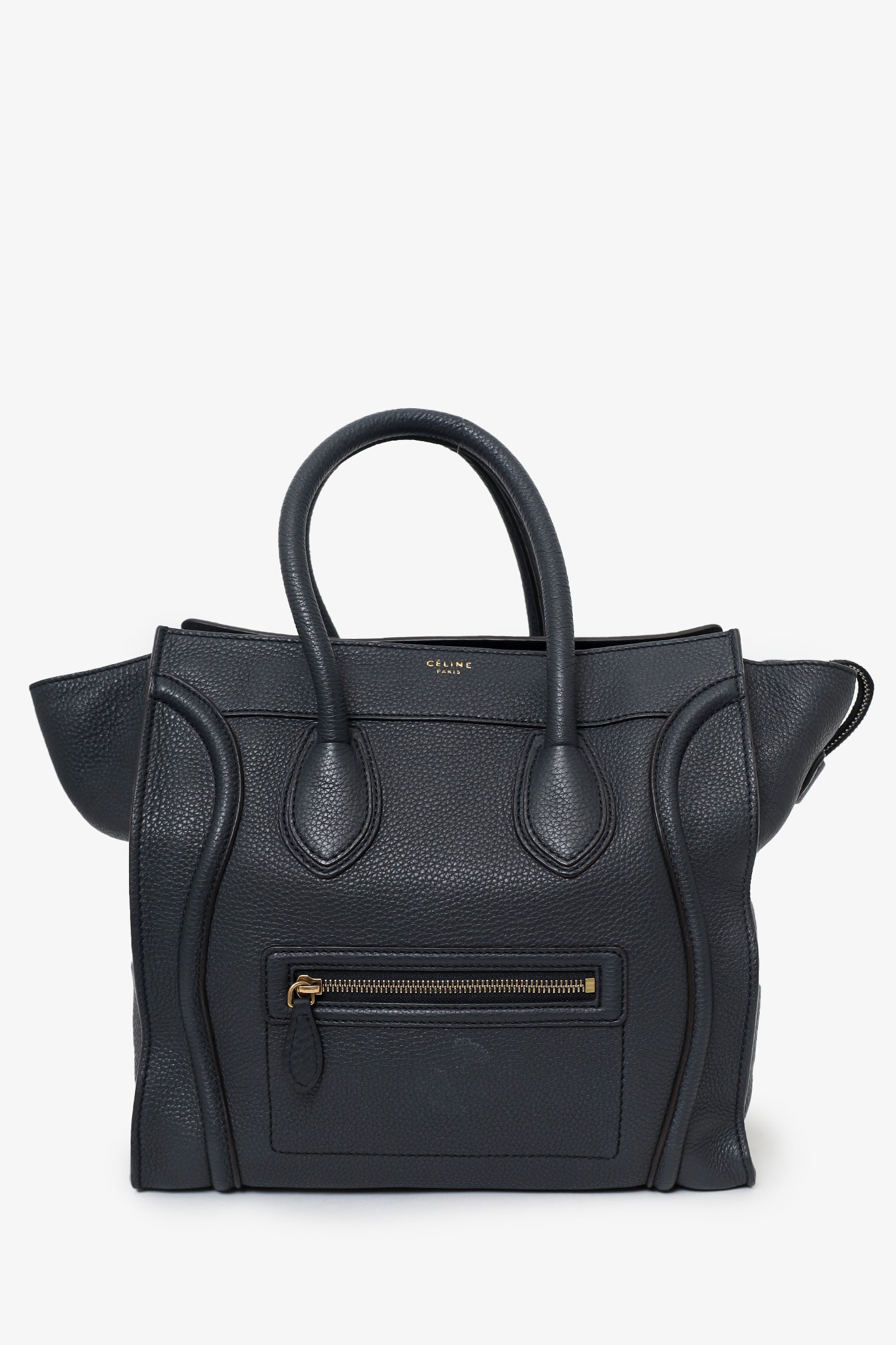 Refresh availabilityCeline Dark Grey Grained Leather Mini Luggage Tote. Top zip closure. Twin top handles. Single exterior zip pocket. Suede-lined interior. 3 interior pockets; 2 slip and 1 zip. Gold-tone hardware. Tonal stitching.