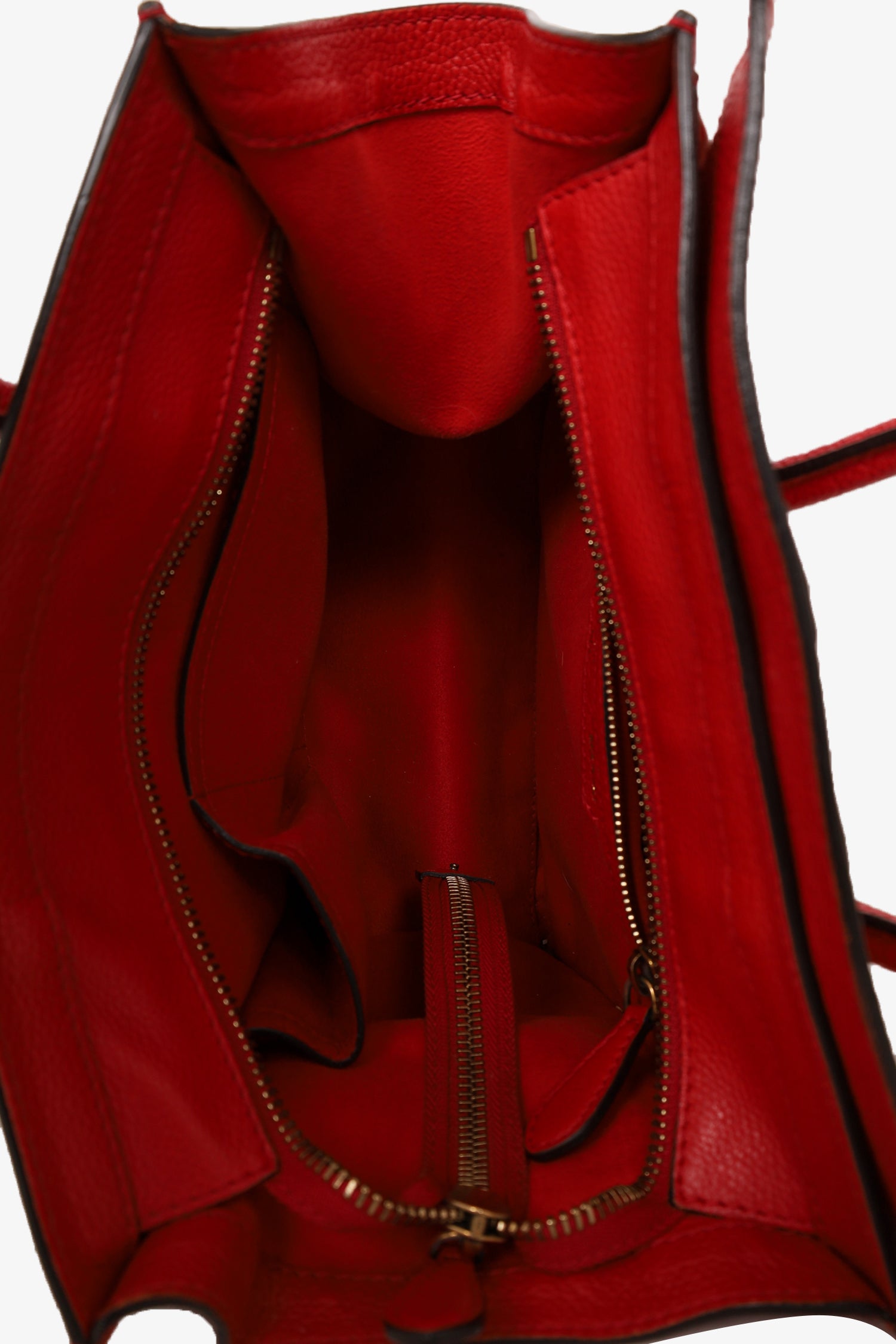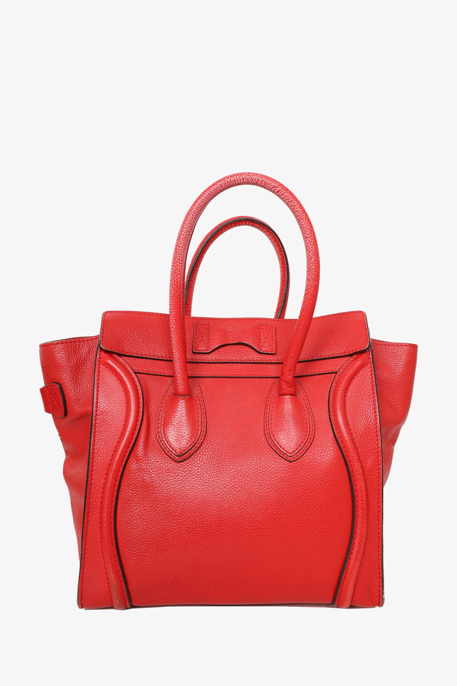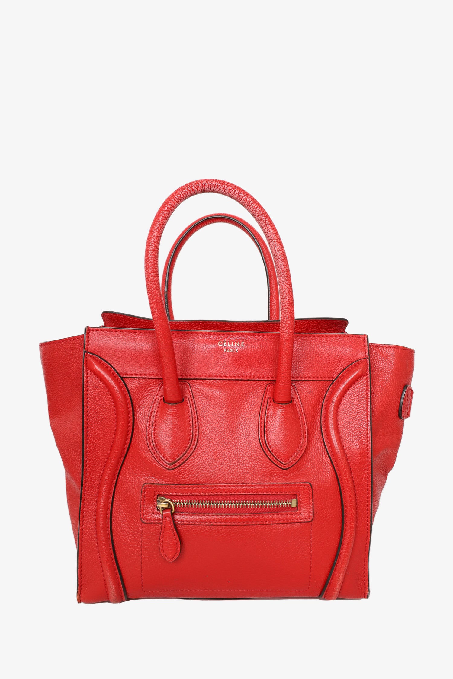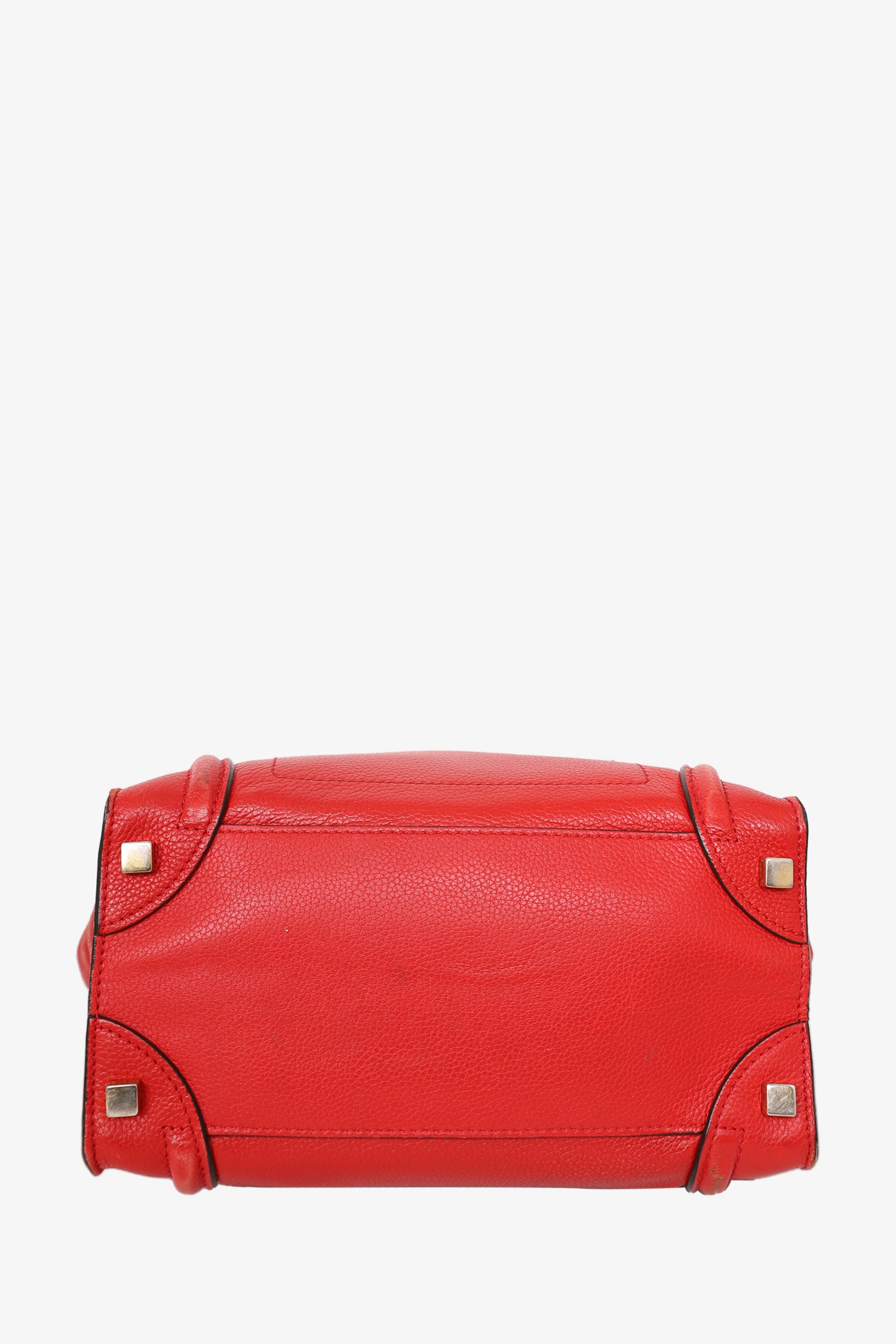 Refresh availabilityCeline Red Leather Mini Luggage Tote Bag. Top zip closure. 3 interior pockets; 1 zip closure pocket. 2 slip pockets. 1 exterior zip pocket. Gold-tone hardware. Tonal stitching.