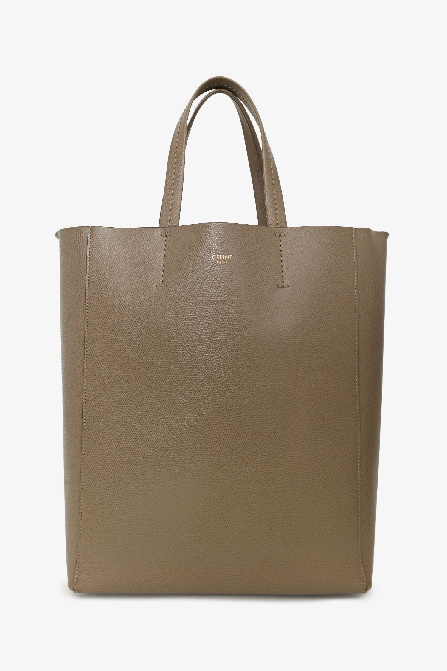 Refresh availabilityCeline Taupe Grained Calfskin Vertical Small 'Cabas' Tote with Strap. Open top. Dual handles. Adjustable crossbody strap. Suede-lined interior. Single interior wall flap with zip pocket. Gold-tone hardware. Tonal stitching.