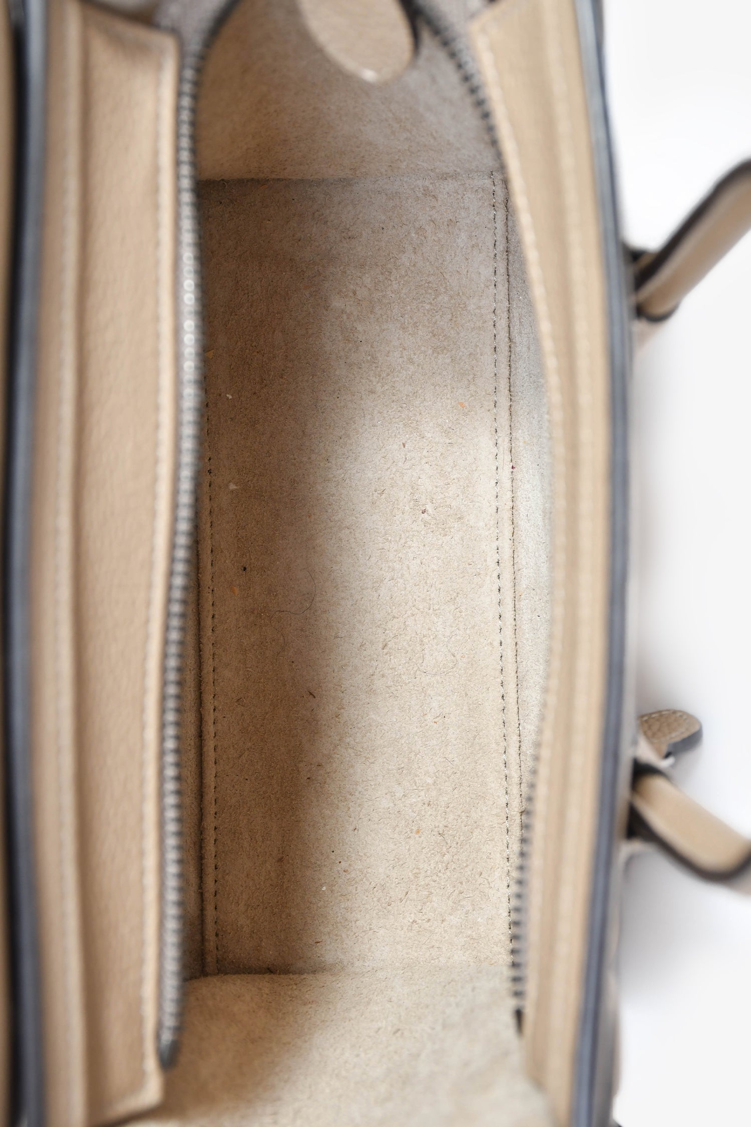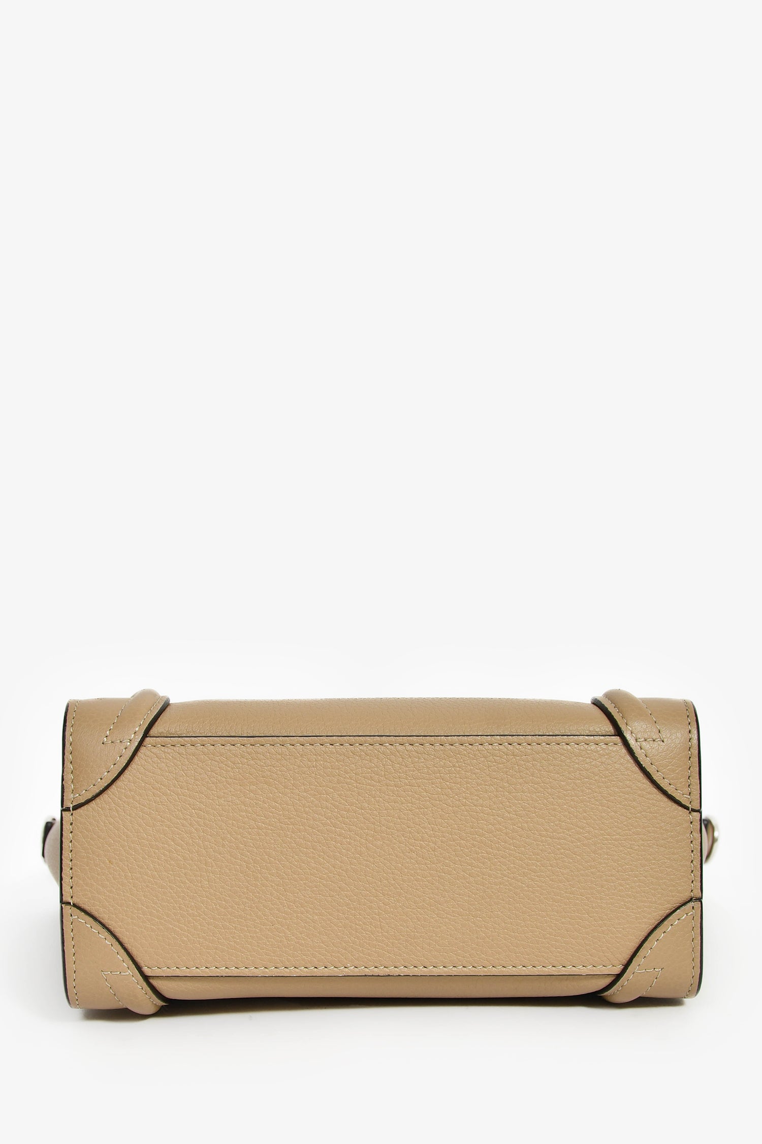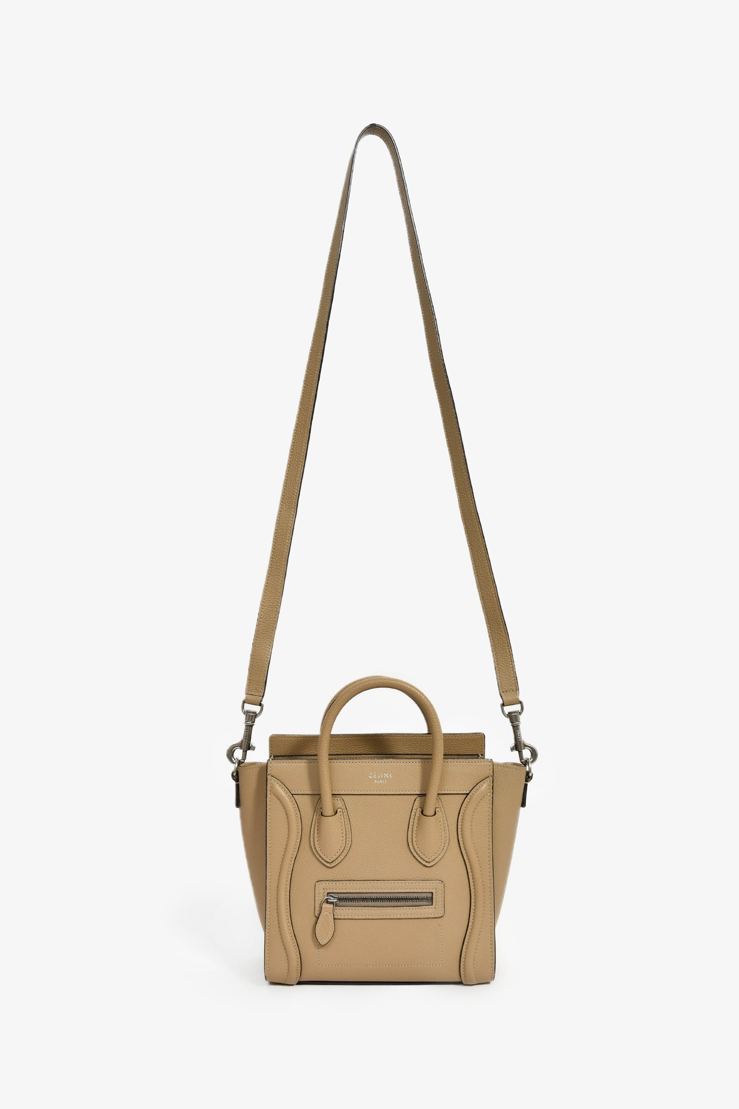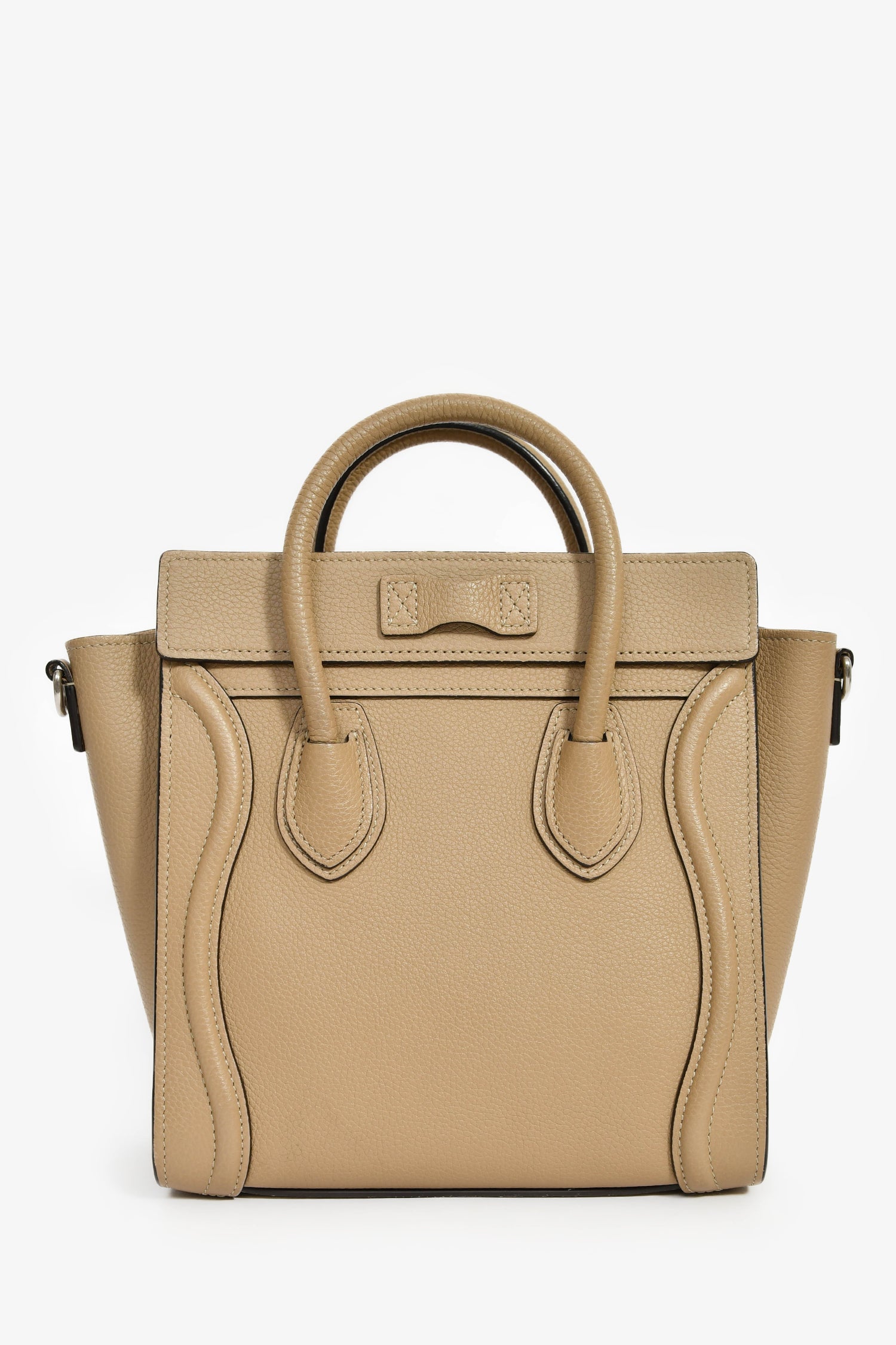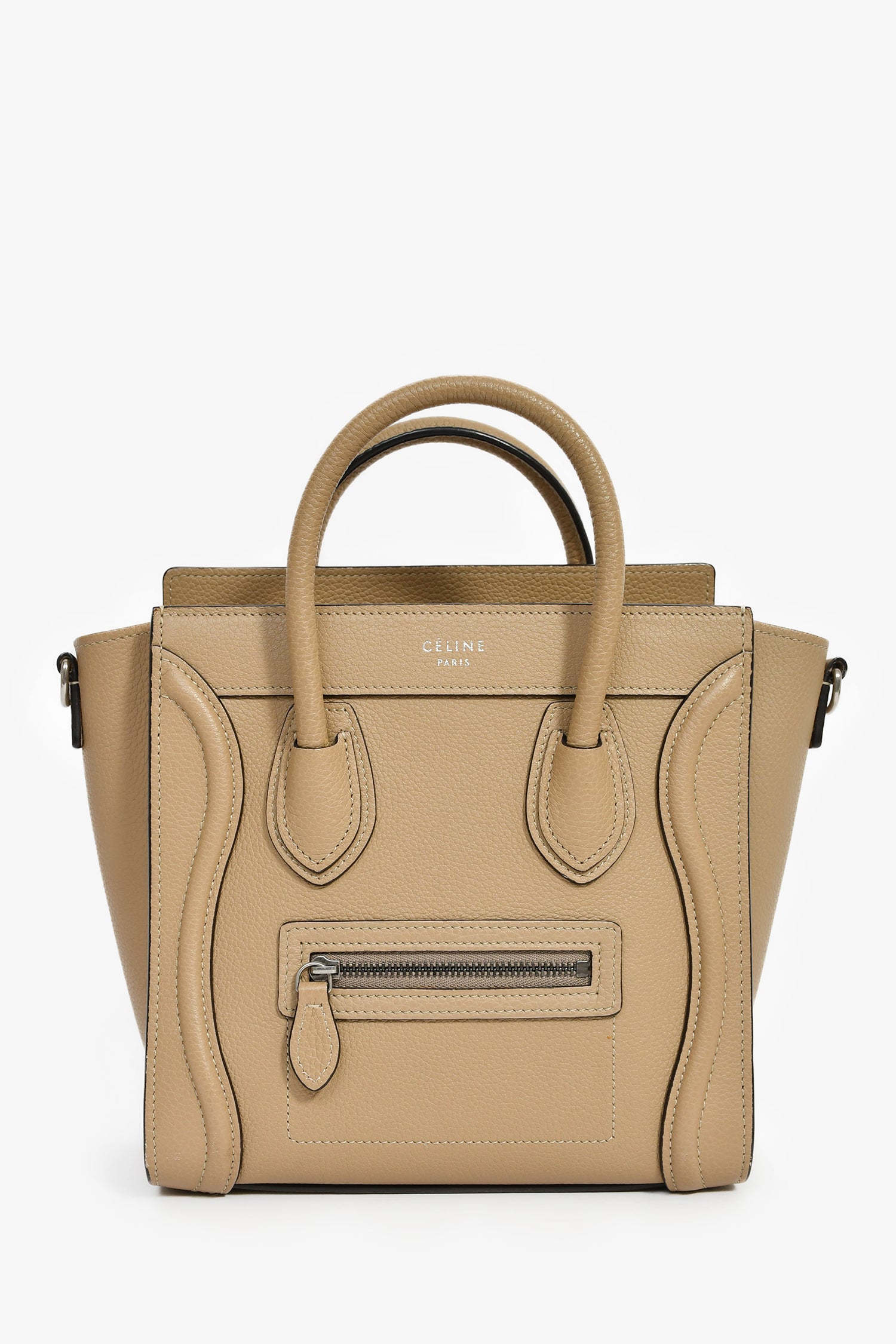 Refresh availabilityCeline Taupe Leather Nano Luggage Top Handle with Strap. Dual rolled handles. Top zip closure. Detachable strap (not adjustable). Single front exterior zip pocket. Lined interior. Single interior wall slip pocket. Silver-tone hardware. Tonal stitching.