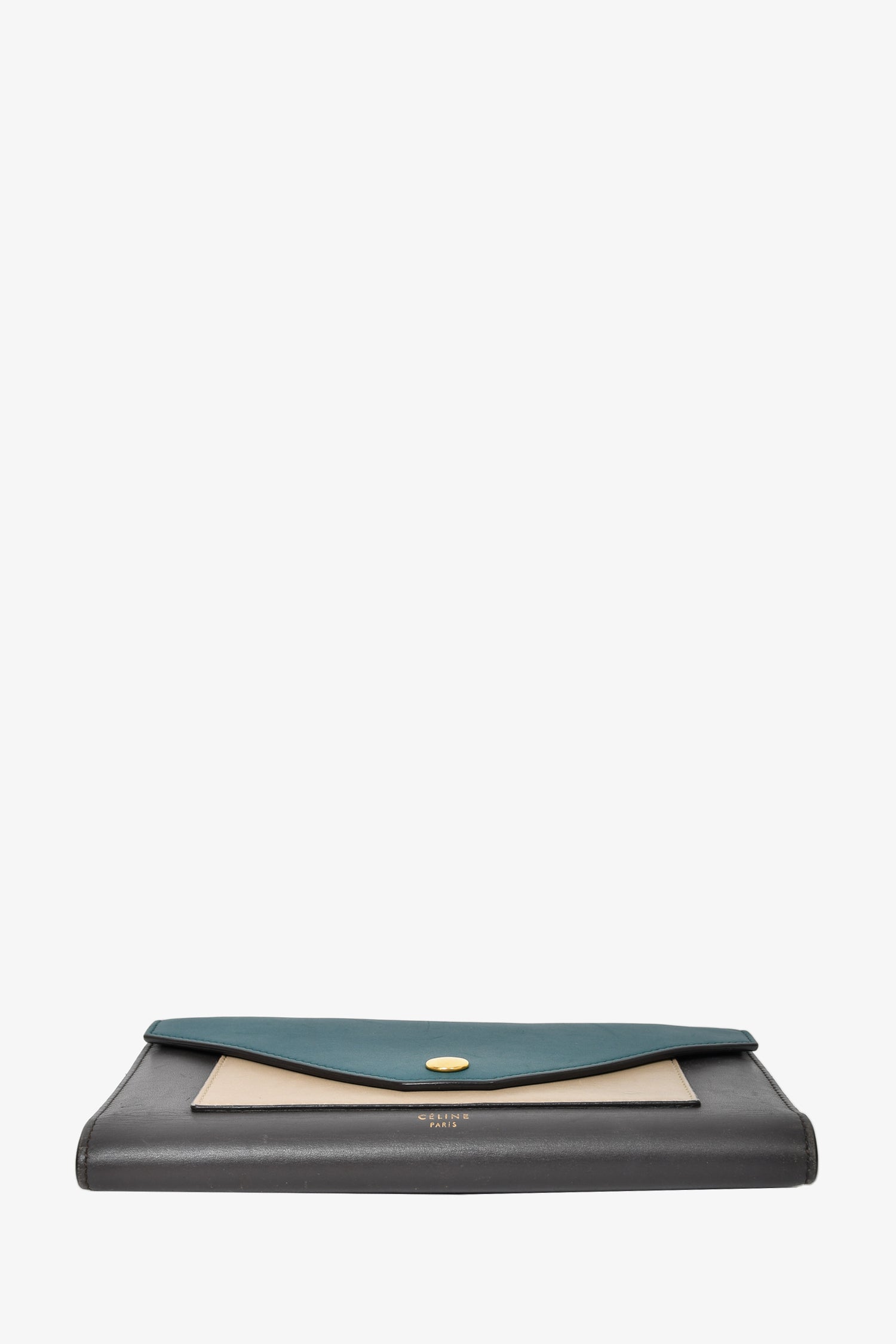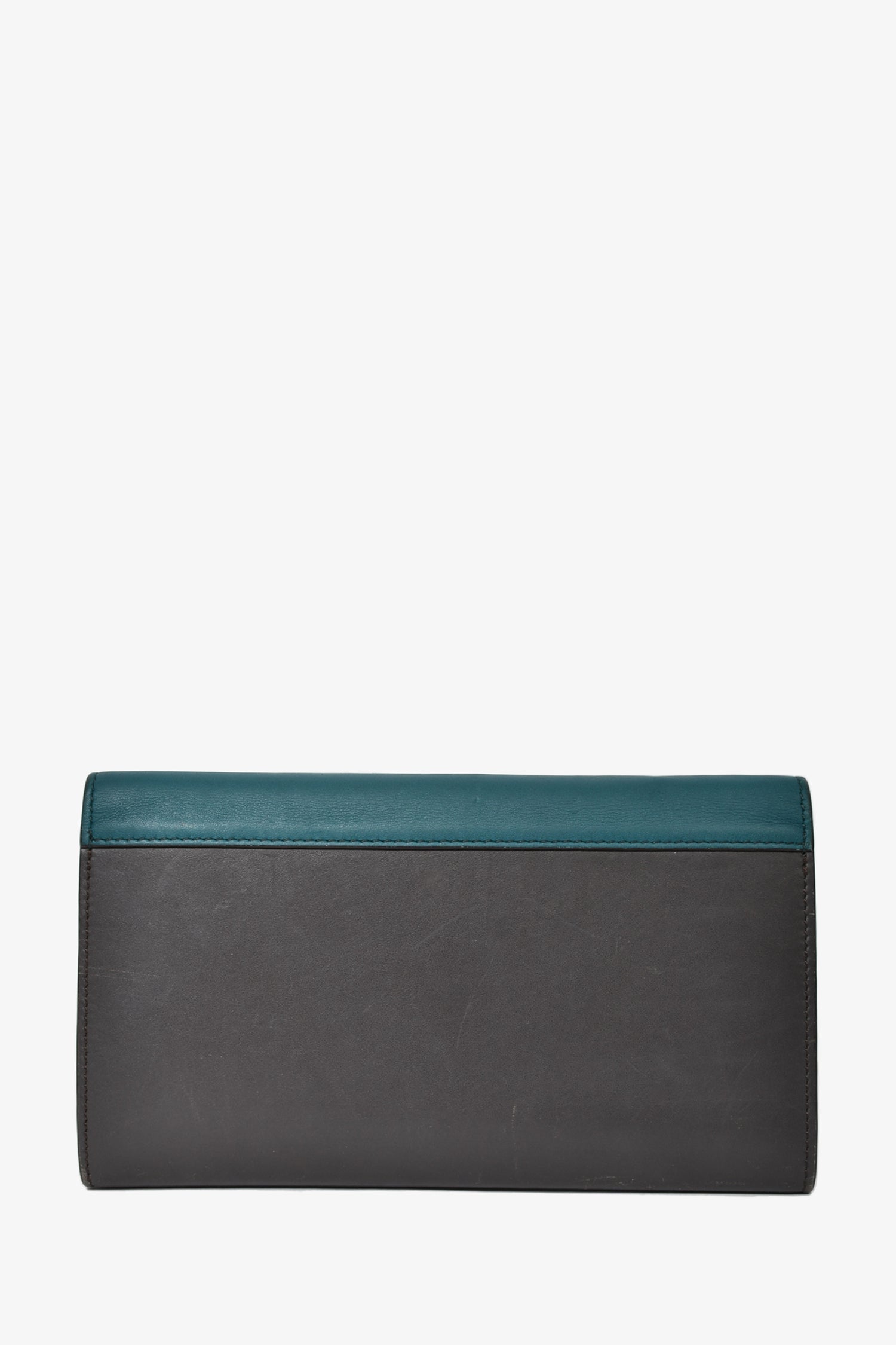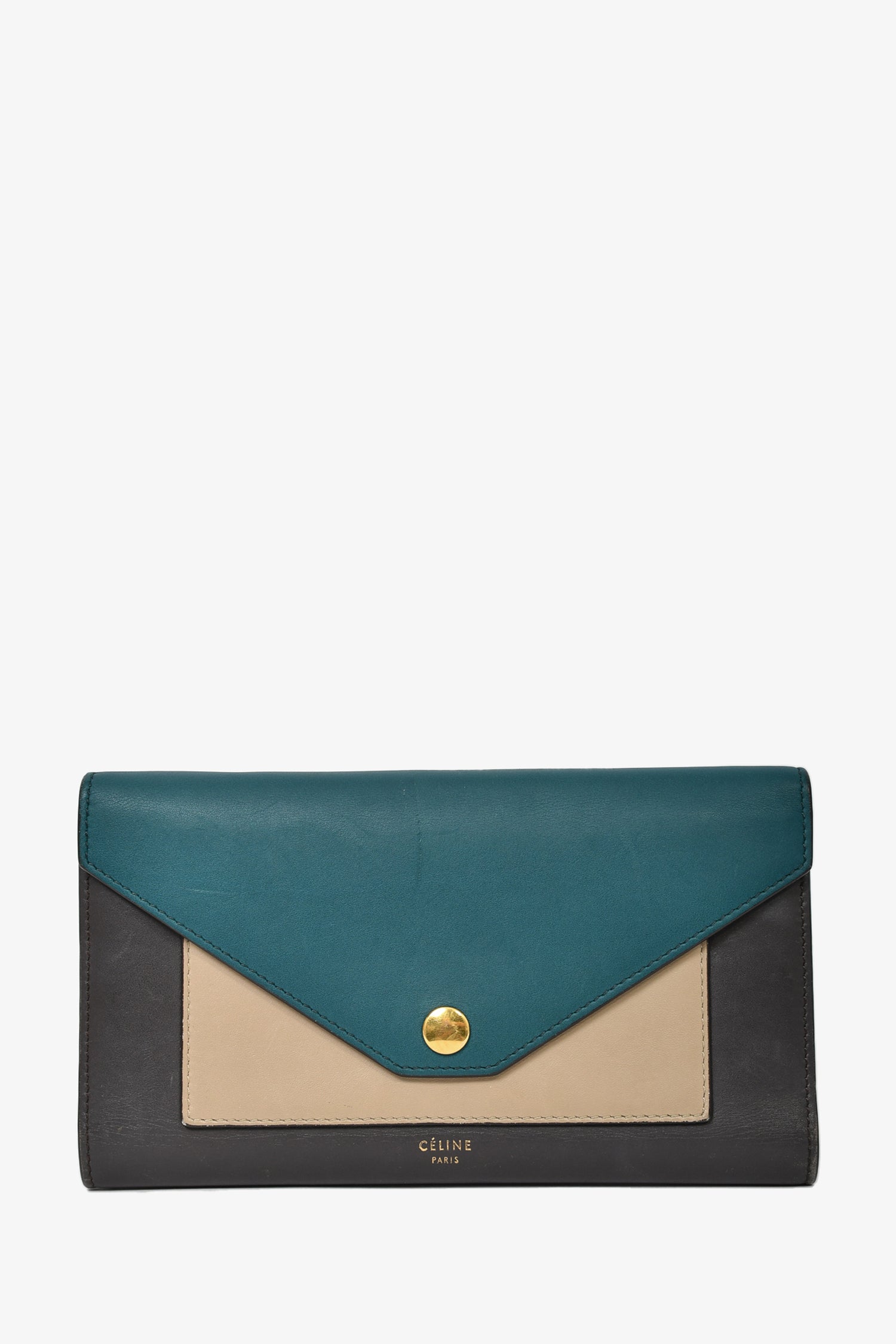 Refresh availabilityCeline Teal/Dark Grey/Taupe Tricolour Leather Flap Wallet. Front fold-over flap with snap-button closure. 8 card slots. 3 billfold compartments. 1 zippered coin compartment. Gold-tone hardware. Tonal stitching.