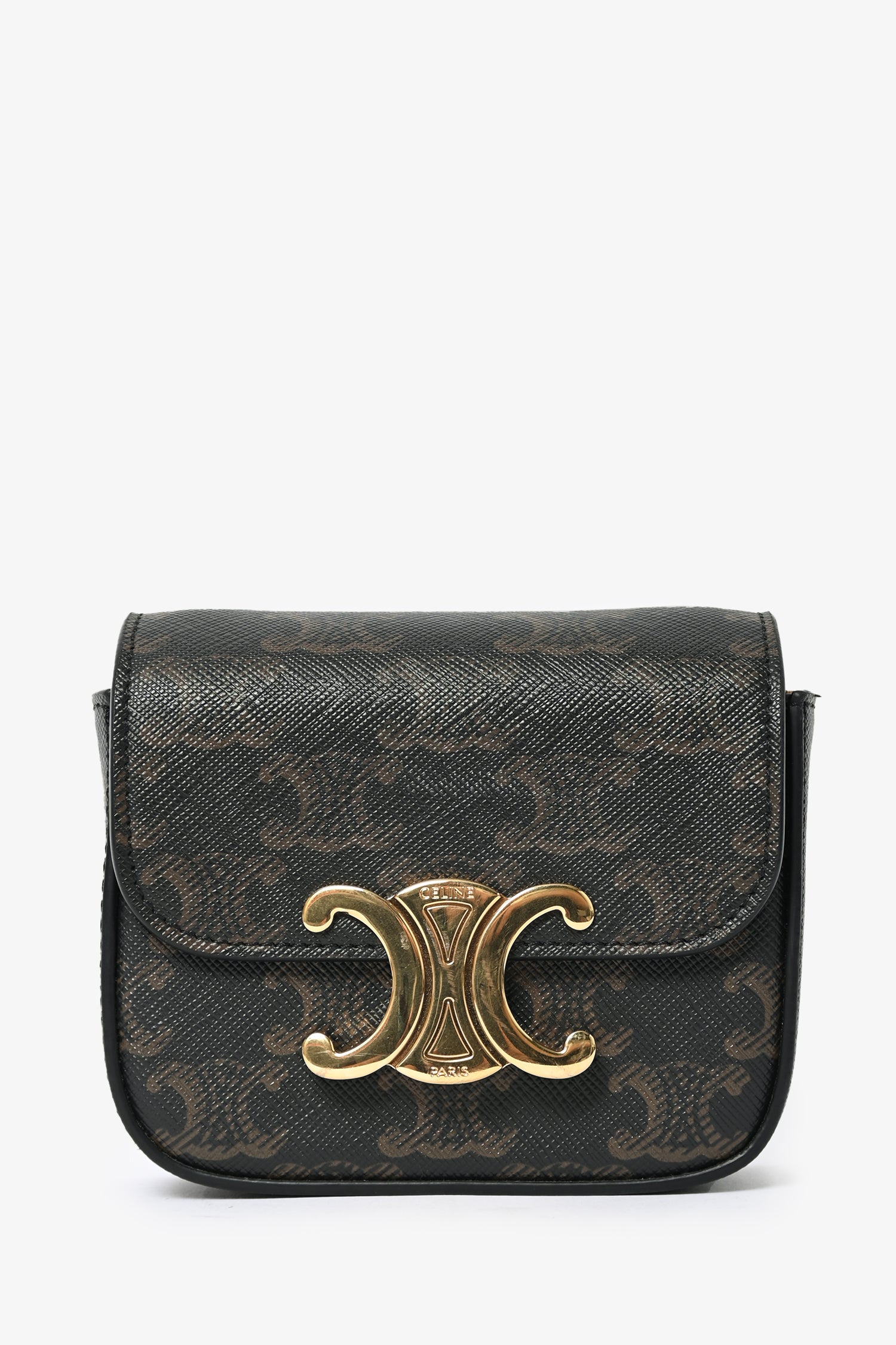 Refresh availabilityCeline Triomphe Canvas Mini Claude Belt Bag. Tonal stitching. Gold-toned 'Triomphe' snap closure. 'Triomphe' motif in coated canvas throughout. Leather trimming. Smooth leather and grosgrain interior. Interior wall pocket. Comes with detachable and adjustable belt strap.