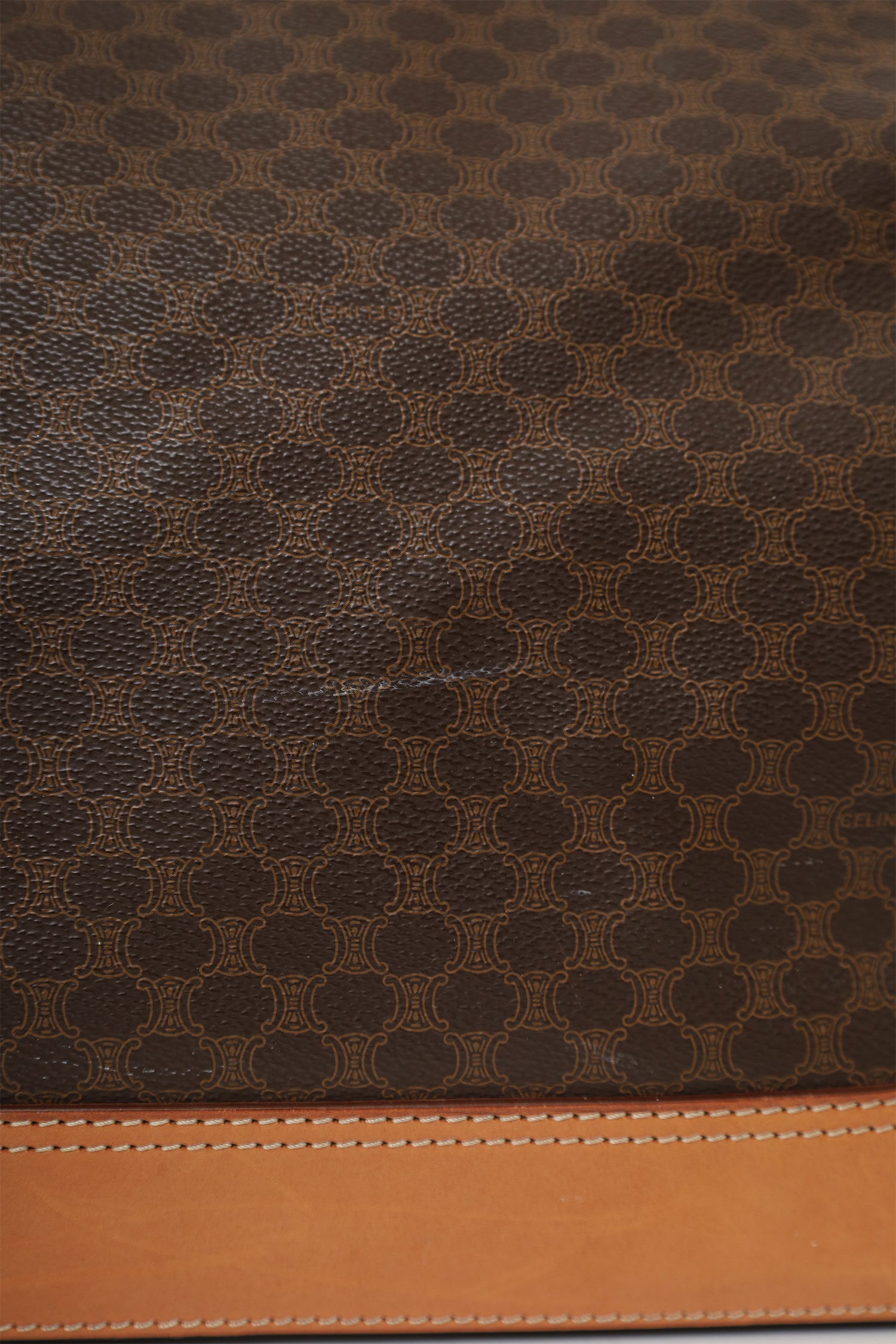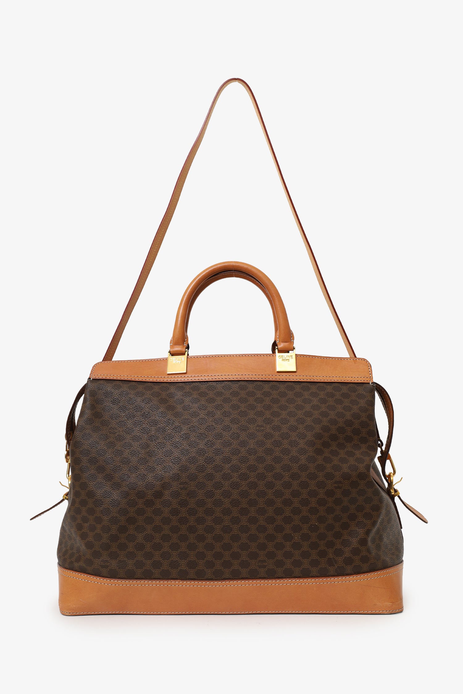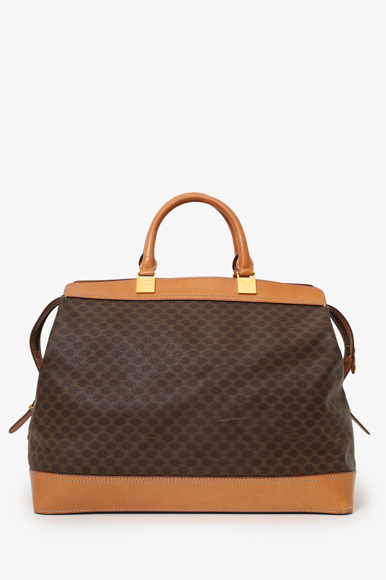 Refresh availabilityCeline Vintage Brown Macadam Canvas Large Zip Travel Bag. Top zip closure with pull through push pin buckle closure. Twin top handles. Protective base studs. Lined interior. 3 interior compartments; front compartment with 1 large open pocket. Middle compartment with single wall zip pocket. Back compartment with 1 large open pocket. Gold-tone hardware. Tonal stitching.