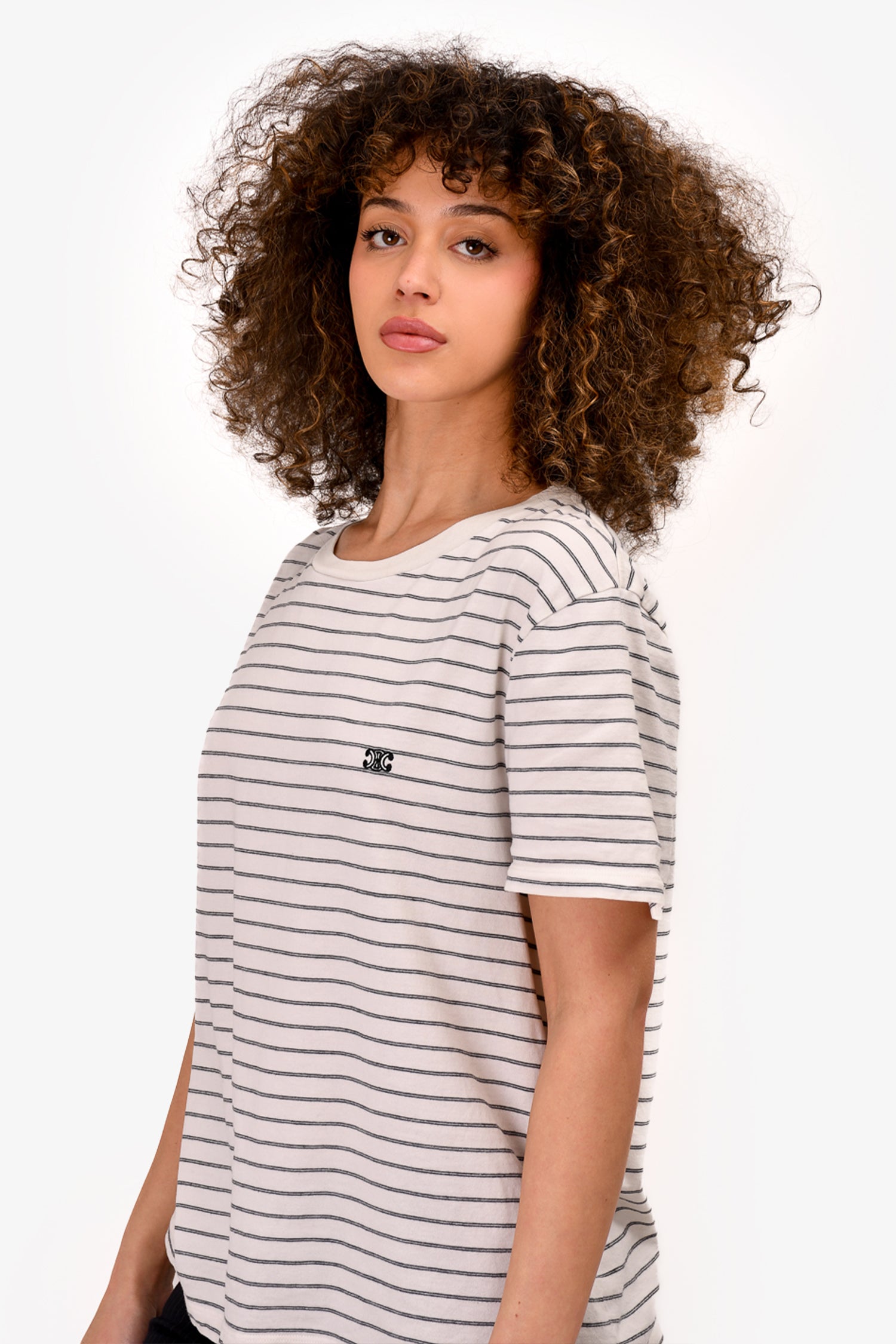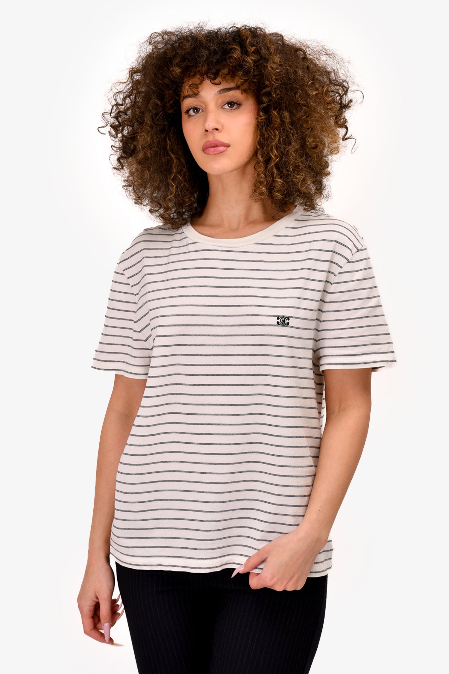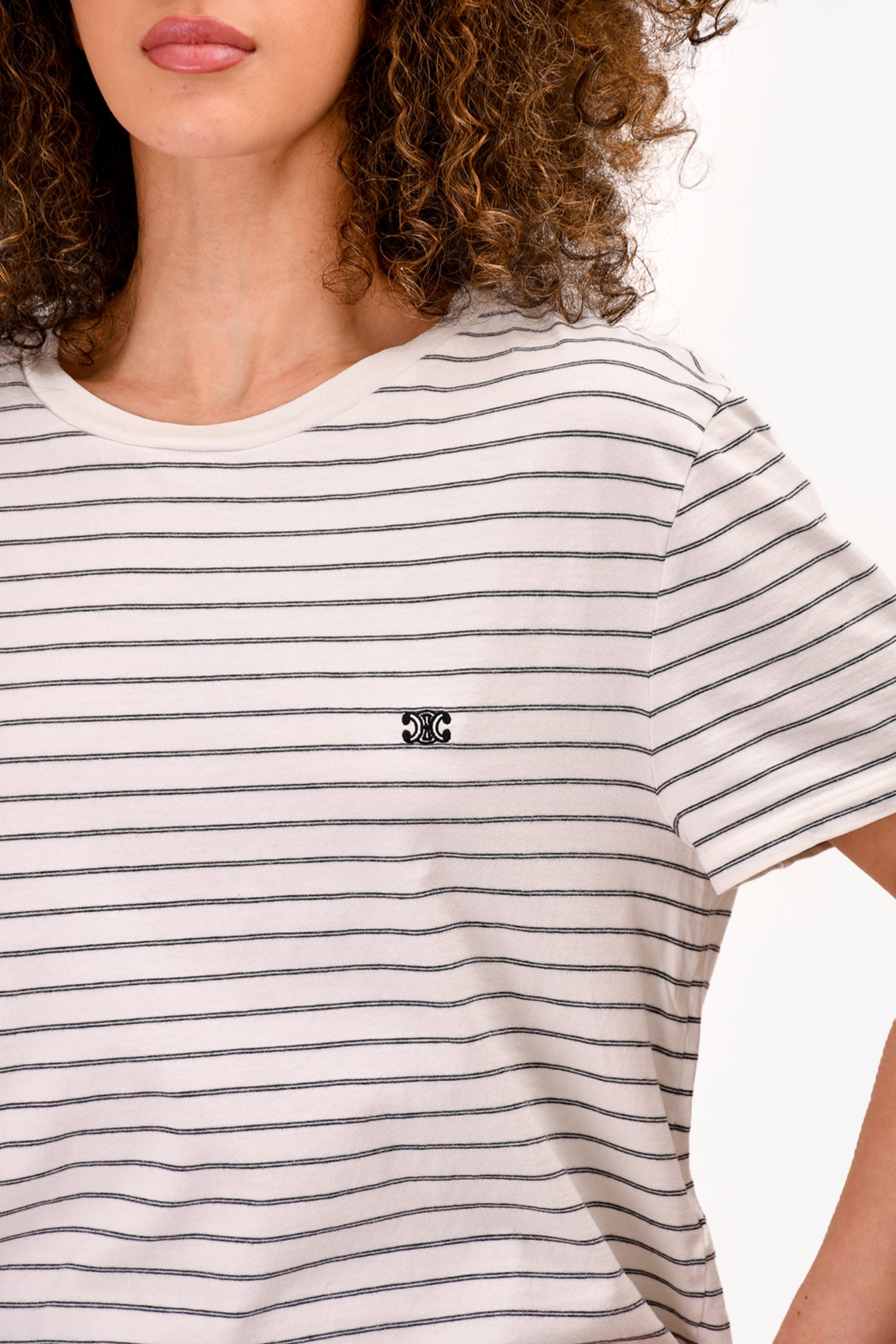 Refresh availabilityCeline White Striped Triomphe Logo T-Shirt. Round neck. Pull-on. Tonal stitching.