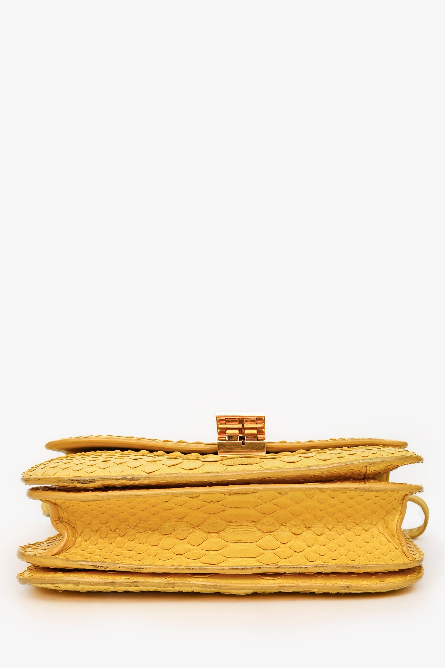 Refresh availabilityCeline Yellow Python Medium Crossbody Bag. Fold-over flap with a flip-lock closure. Gold-tone hardware. 2 interior compartments and 2 pockets. Zipped interior. Adjustable crossbody strap. Tonal stitching.