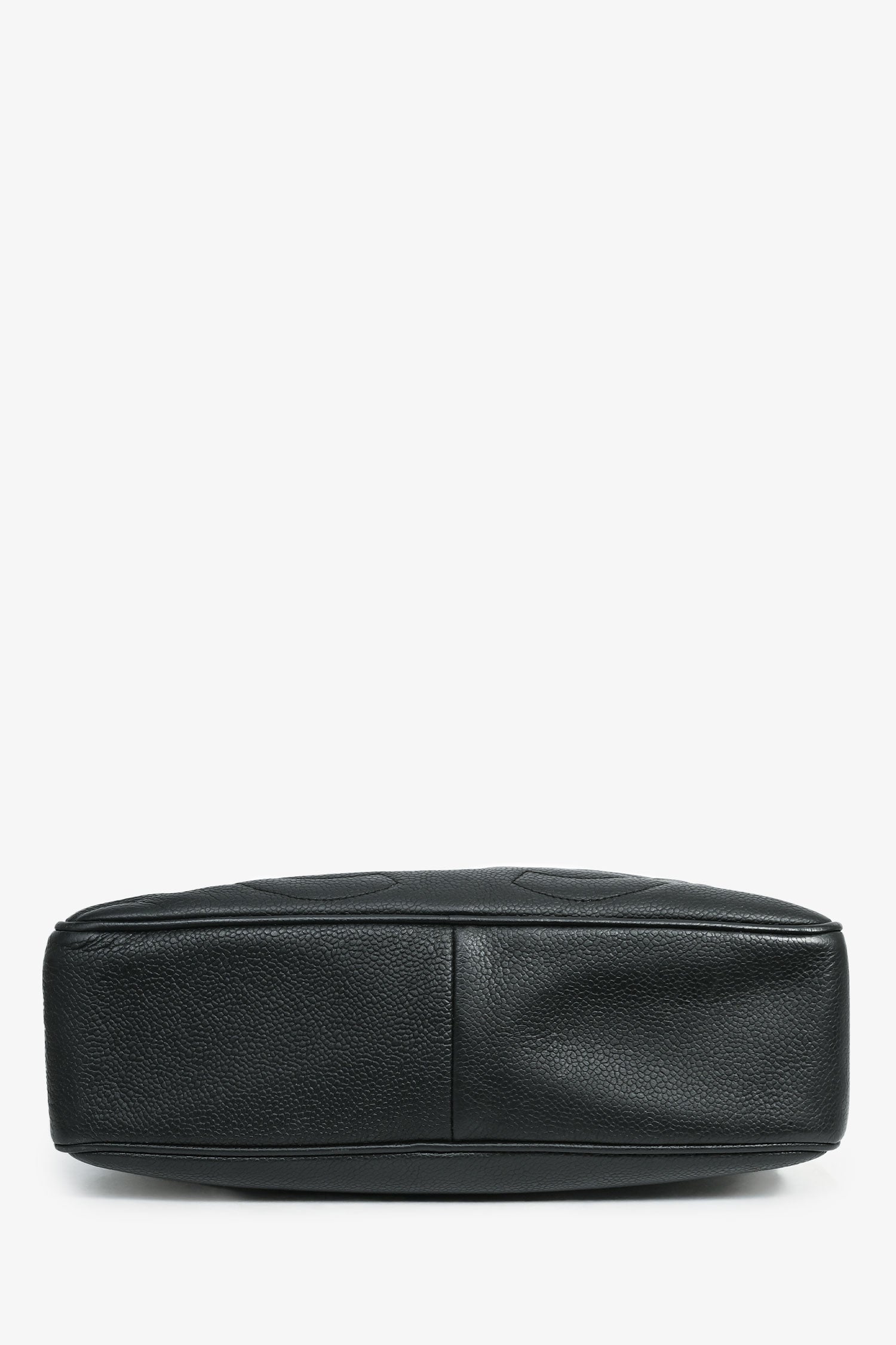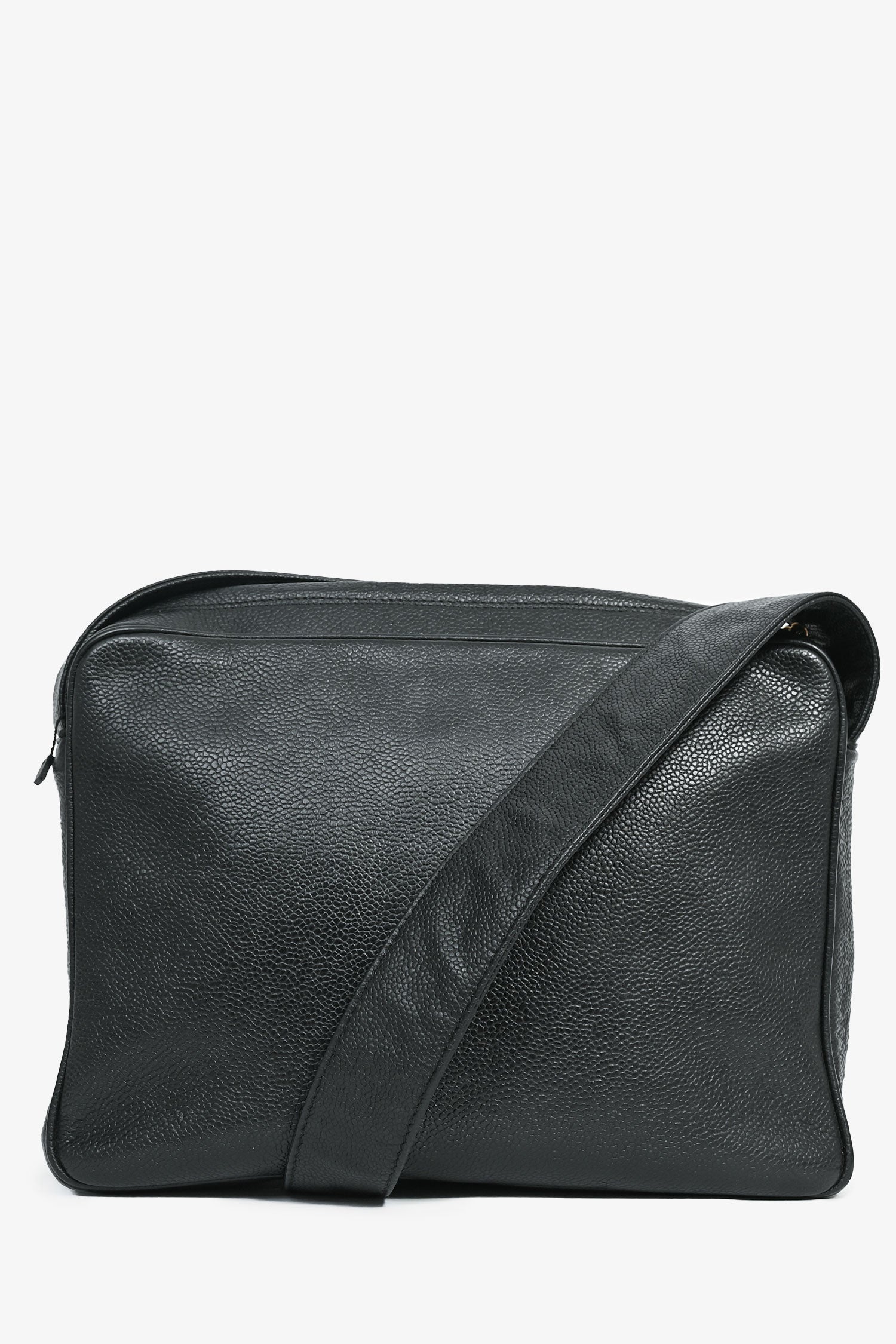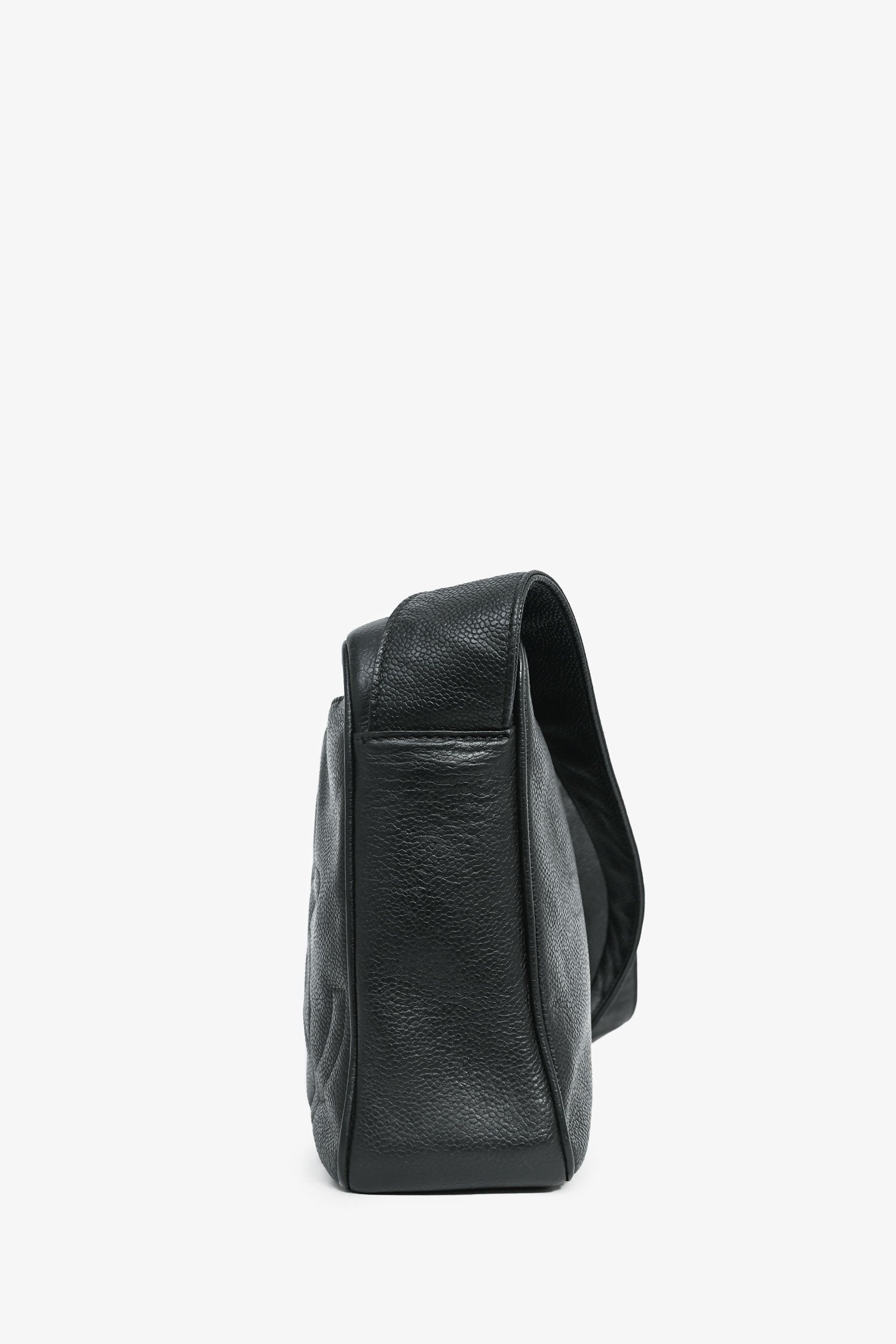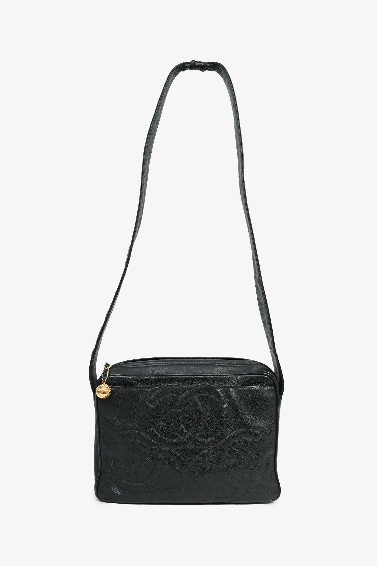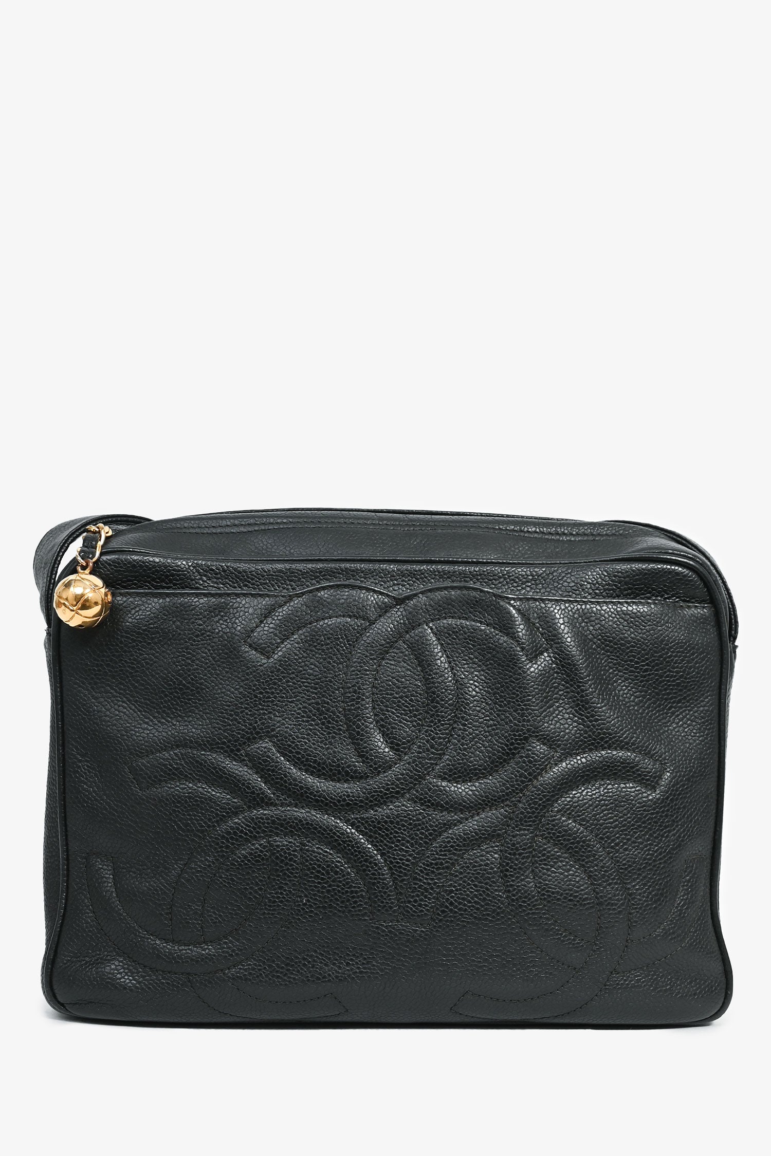 Pre-Loved Chanel™ 1986-1988 Black Caviar Leather Triple CC Logo Crossbody. Gold-tone hardware. Exterior slip compartment. Lined leather interior with a zipped compartment and 1 pocket. Crossbody strap with wrap-around detail. Tonal stitching.