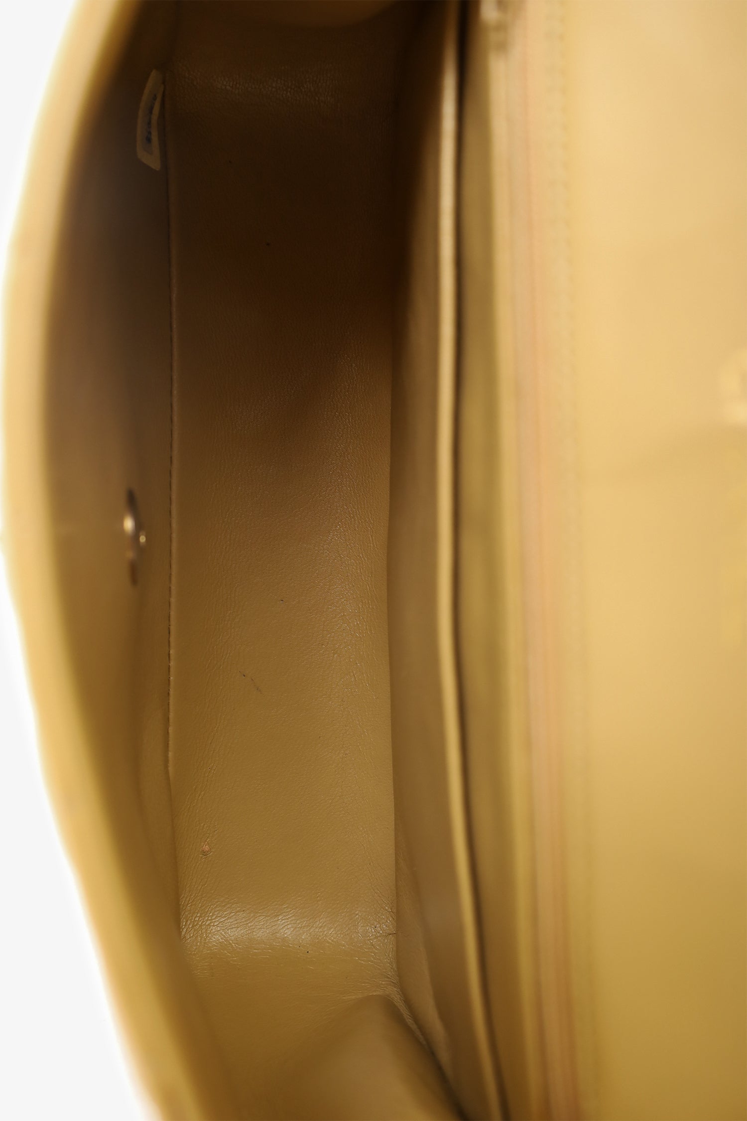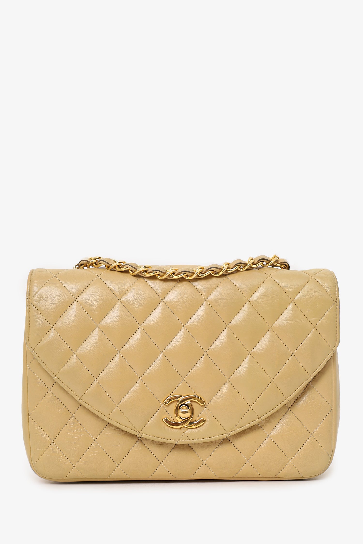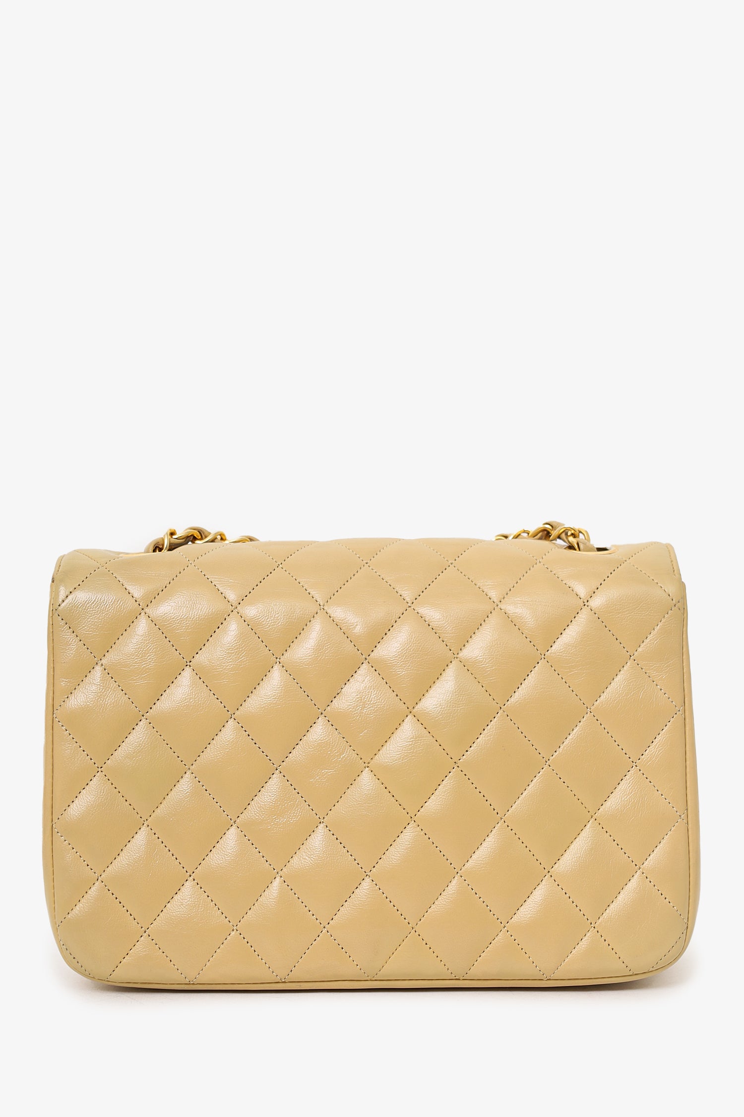 Pre-Loved Chanel™ 1986-88 Beige Quilted Lambskin Half Moon Flap Bag. Front fold-over flap with turn lock. Single chainlink strap. Leather-lined interior. 2 interior pockets on back interior wall; 1 slip and 1 zip. Gold-tone hardware. Tonal stitching.