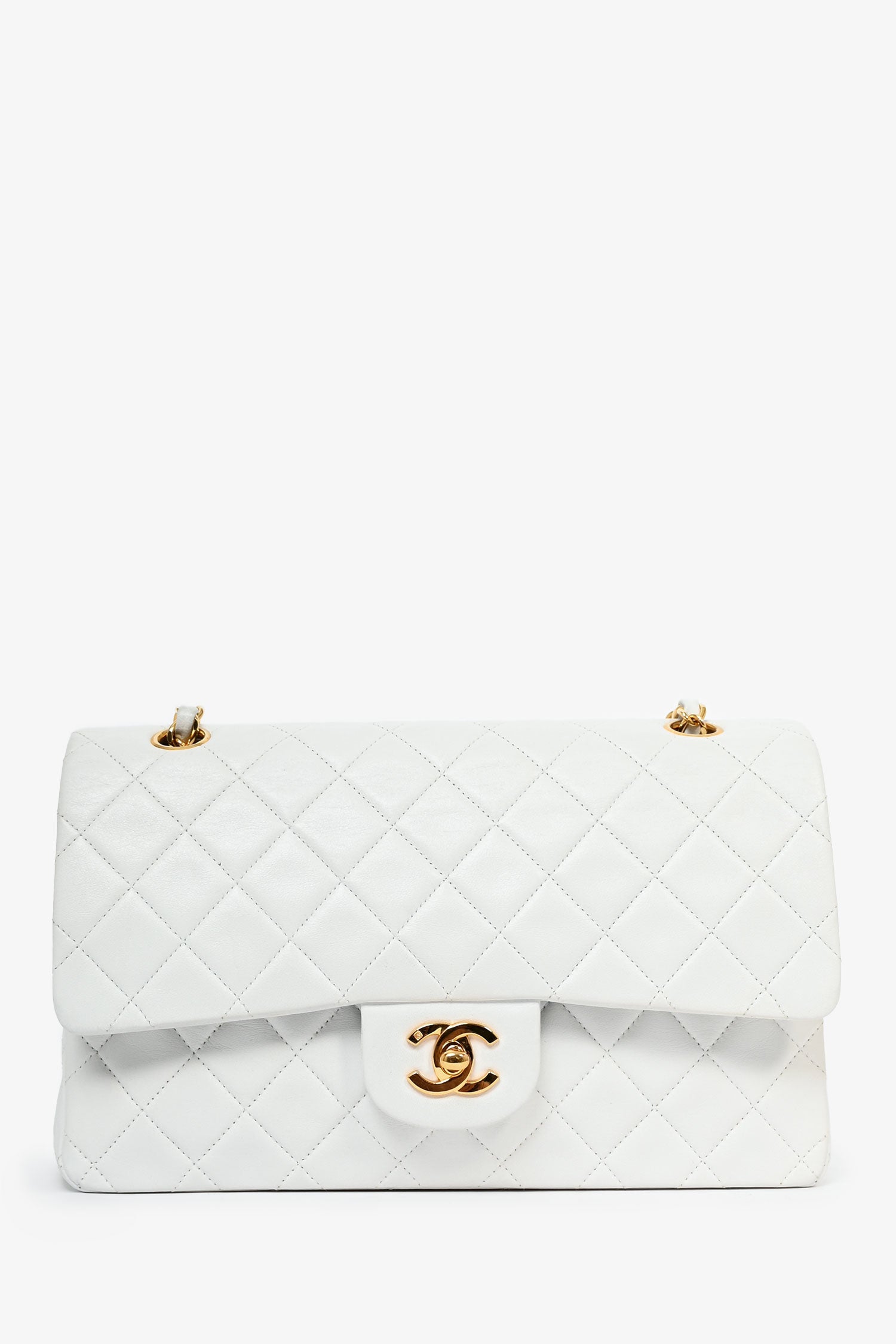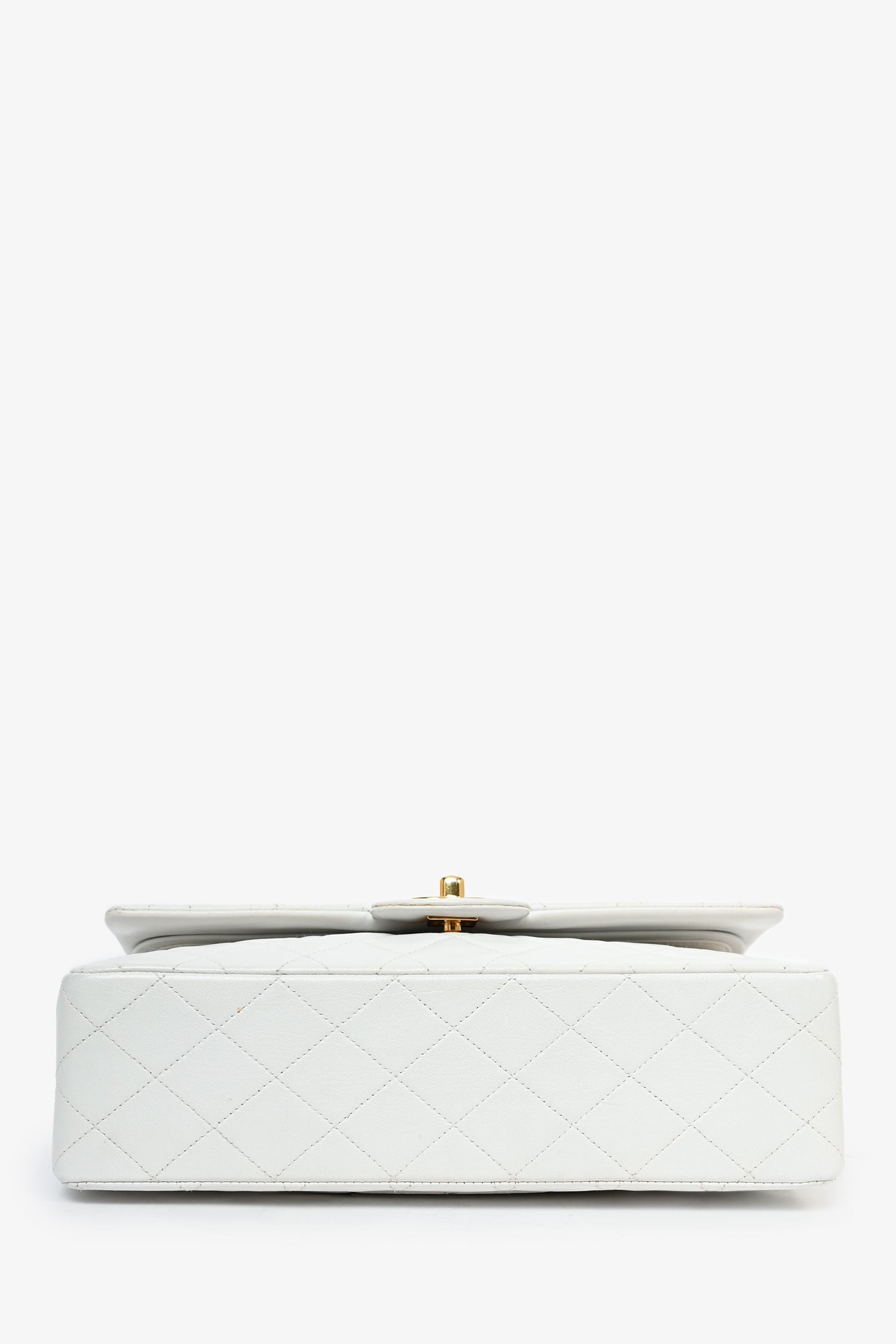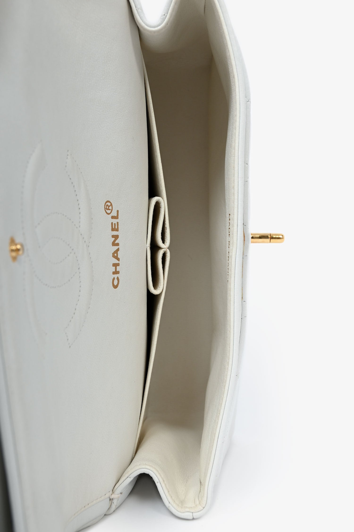 Refresh availabilityPre-Loved Chanel™ 1991-94 Vintage White Quilted Leather Medium Double Flap. Turn-lock closure. Rear exterior slip-pocket. Interior flap fold-over with snap button closure. Interior flap pocket with zip-up closure. Open compartment with 2 interior wall slip pockets and a pen slot. Gold-tone hardware. Tonal stitching.