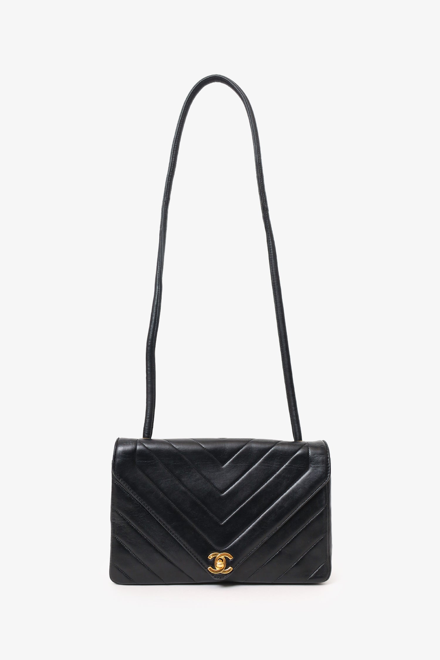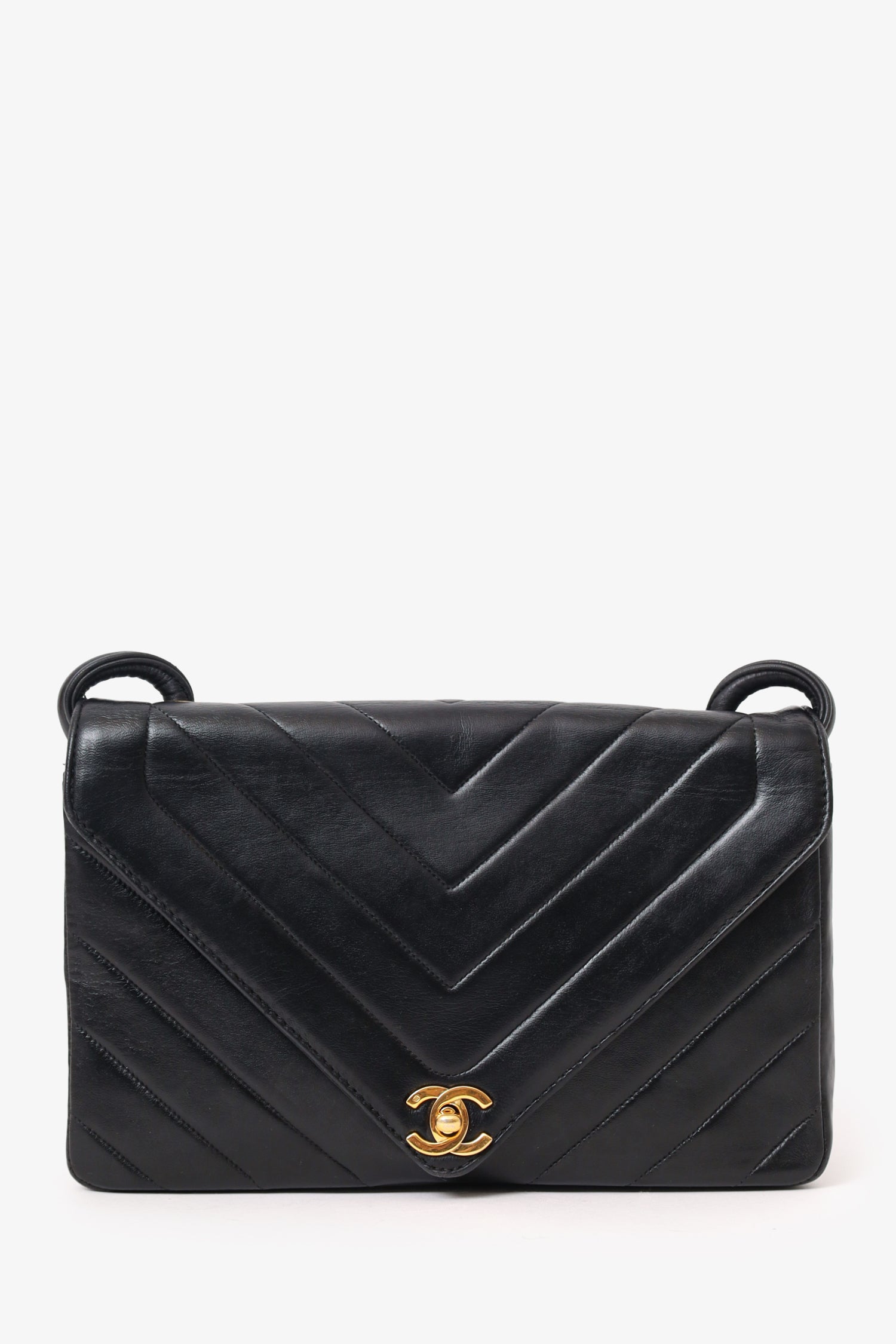 Refresh availabilityPre-Loved Chanel™ 1991-94 Black Chevron Leather Medium Envelope Flap Bag. Front-fold-over-flap with turn-lock closure. Leather crossbody strap. Leather-lined interior with 2 rear pockets; 1 slip, and 1 zip-up. Gold-tone hardware. Tonal stitching.