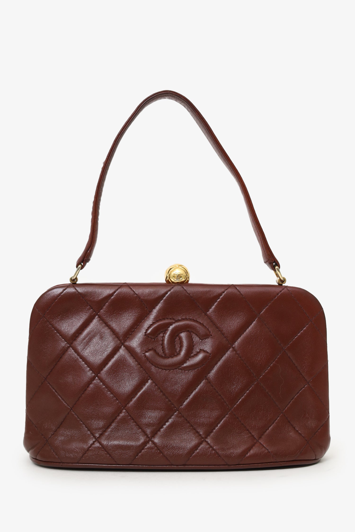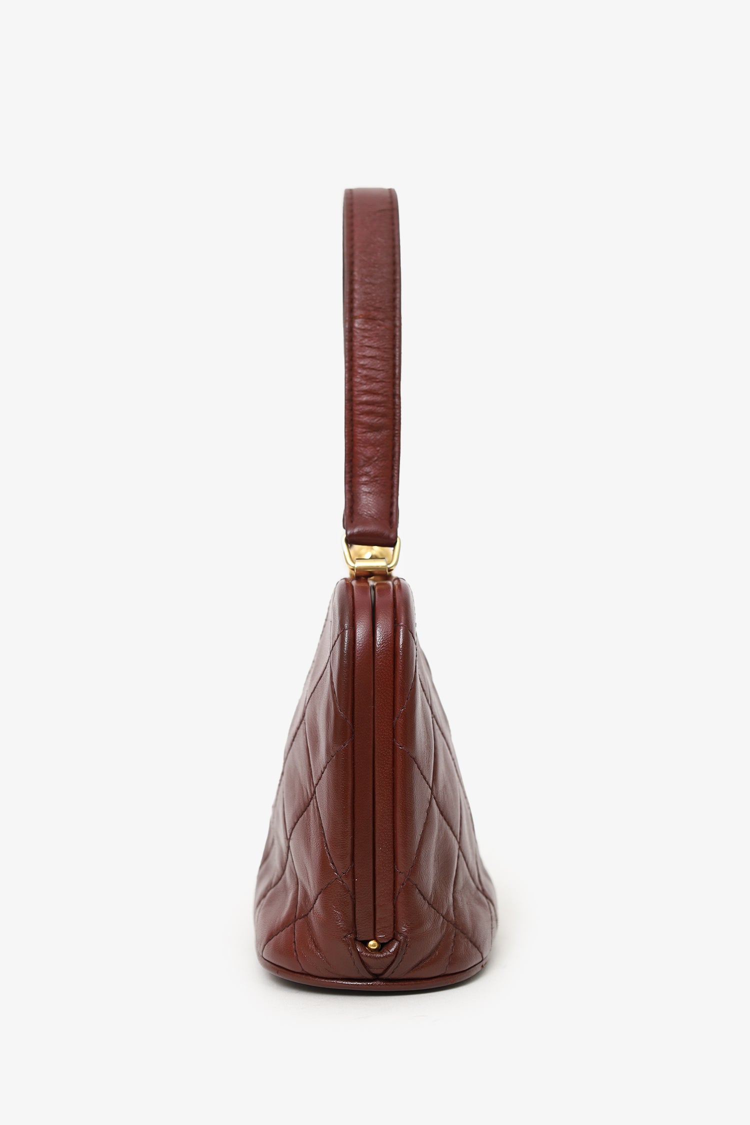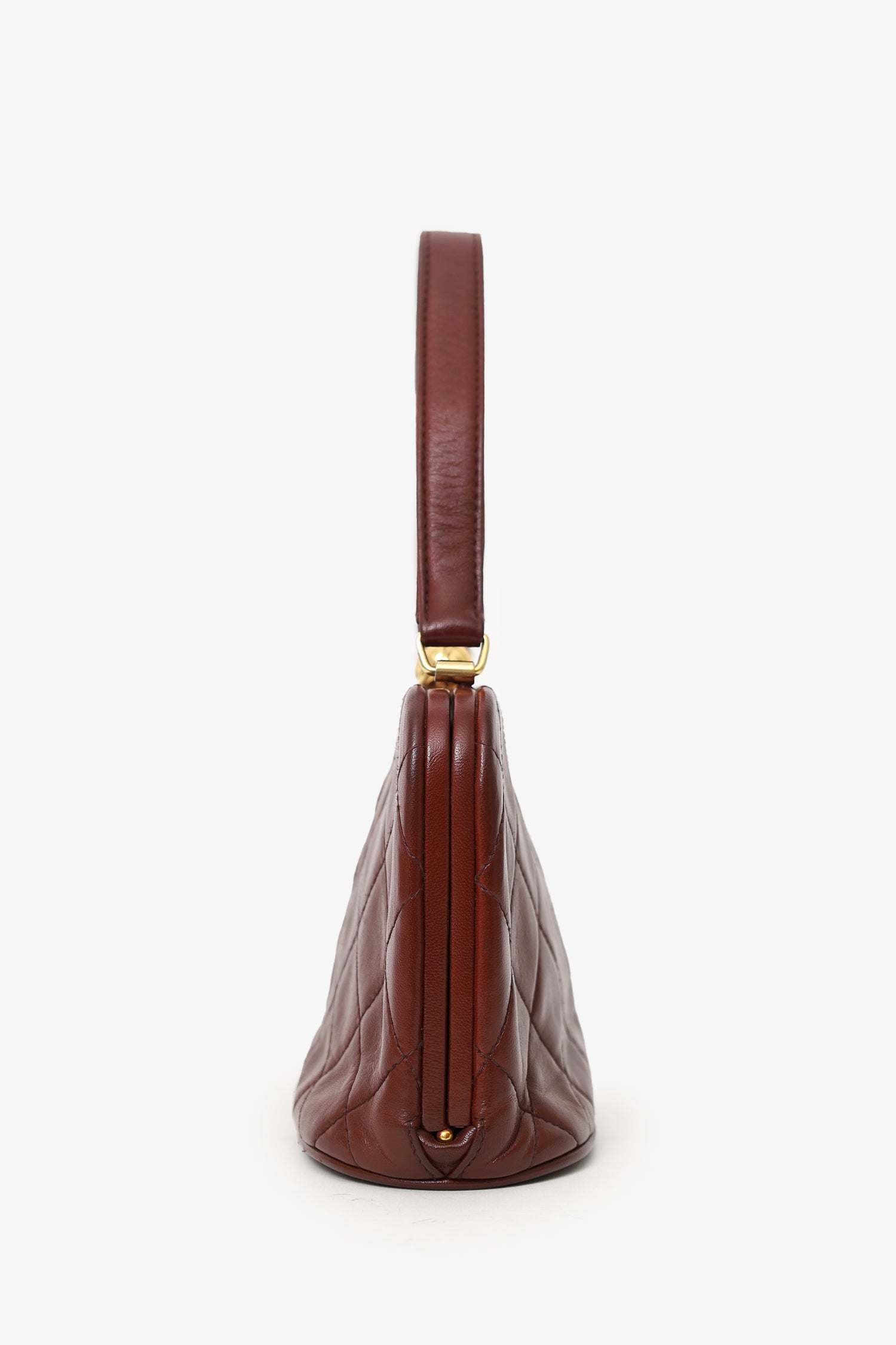 Refresh availabilityPre-Loved Chanel™ 1994-96 Burgundy Quilted Lambskin Timeless Top Handle Frame Bag. Top flip-lock closure. Shoulder strap. Leather-lined interior. 2 interior pockets; 1 slip and 1 zip. Gold-tone hardware. Tonal stitching.