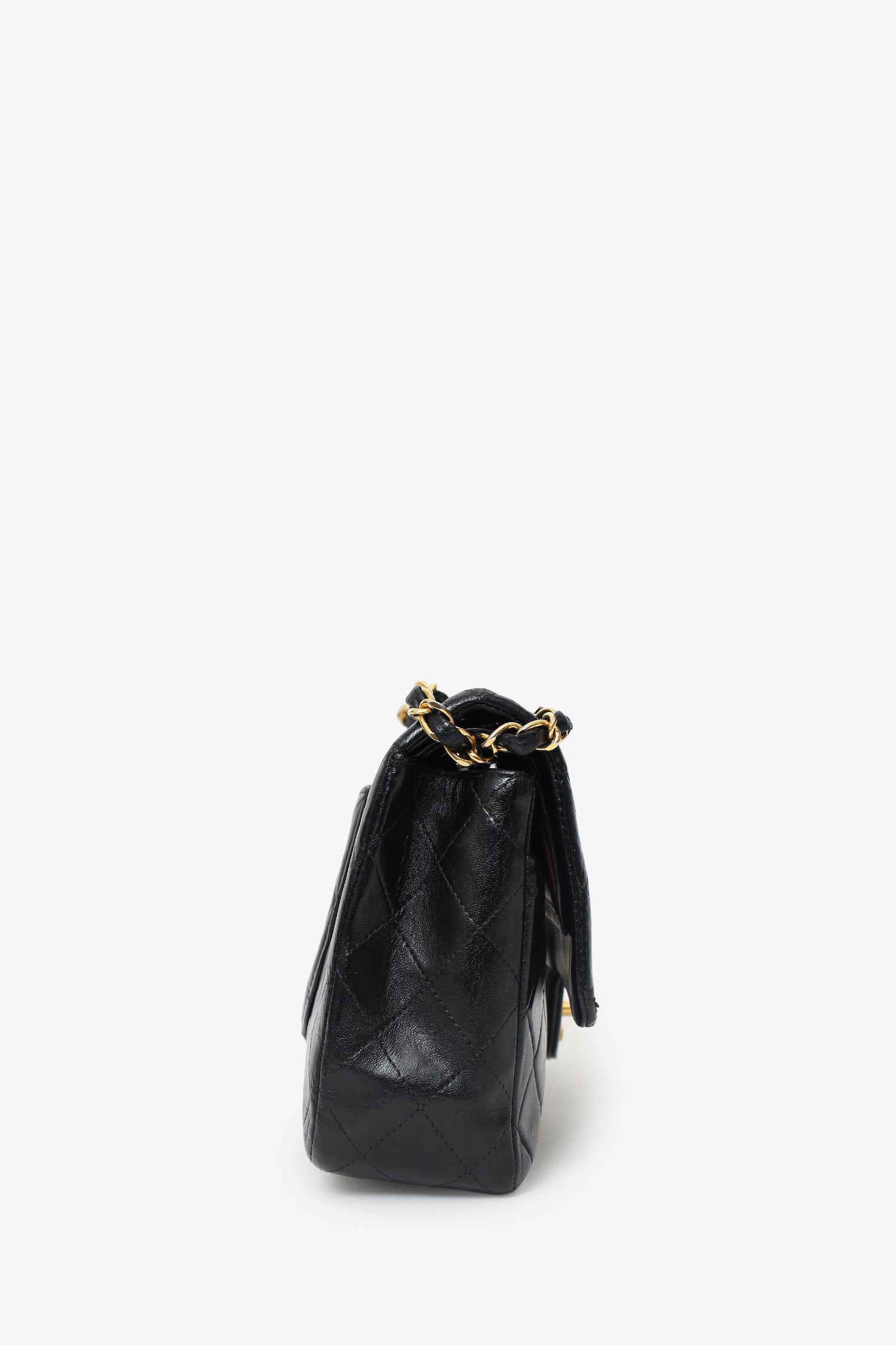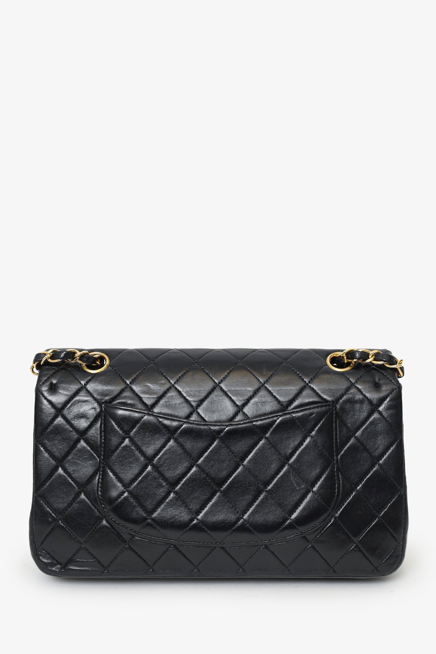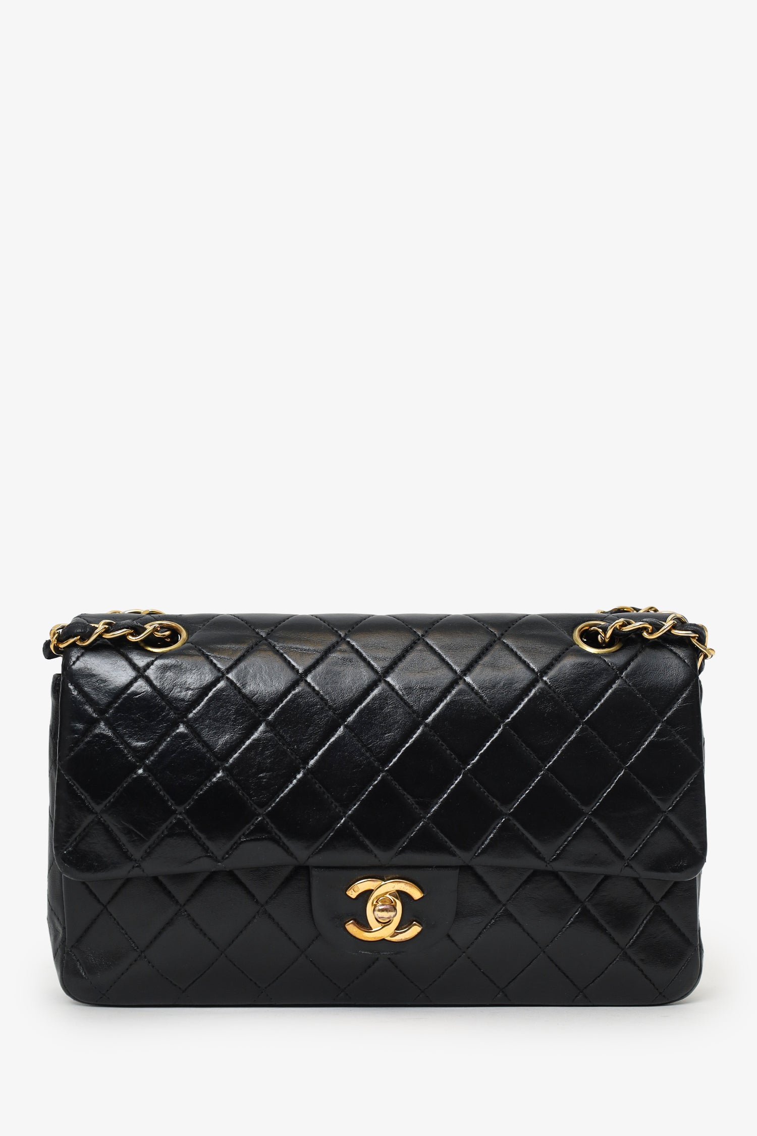 Pre-Loved Chanel™ 2000/02 Black Leather Medium Double Flap Chain Bag with GHW. Front fold-over flaps; Outer flap with turn-lock closure, inner flap with snap button closure. Twin chain link shoulder straps that can be pulled in and extended to one long strap. Back exterior slip pocket. Leather-lined interior. 4 interior compartments; front compartment with 1 large open pocket. 2 interior slip pockets with single lipstick compartment. Back compartment is single open pocket. 1 zip pocket on underside of top fold-over flap. Gold-tone hardware. Tonal stitching.