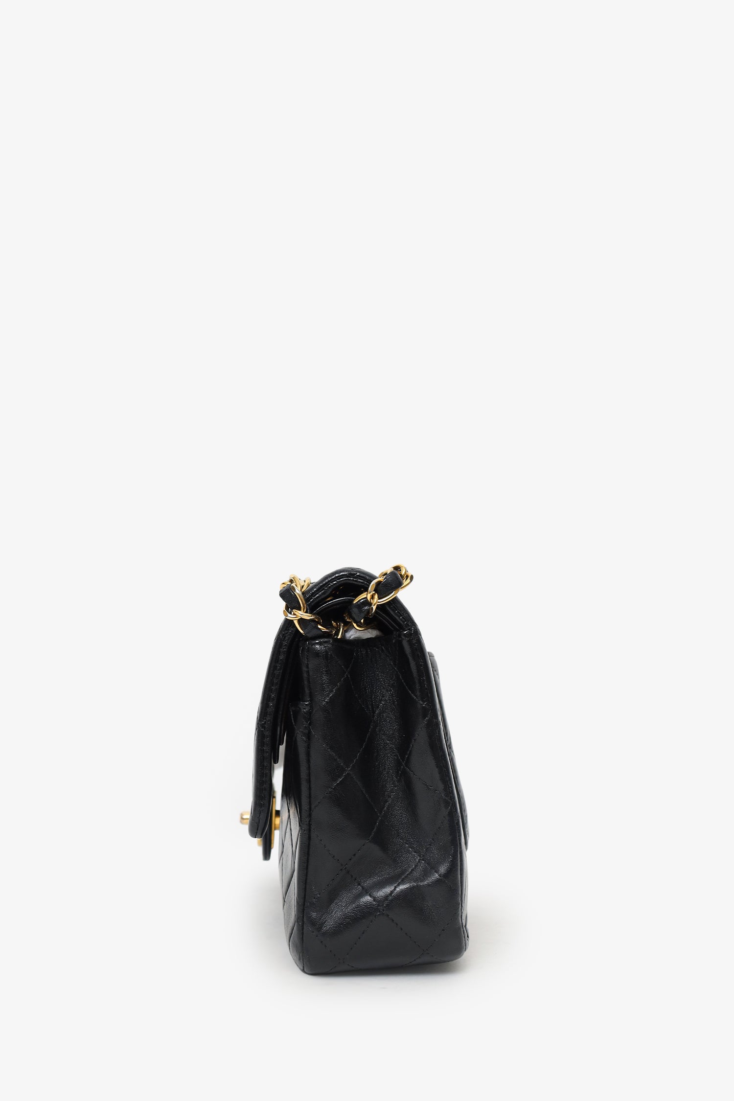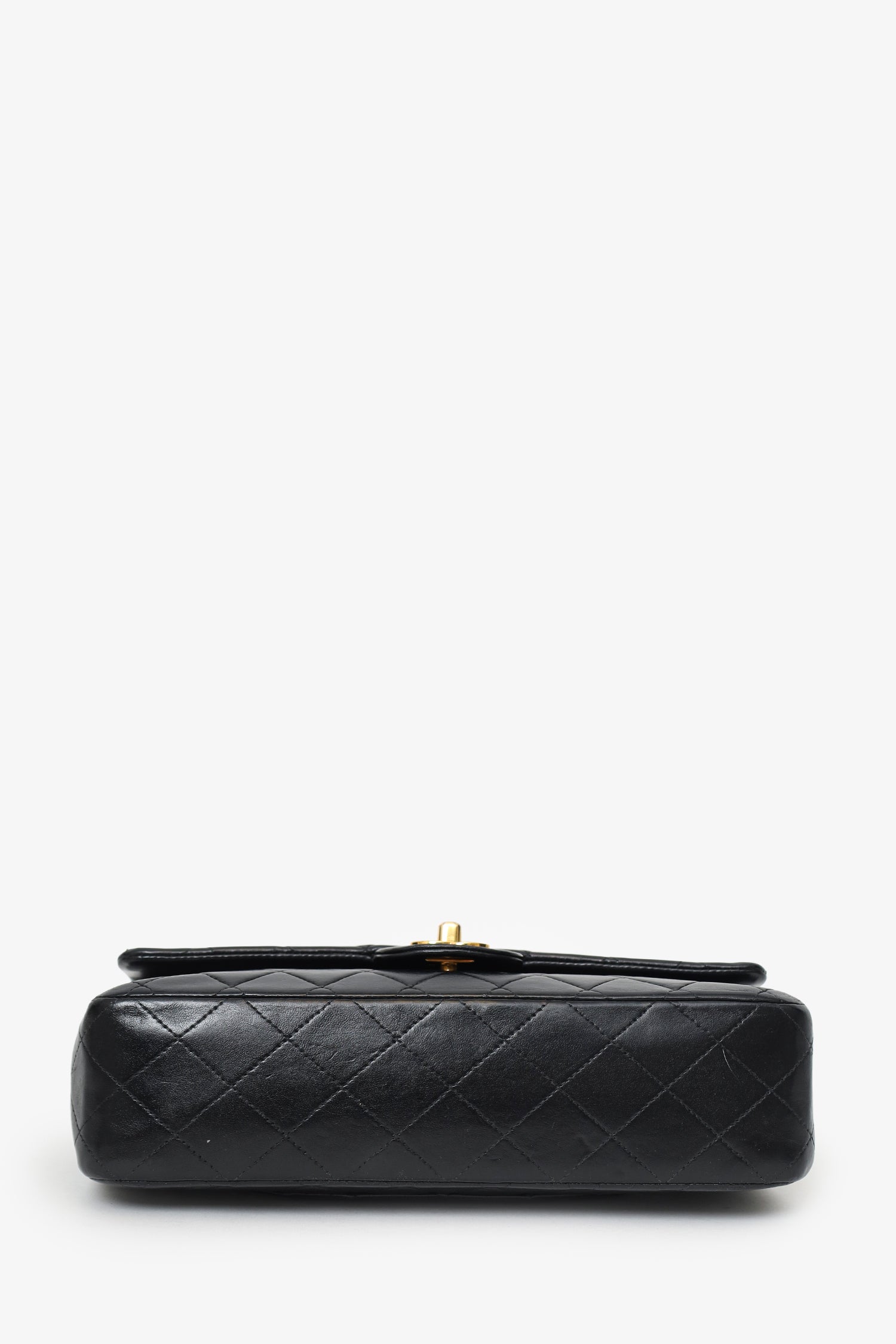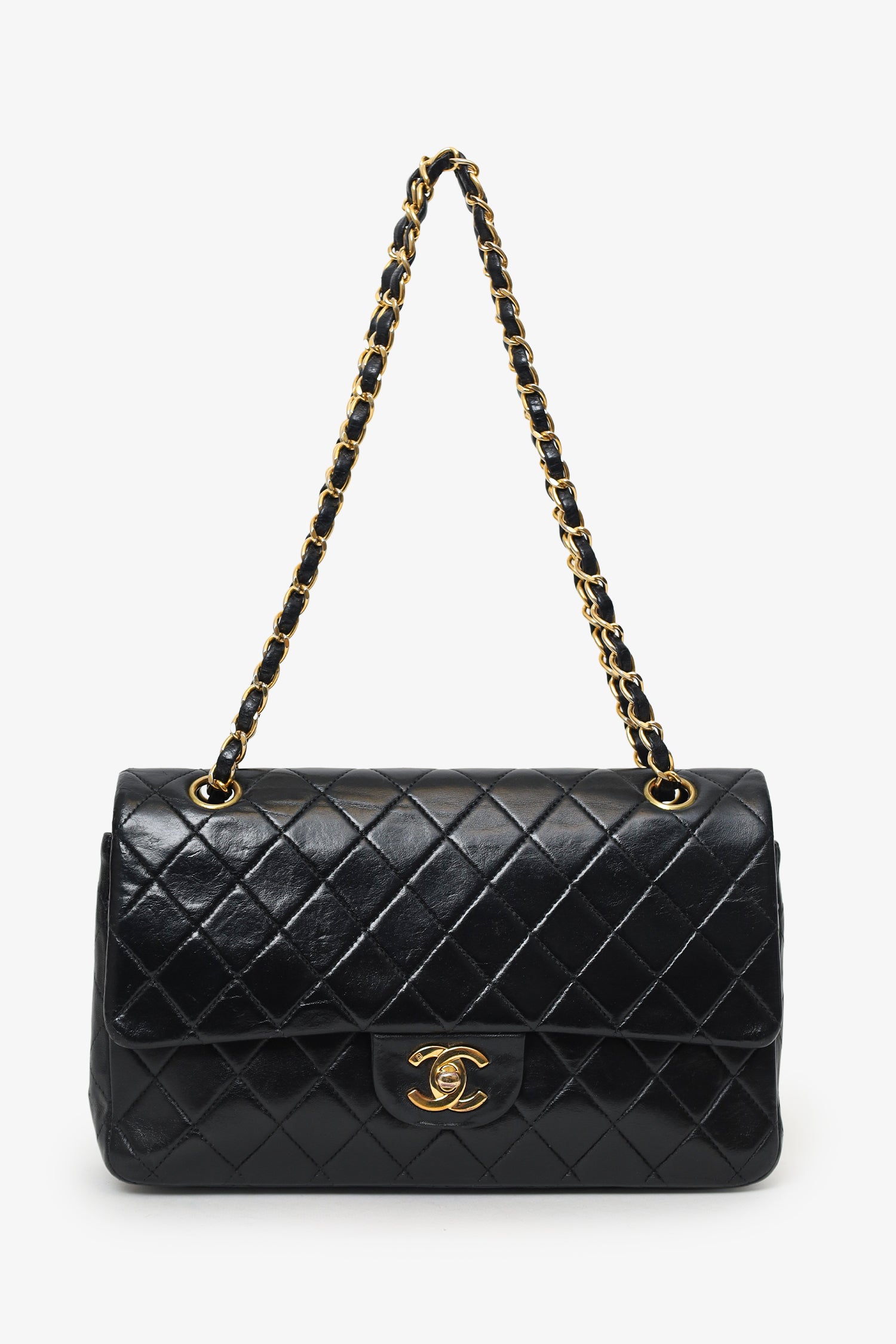 Pre-Loved Chanel™ 2000/02 Black Leather Medium Double Flap Chain Bag with GHW. Front fold-over flaps; Outer flap with turn-lock closure, inner flap with snap button closure. Twin chain link shoulder straps that can be pulled in and extended to one long strap. Back exterior slip pocket. Leather-lined interior. 4 interior compartments; front compartment with 1 large open pocket. 2 interior slip pockets with single lipstick compartment. Back compartment is single open pocket. 1 zip pocket on underside of top fold-over flap. Gold-tone hardware. Tonal stitching.