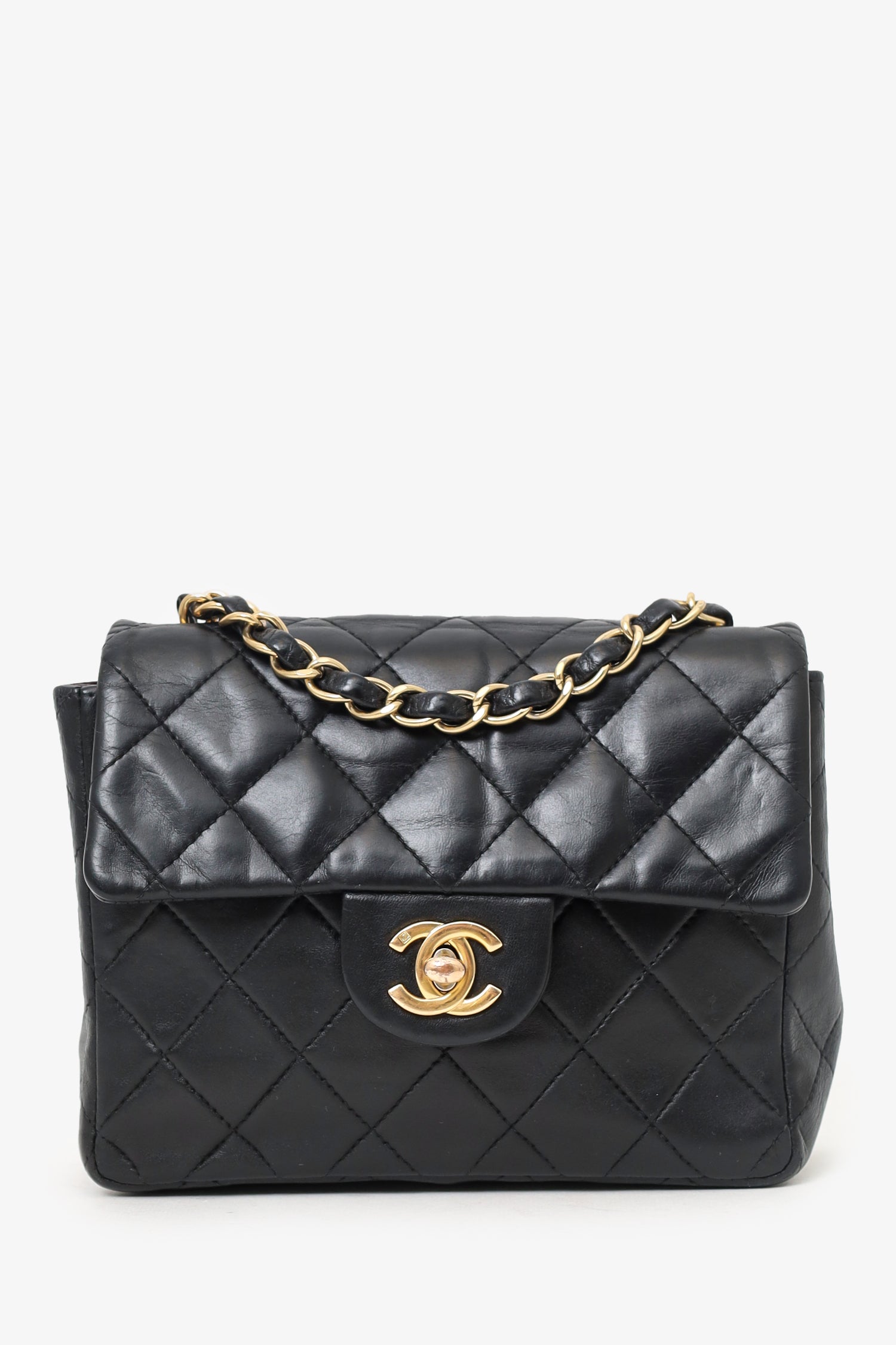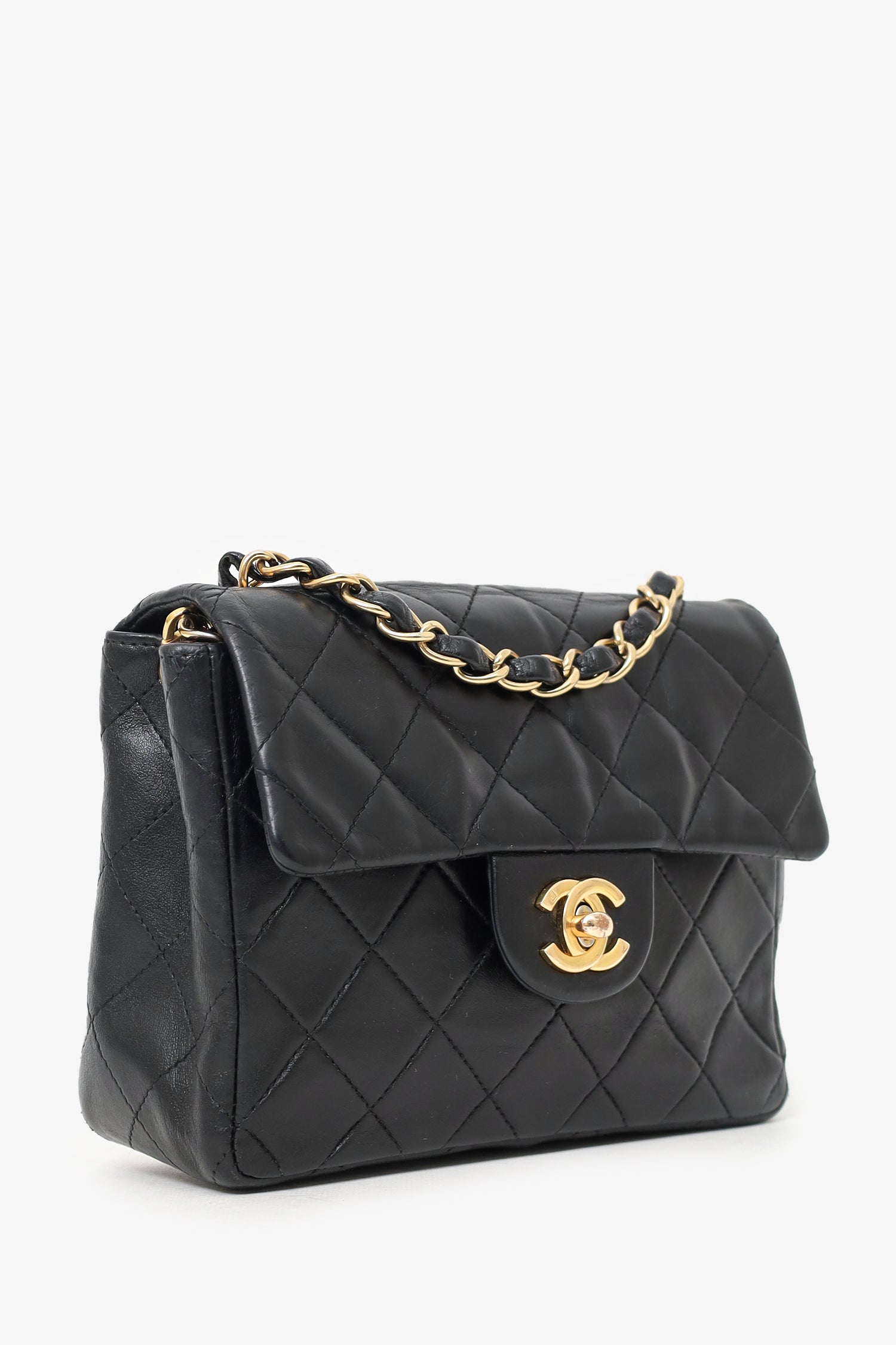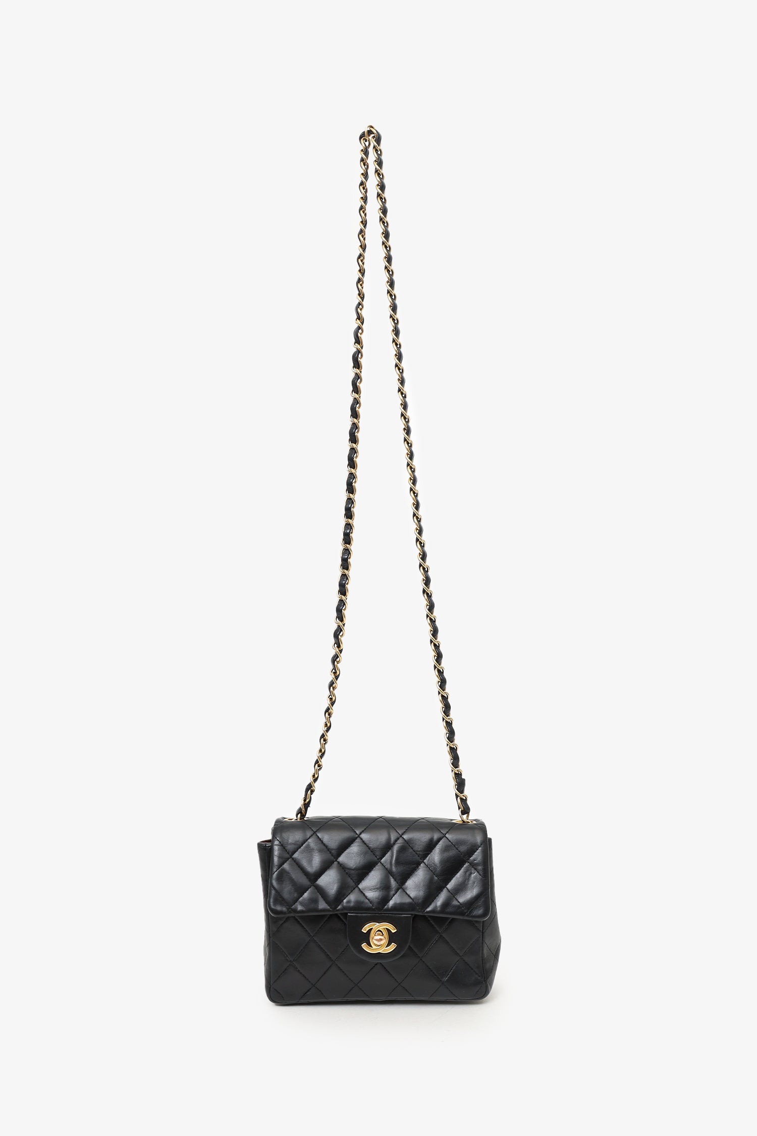 Refresh availabilityPre-Loved Chanel™ 2003-04 Black Lambskin Mini Square Flap Bag. Front fold-over flap with turnlock closure. Single chainlink strap. Quilted exterior. Single rear exterior slip pocket. Lined interior. 1 Interior slip and 1 zip pocket. Gold-tone hardware. Tonal stitching.