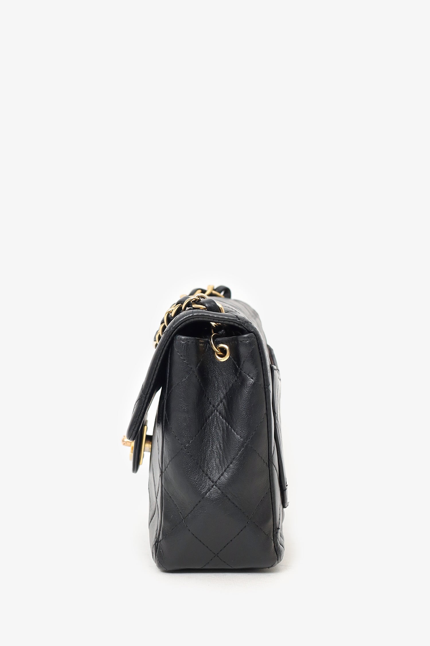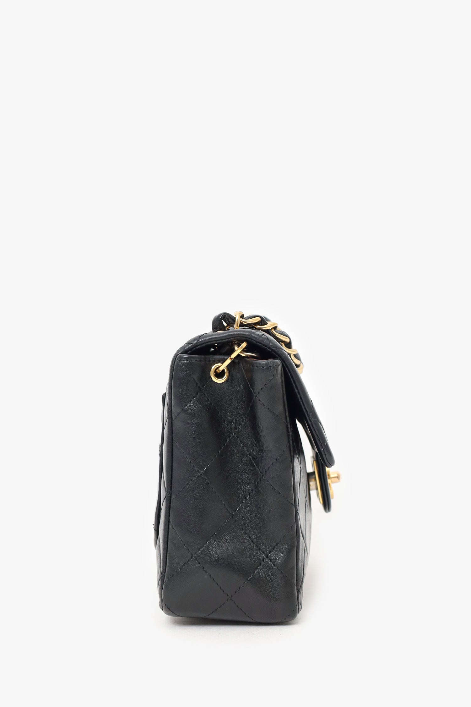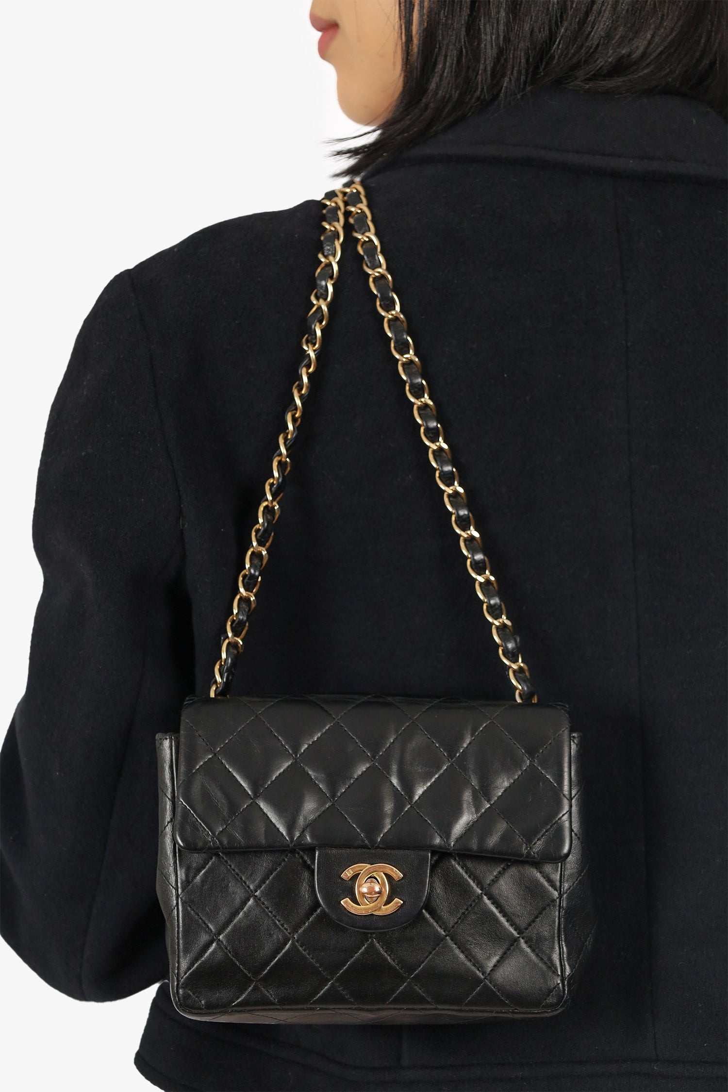 Refresh availabilityPre-Loved Chanel™ 2003-04 Black Lambskin Mini Square Flap Bag. Front fold-over flap with turnlock closure. Single chainlink strap. Quilted exterior. Single rear exterior slip pocket. Lined interior. 1 Interior slip and 1 zip pocket. Gold-tone hardware. Tonal stitching.