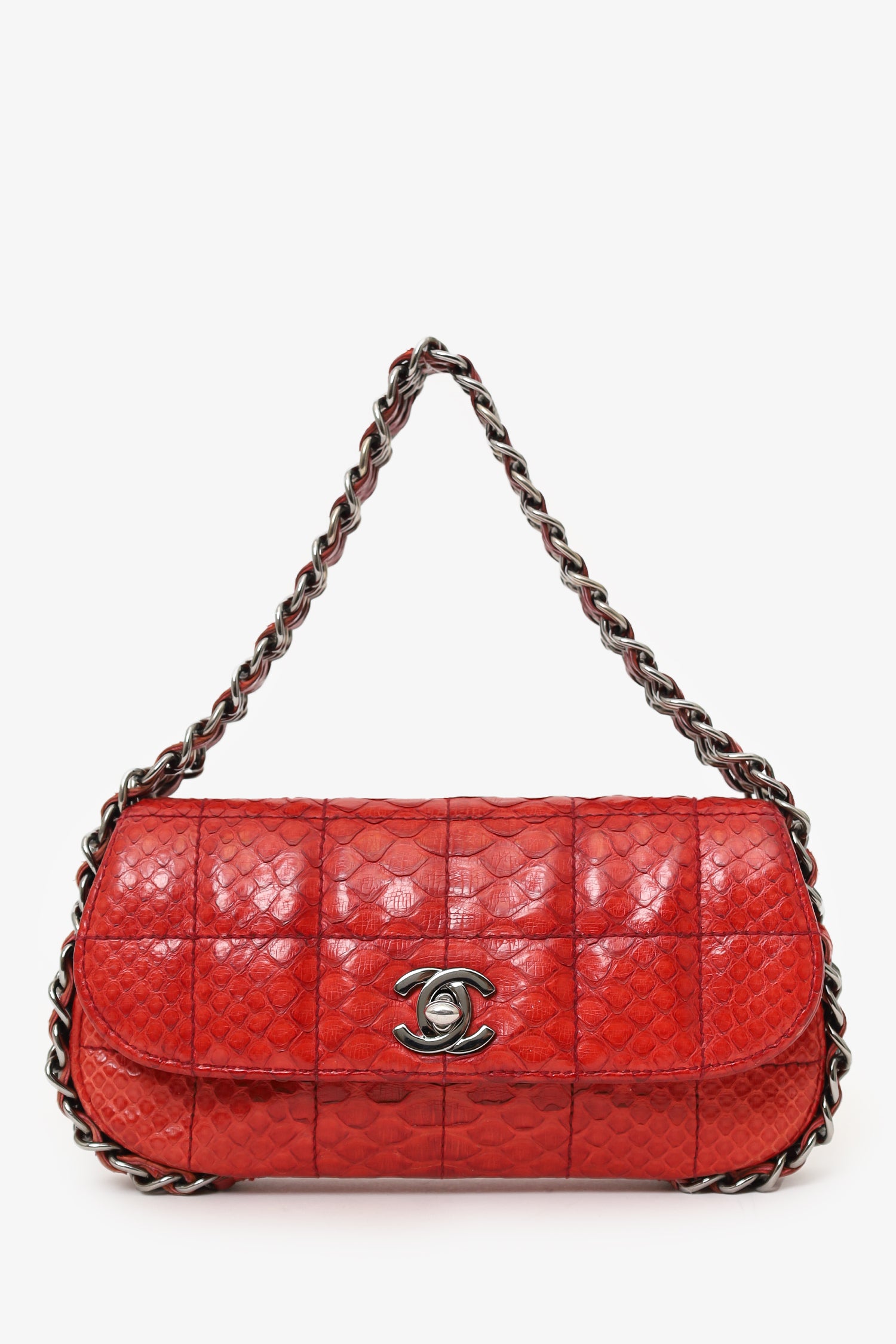 Refresh availabilityPre-Loved Chanel™ 2004-05 Red Python Leather Tripe Chain CC Mini Flap Bag. Front fold-over flap with turn-lock closure. Chainlink shoulder strap. Lined interior. Single interior slip pocket. Palladium-tone hardware. Tonal stitching.