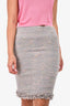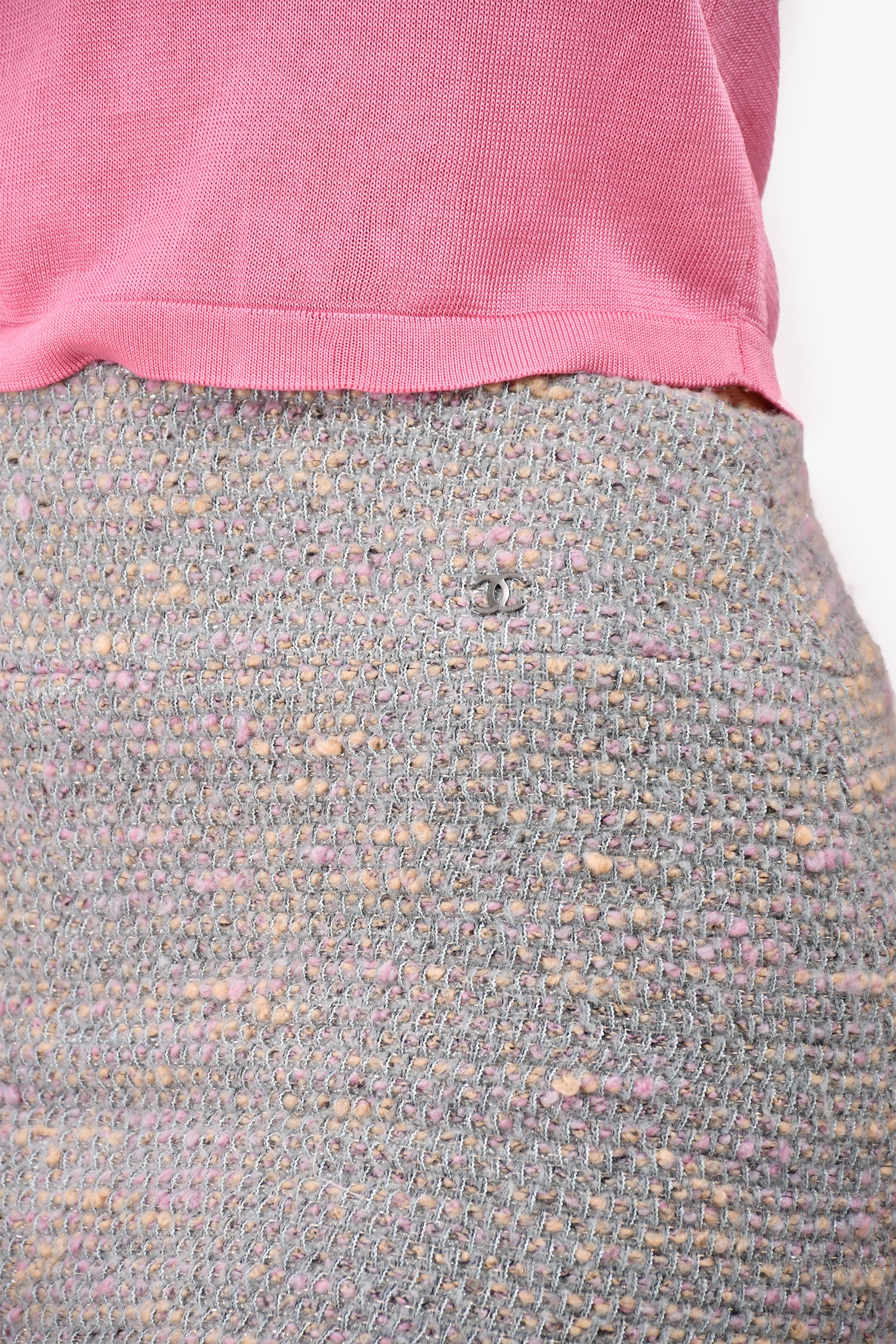 Refresh availabilityPre-Loved Chanel™ 2004 Grey/Purple Tweed CC Pencil Skirt. Silver-foil stitching. Back zipper.
