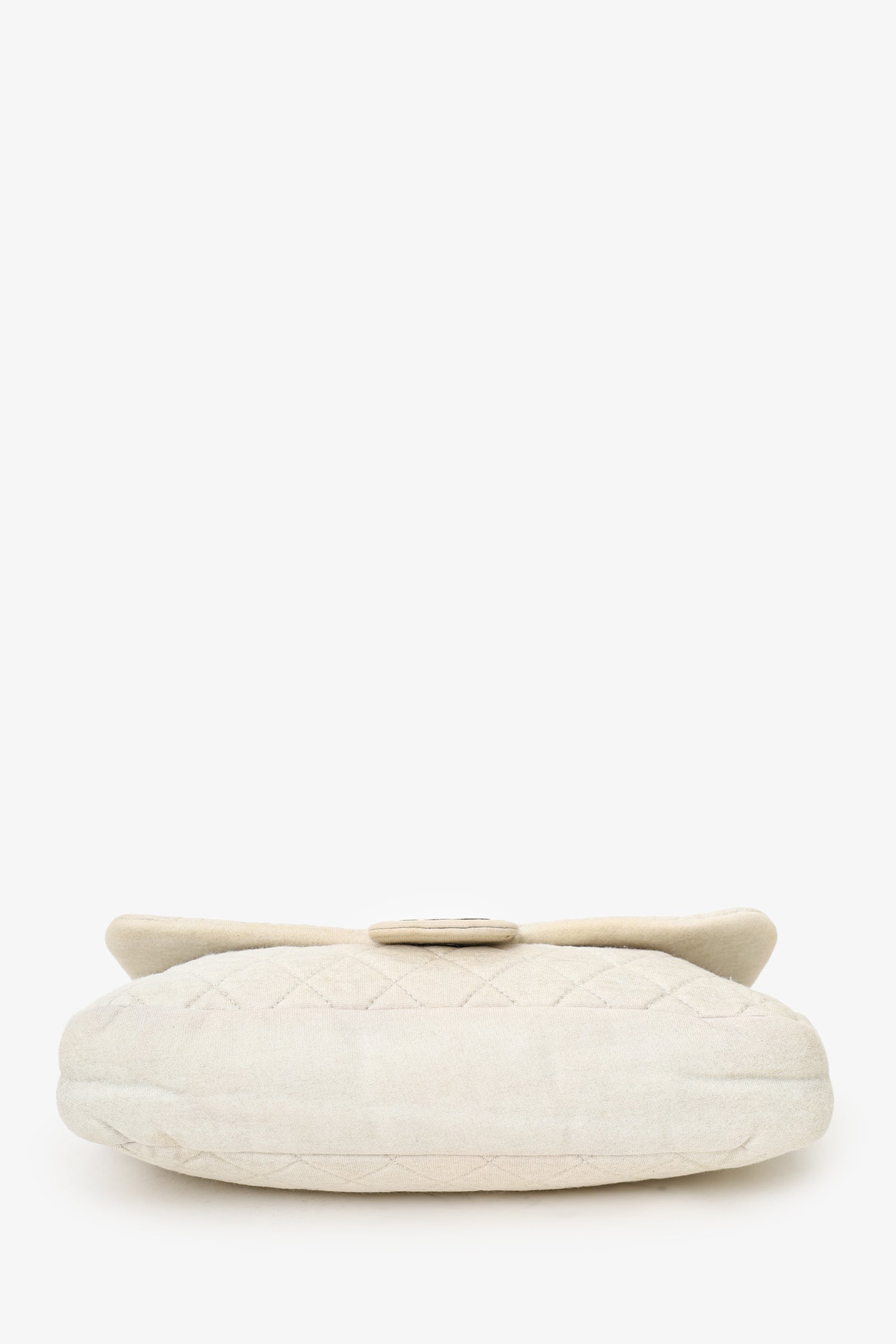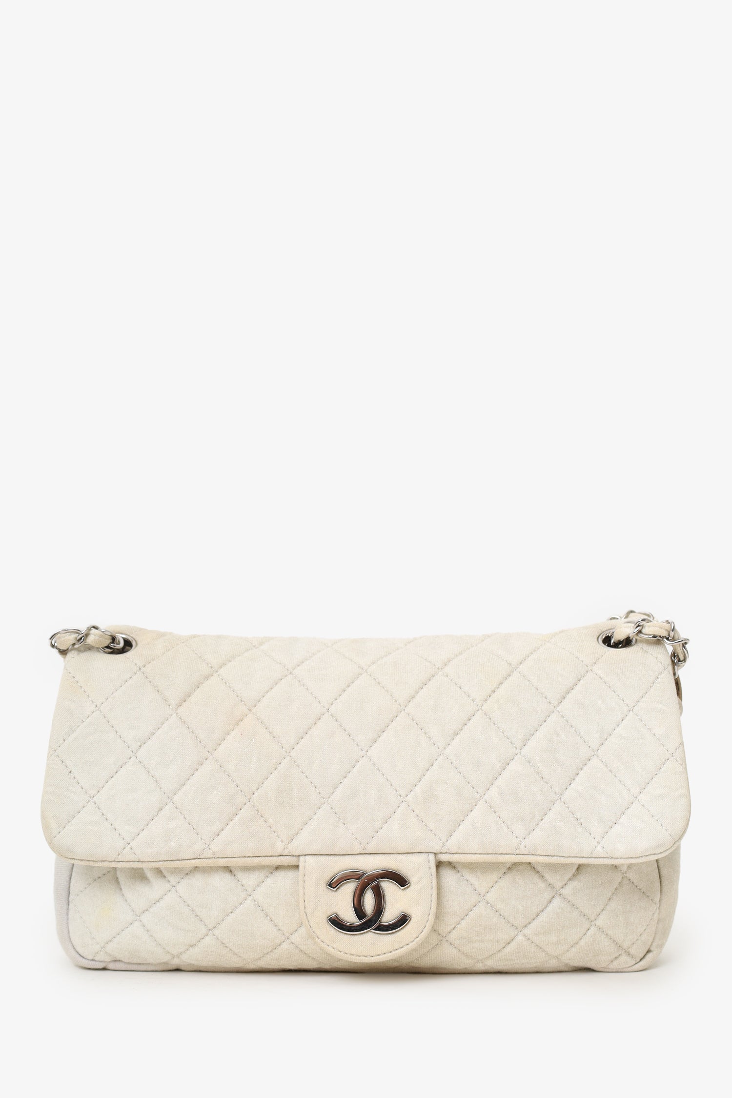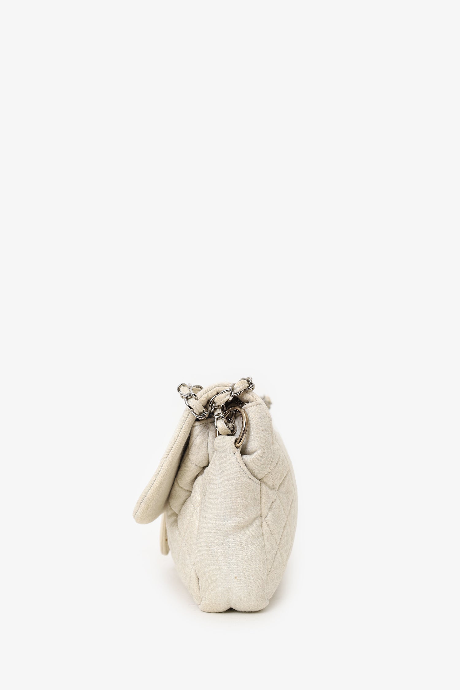 Refresh availabilityPre-Loved Chanel™ 2008-09 White/gold Quilted Jersey Cc Flap Bag. Front fold-over flap with magnetic closure. Dual chain-link shoulder straps that can be turned into one crossbody strap. Fabric-lined interior. Single rear wall zip pocket. Silver-tone hardware. Tonal stitching.