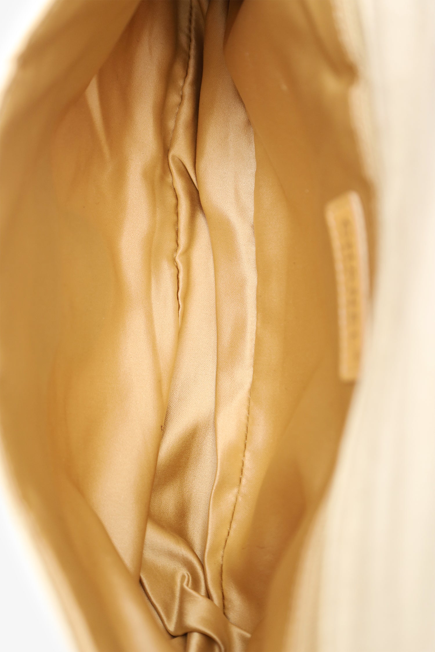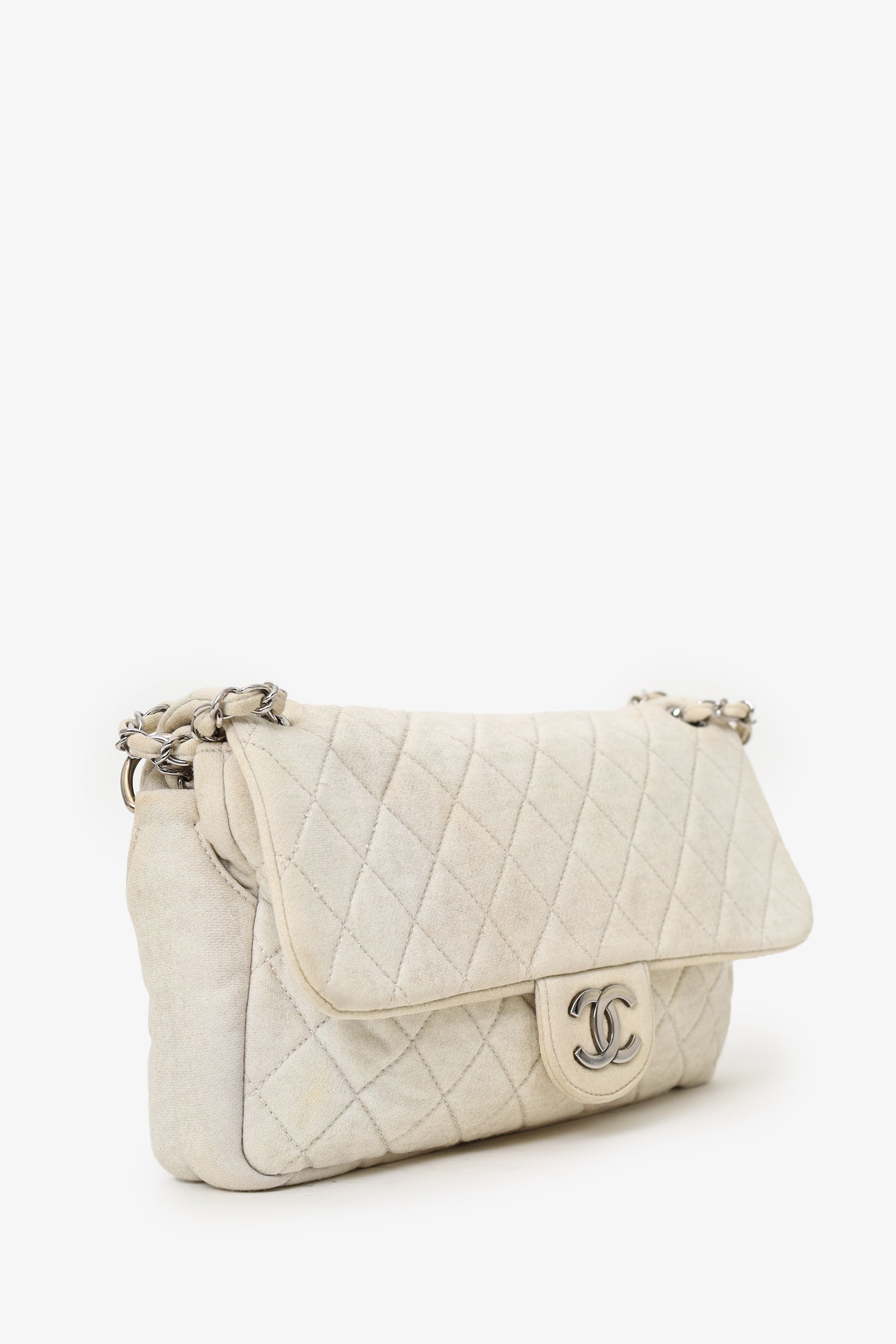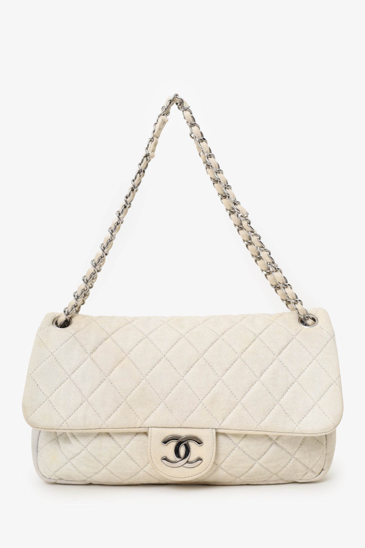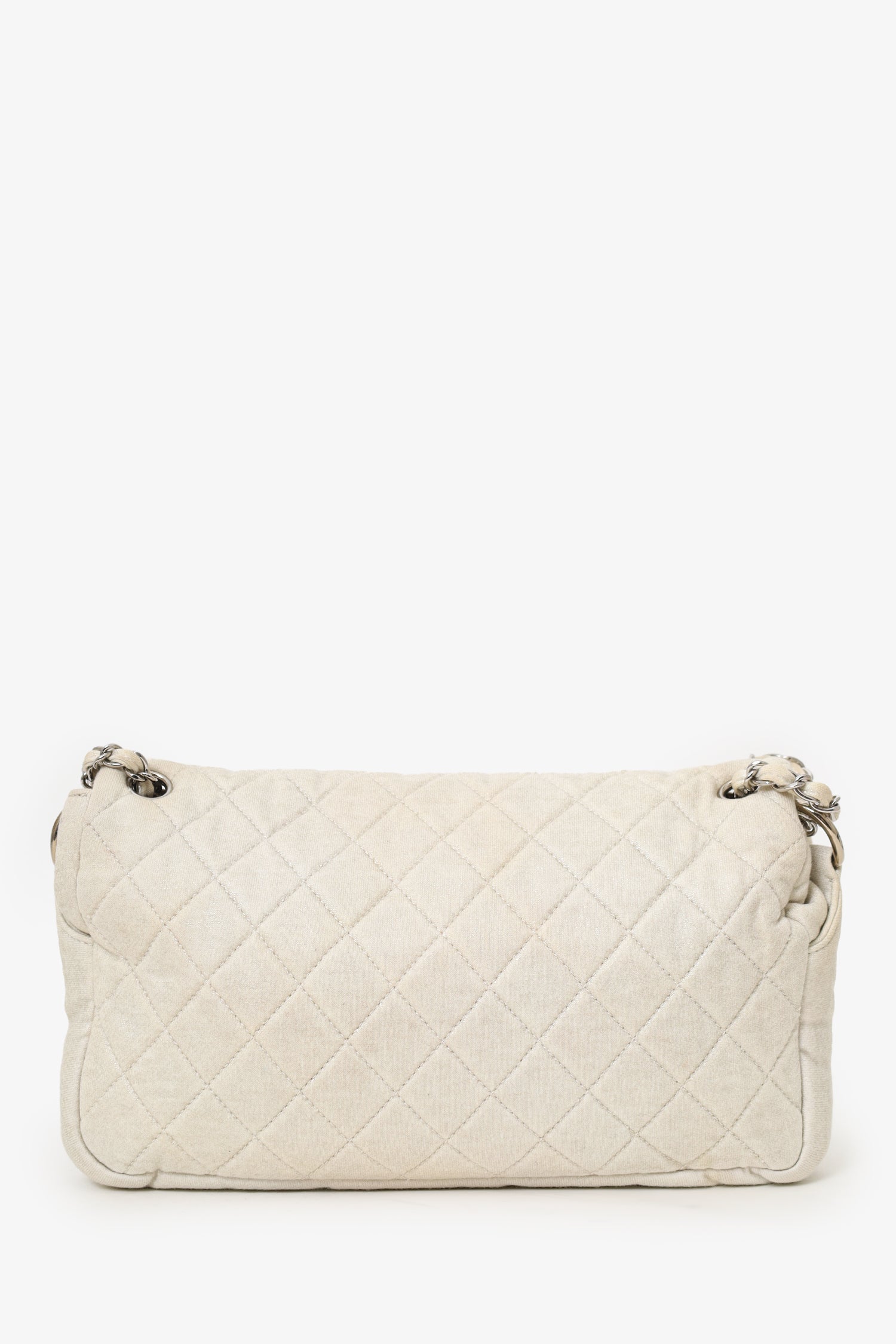 Refresh availabilityPre-Loved Chanel™ 2008-09 White/gold Quilted Jersey Cc Flap Bag. Front fold-over flap with magnetic closure. Dual chain-link shoulder straps that can be turned into one crossbody strap. Fabric-lined interior. Single rear wall zip pocket. Silver-tone hardware. Tonal stitching.
